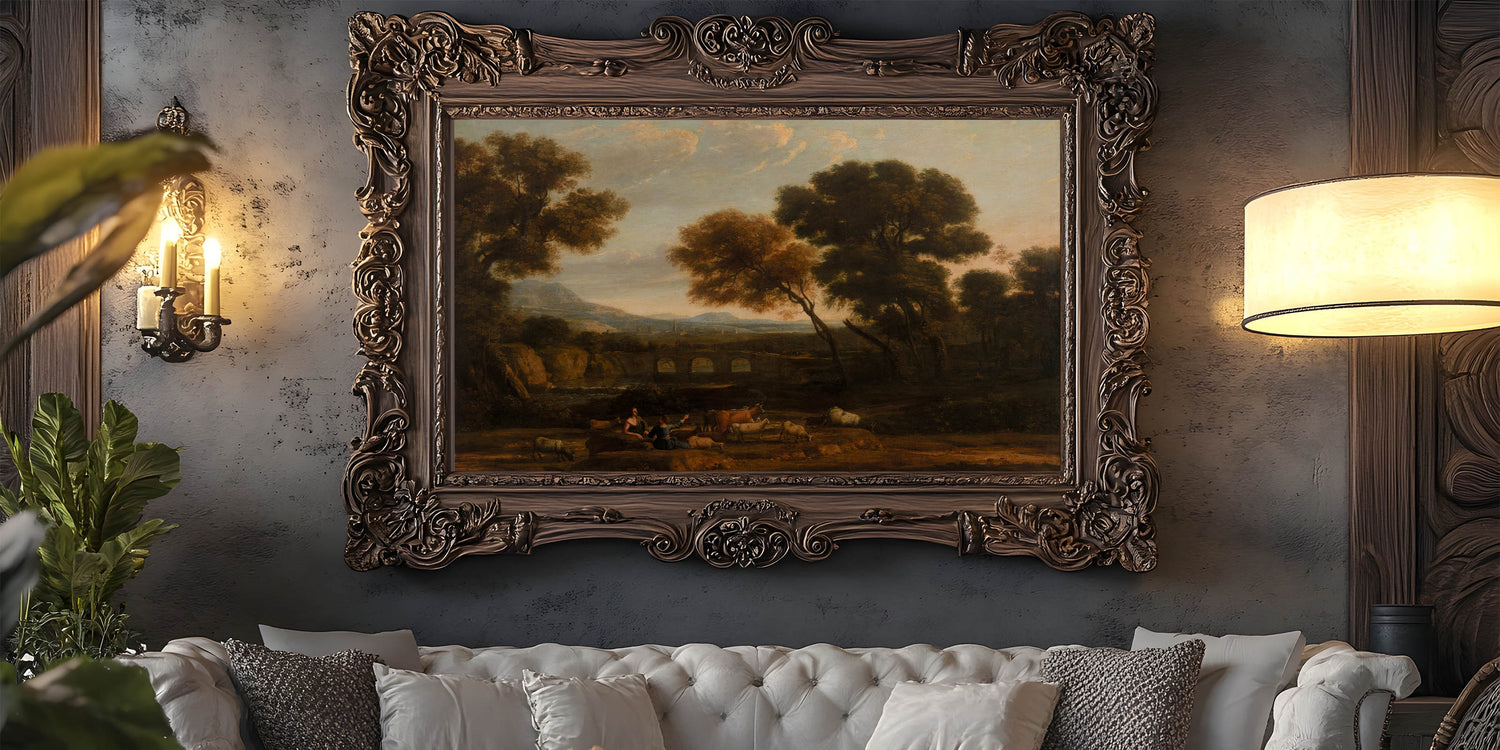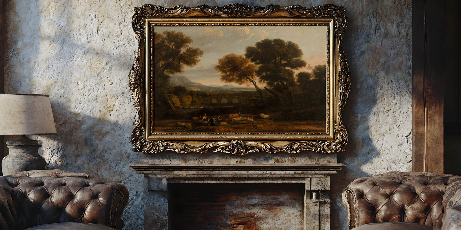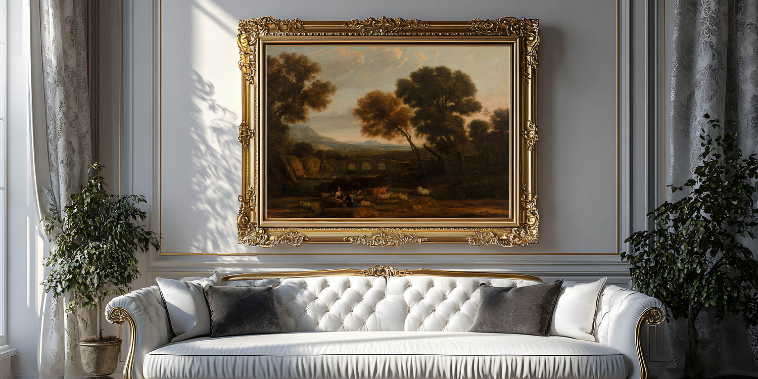 Transform your space with this stunning Baroque pastoral landscape art print. Featuring a tranquil countryside scene, this artwork showcases shepherds and their grazing flock amidst a serene landscape of lush trees, flowing rivers, and distant hills. The rich colors and intricate details evoke the peaceful beauty of rural life, capturing the timeless elegance of the Baroque period.