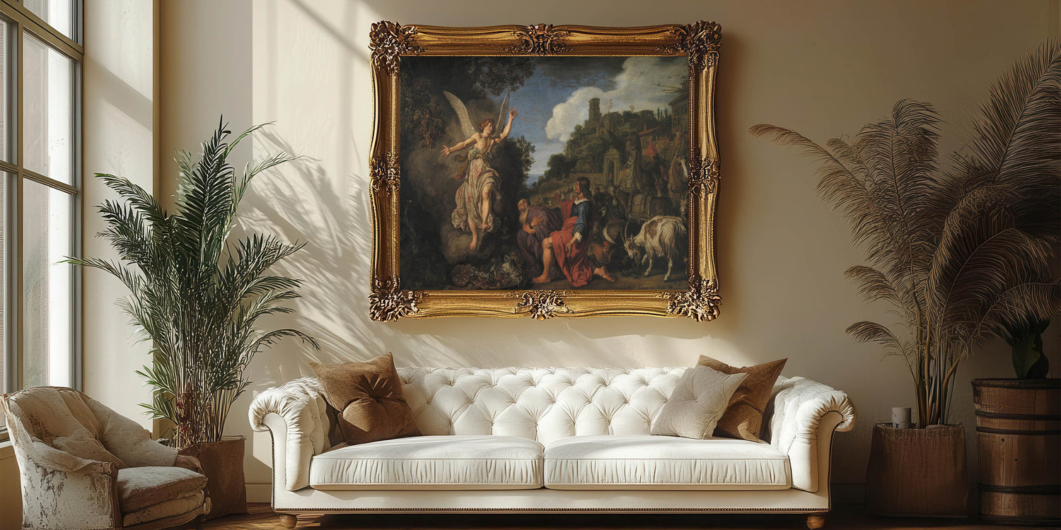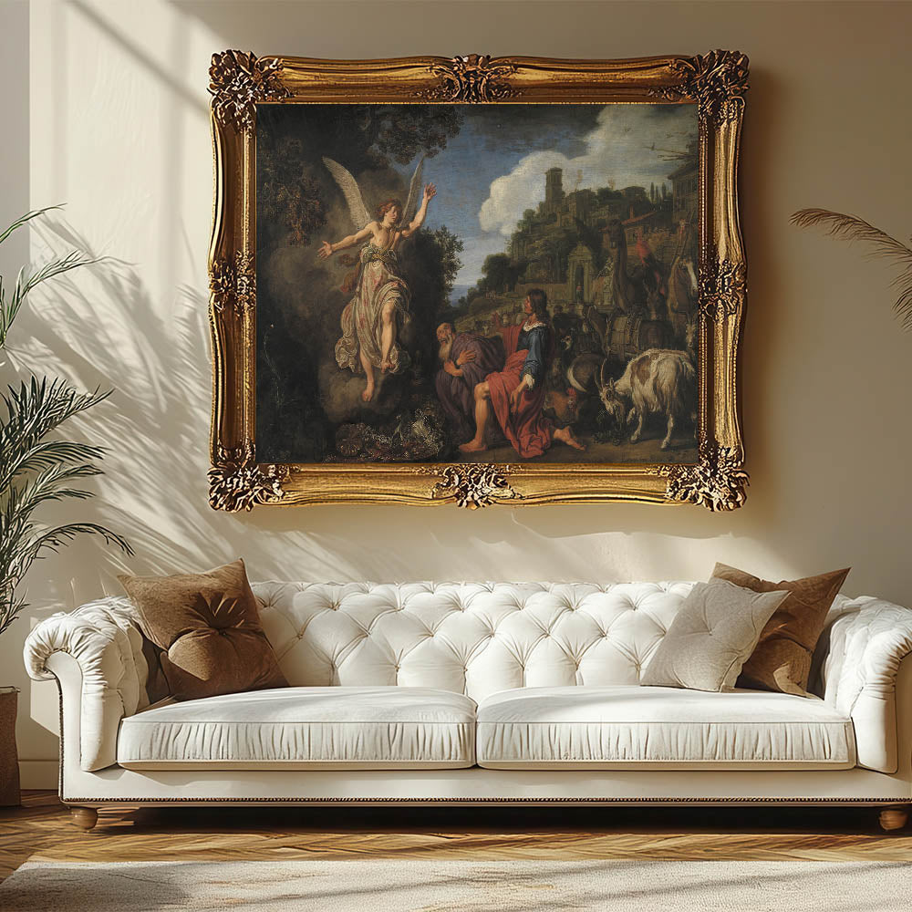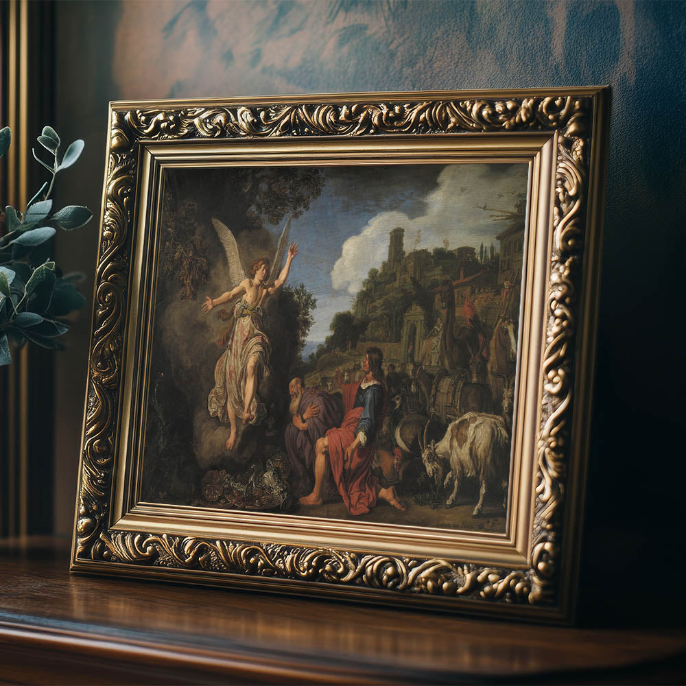 Bring the opulence and drama of Baroque art into your home with this stunning depiction of an angelic encounter. This masterpiece captures the intricate details, vivid contrasts, and emotional depth that define the Baroque period. Perfect for those who admire historical art and timeless artistic expression, this piece adds elegance and grandeur to any space.