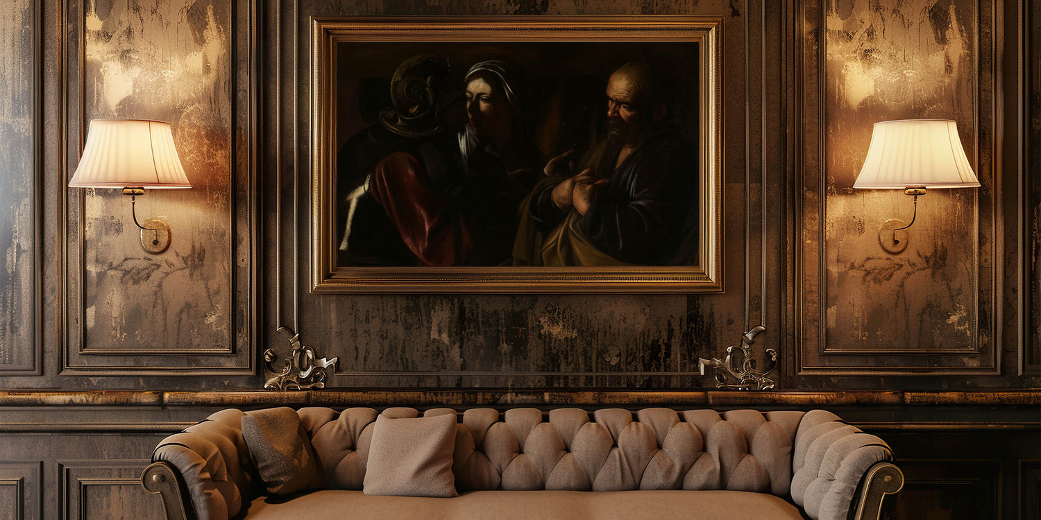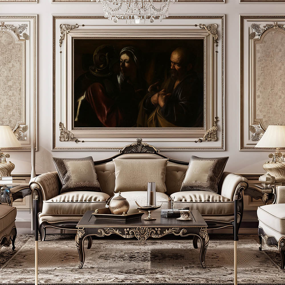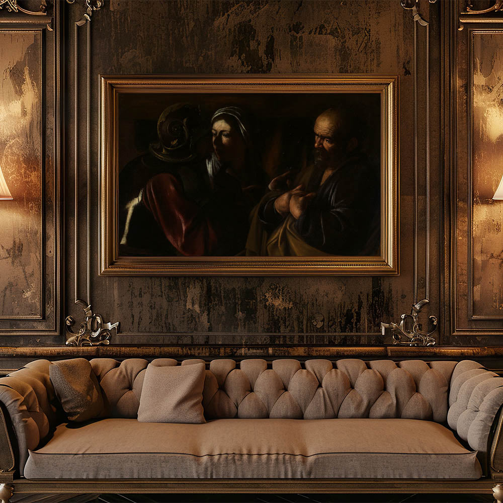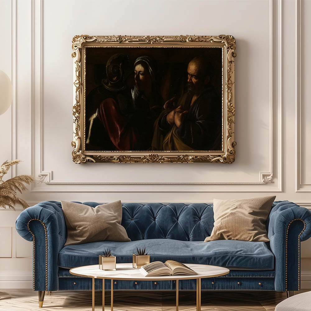 Discover the emotional depth and dramatic intensity of Baroque art with this stunning depiction of "The Denial of Saint Peter." This masterpiece captures a pivotal moment of human frailty and divine grace, using striking contrasts of light and shadow to emphasize the figures’ expressions and gestures. The skillful chiaroscuro draws the viewer into the intimate scene, making it a powerful addition to any collection of historical or sacred art.
