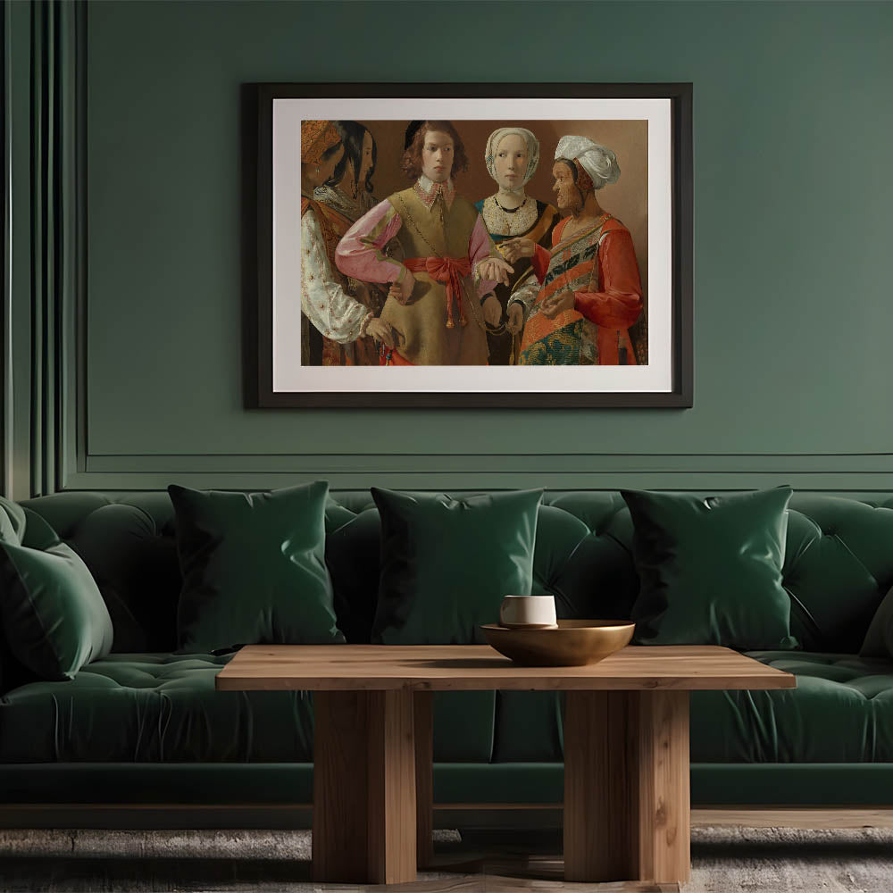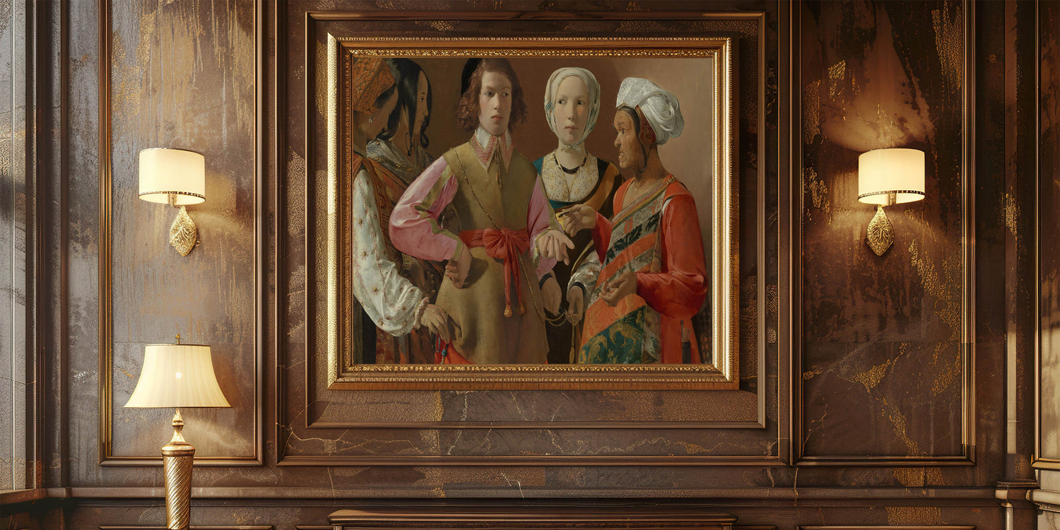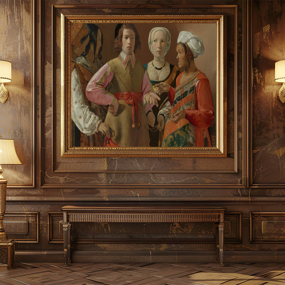 Step into the intrigue and elegance of Baroque art with "The Fortune Teller," a captivating scene that captures a moment of mystery and human connection. This artwork masterfully balances vivid textures, expressive faces, and intricate detailing, drawing the viewer into a richly narrative composition. The vibrant costumes and subtle interplay of light and shadow add depth to the piece, making it a standout example of Baroque artistry.