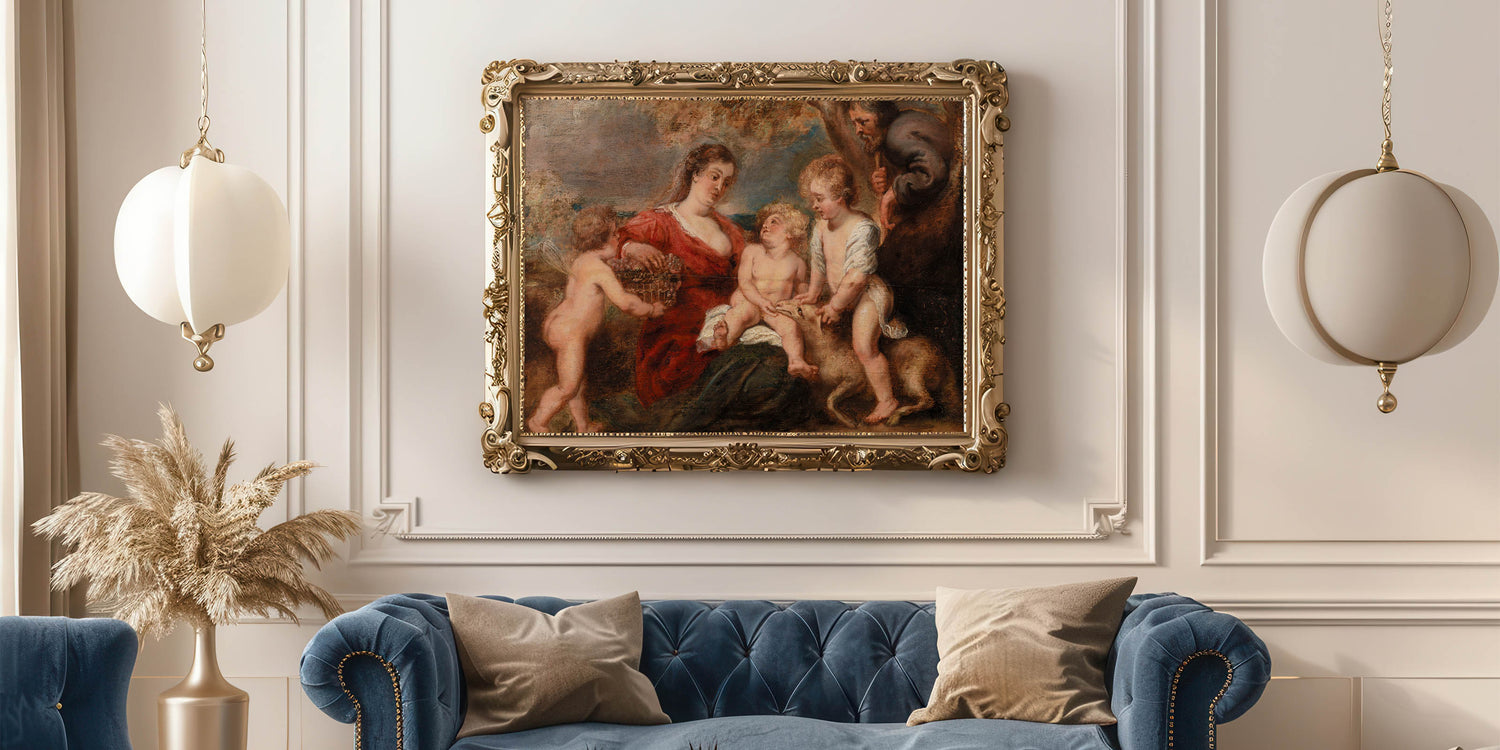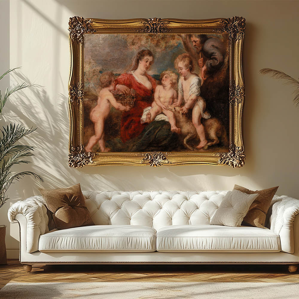 Experience the warmth and grace of Baroque art with "The Holy Family with Angels," a touching scene that celebrates love, innocence, and divine presence. This masterpiece beautifully captures the interaction between the Holy Family, cherubs, and symbolic elements of faith. The rich, earthy tones and delicate brushwork exemplify the artistic elegance and storytelling of the Baroque period, making it a timeless addition to any sacred or historical art collection.