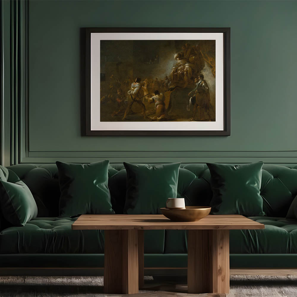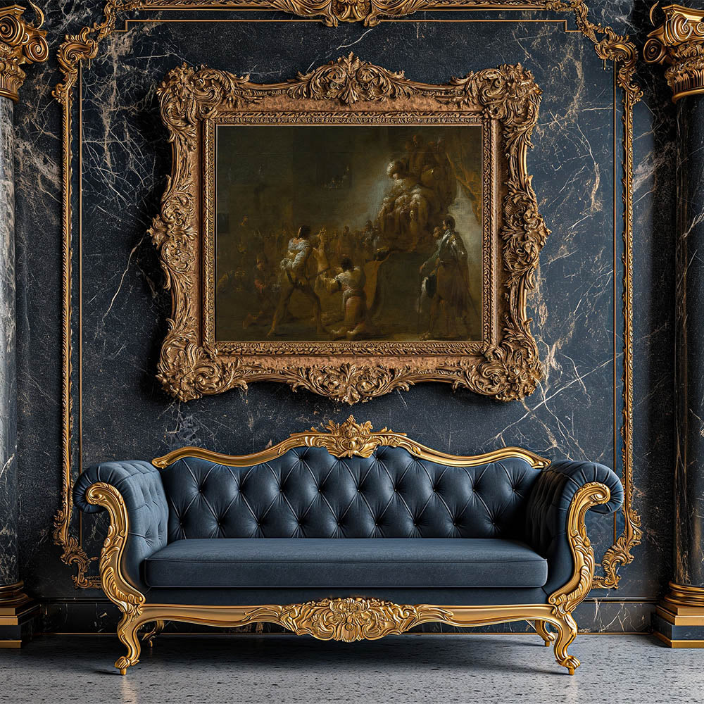 Step into the grandeur and intensity of Baroque art with "The Judgment of the King," a compelling depiction of a historic moment of power and fate. This masterpiece captures a dramatic scene illuminated by the interplay of light and shadow, emphasizing the authority of the enthroned monarch and the desperation of those pleading before him. The subdued palette and dynamic composition highlight the tension and gravity of the moment, showcasing the emotional depth and artistic brilliance of the Baroque period.