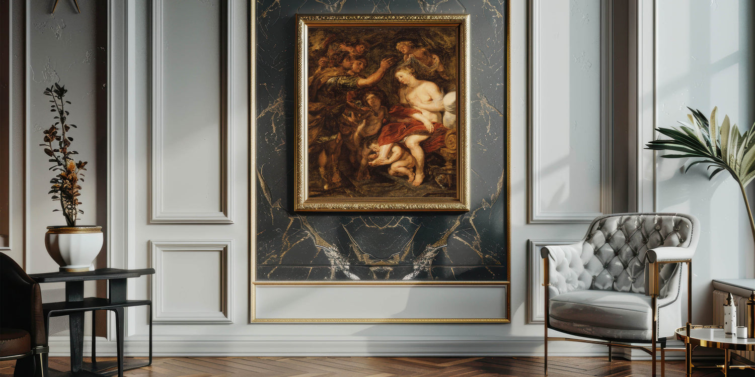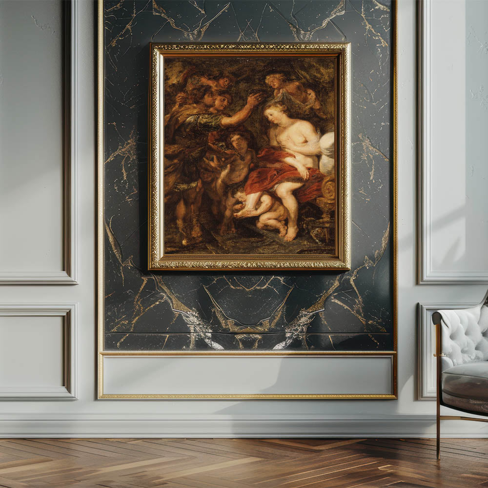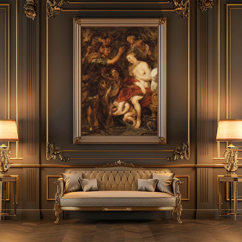 Celebrate the sensual beauty and grandeur of Baroque art with this exquisite depiction of "Venus Crowned by Cupid." This masterpiece portrays the goddess of love surrounded by cherubs and celestial figures in an atmosphere of opulence and elegance. The rich tones, dynamic movement, and intricate textures characteristic of Baroque art make this piece a captivating addition to any historical or artistic collection.