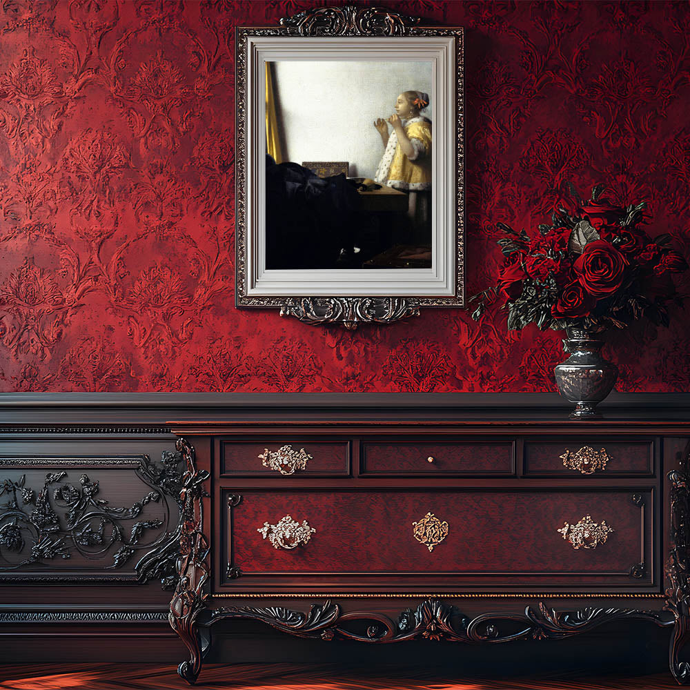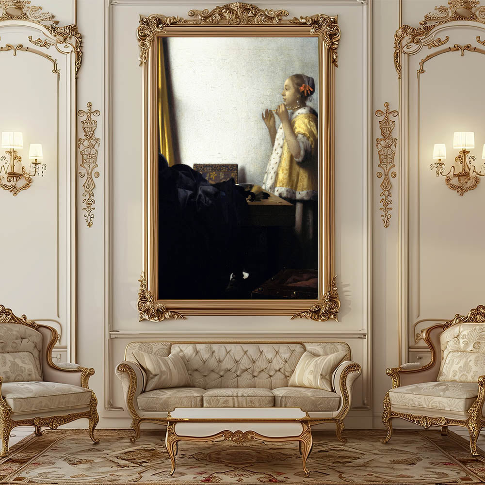 Introduce timeless elegance to your space with this exquisite Baroque art piece, "Elegant Lady with Jewelry." This artwork captures the refined grace and intricate details of Baroque designs, showcasing a serene woman adorning herself with jewelry. With its dramatic use of light and shadow, this piece is a perfect example of Detailed Baroque Designs and Artistic Elegance.
