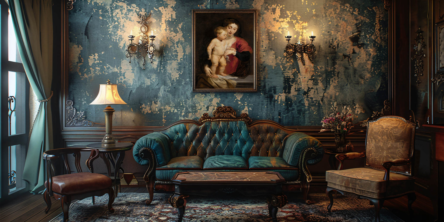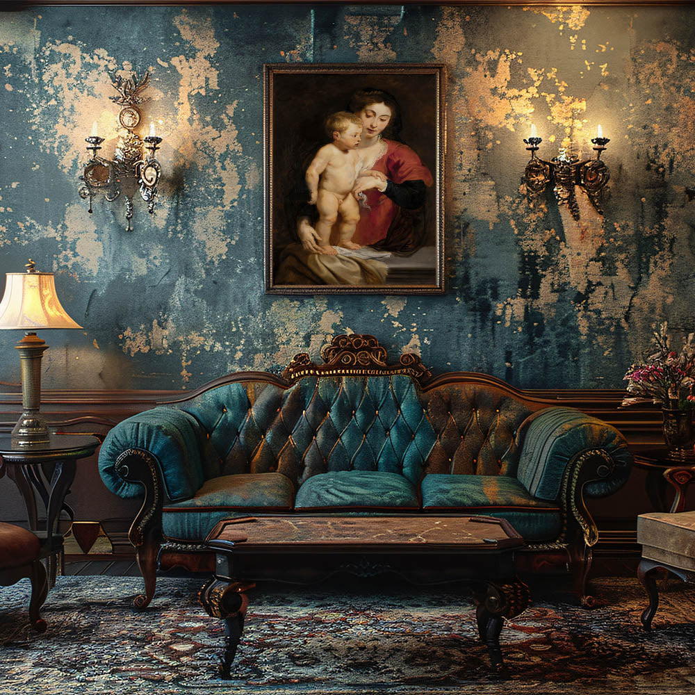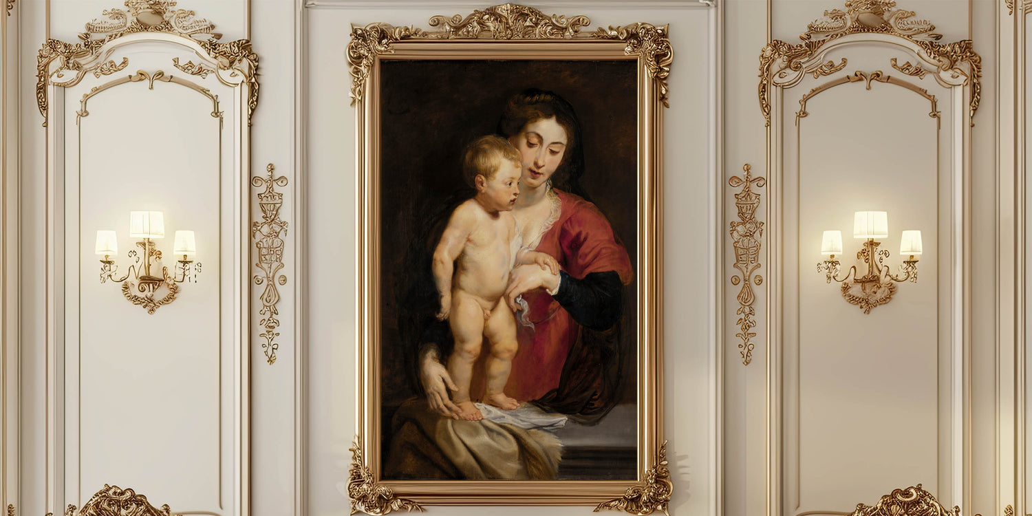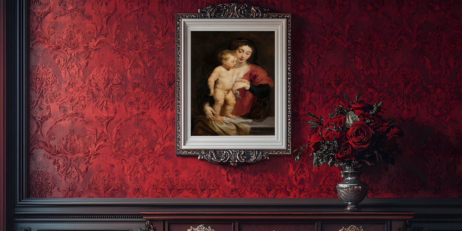 - Classic Baroque portrait of Madonna and Child, rich in detail and emotion