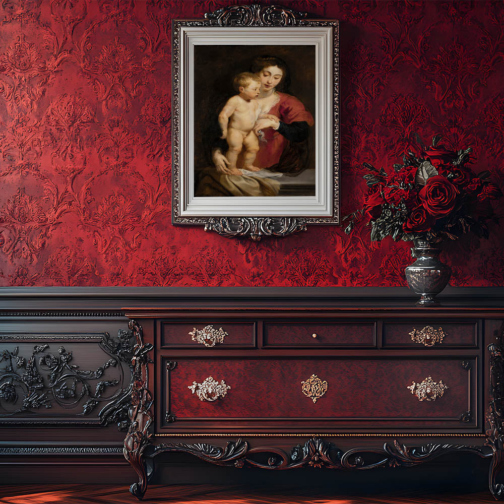 Celebrate the timeless elegance of Baroque artistry with this stunning portrait of the Madonna and Child. This masterpiece captures the tender bond between mother and child, expressed through soft brushstrokes, lifelike details, and the warm glow of Baroque light. The Madonna's deep red garment and serene expression contrast beautifully with the child's cherubic features, embodying both devotion and artistic brilliance.