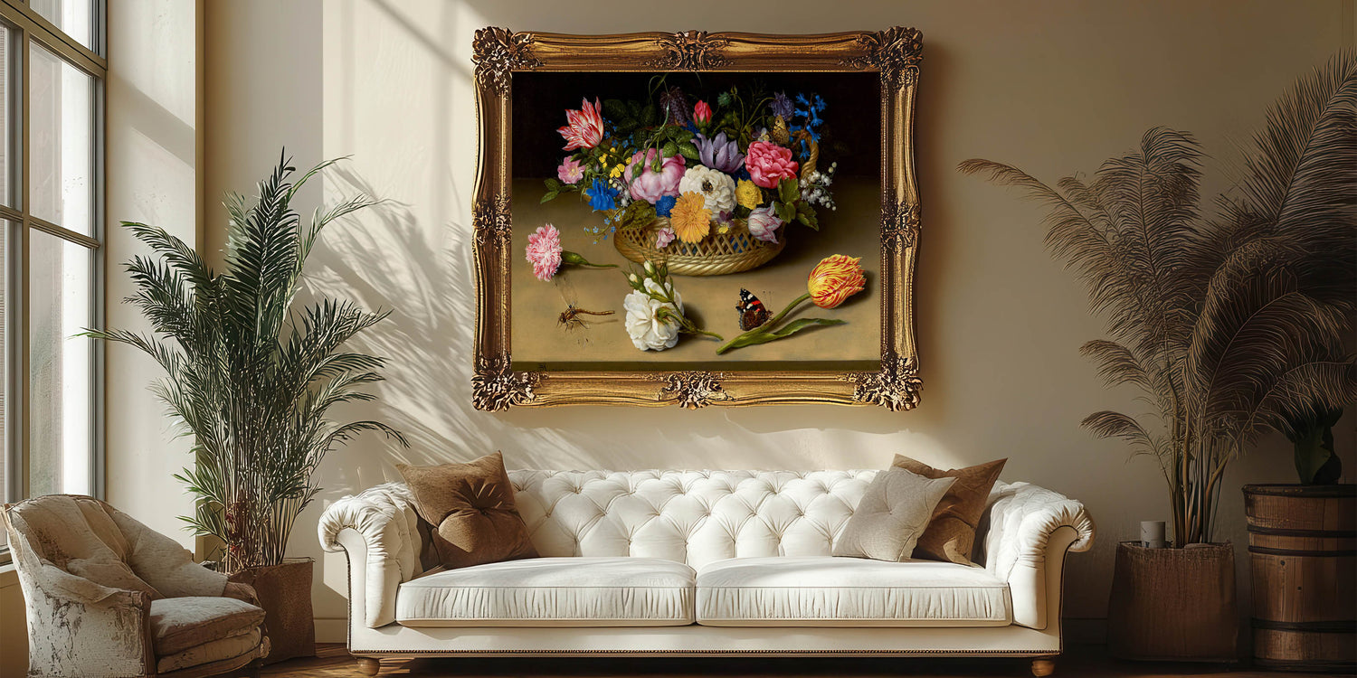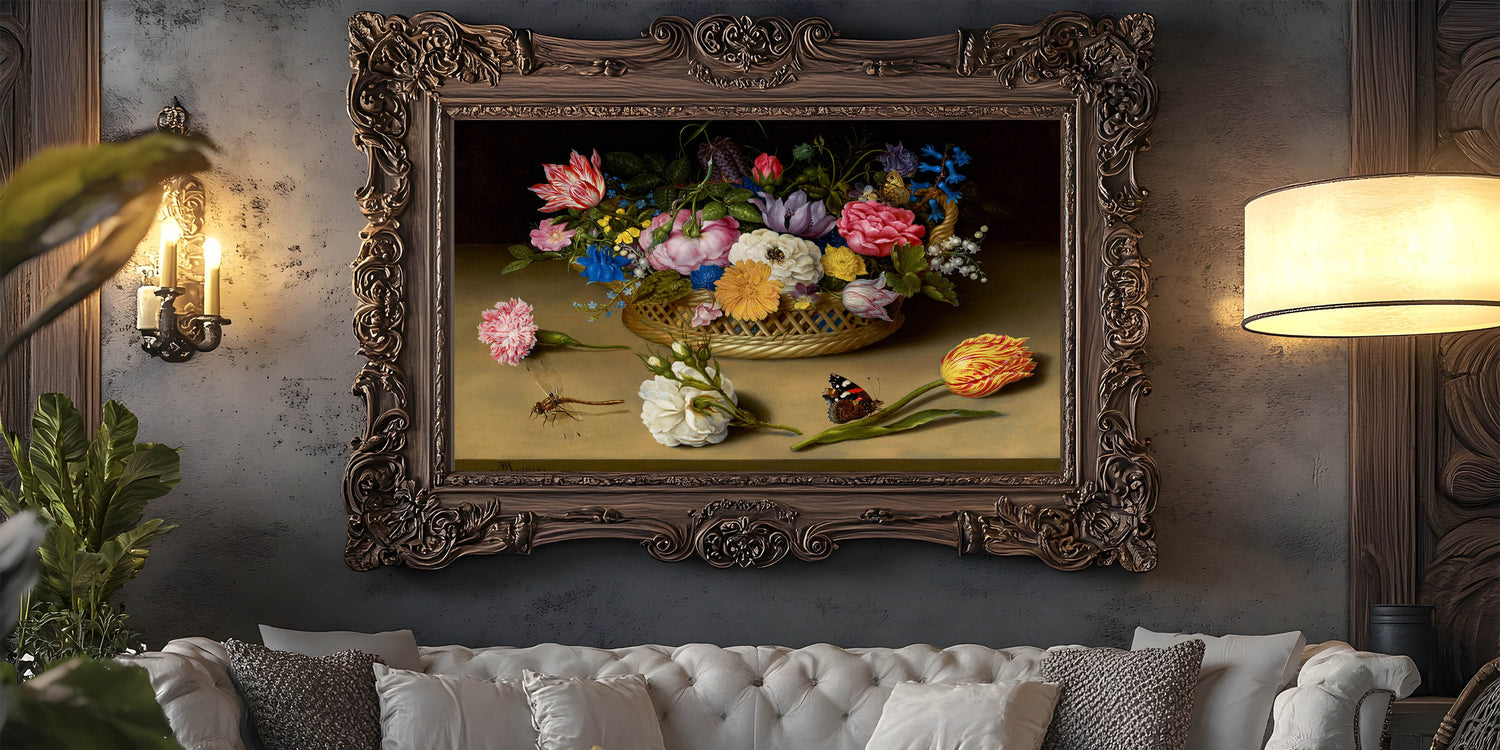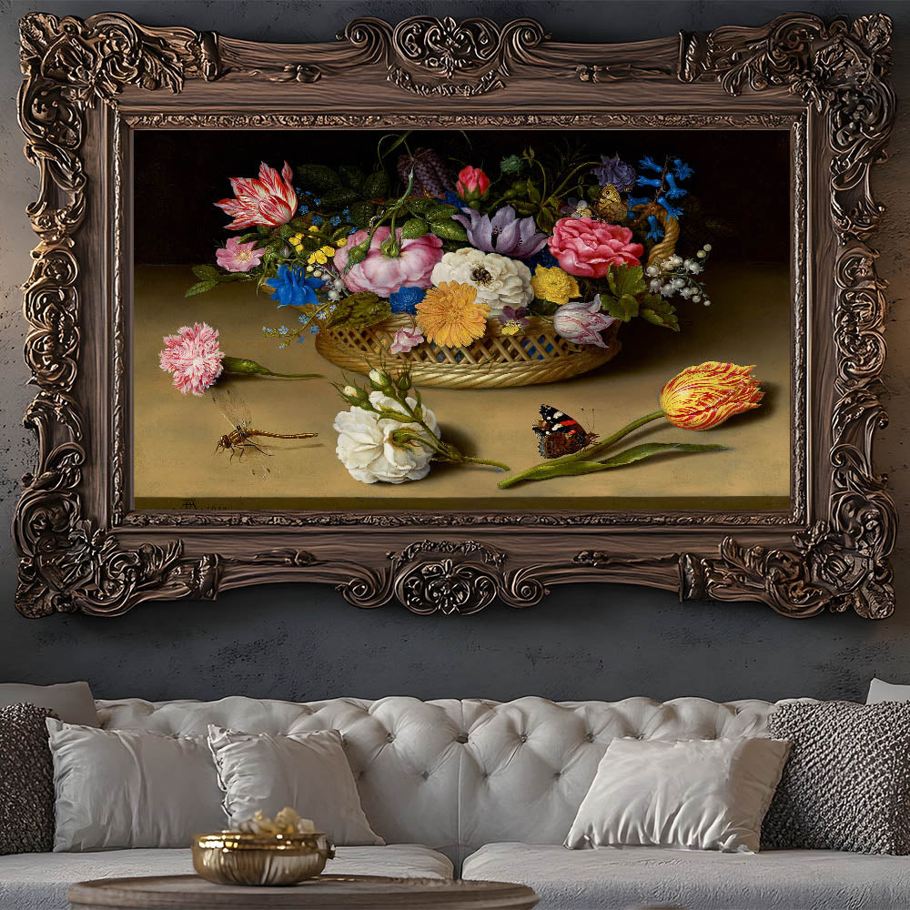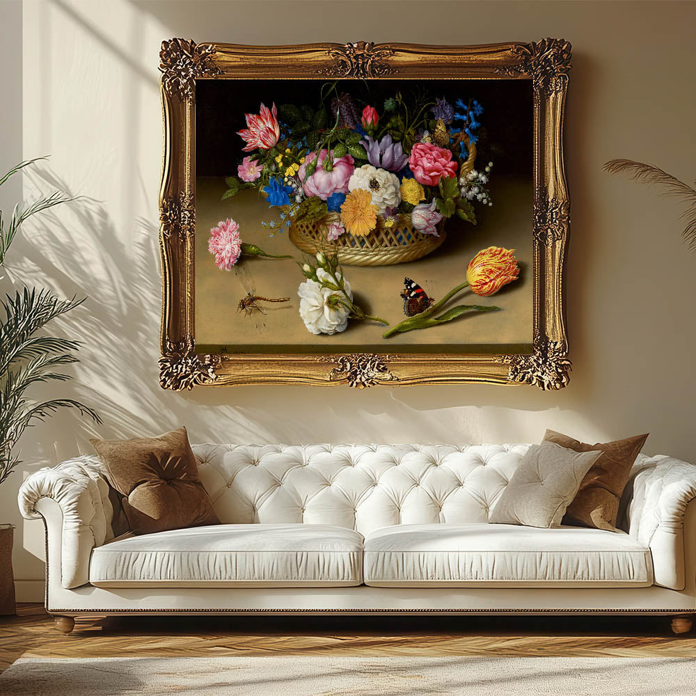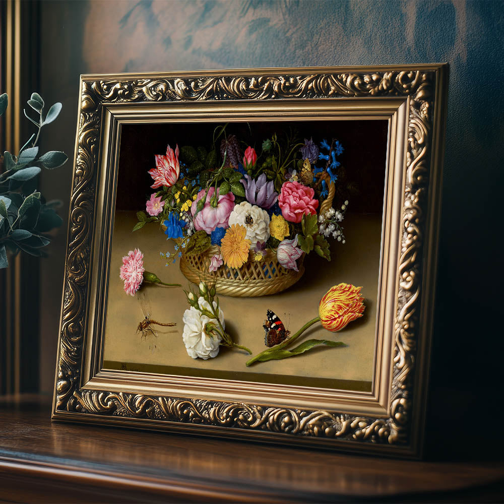 Experience the beauty and delicacy of Baroque still-life art with this masterful floral composition. The artwork features an elegant basket overflowing with vibrant blooms, including roses, tulips, daisies, and bluebells, surrounded by delicate butterflies, bees, and a dragonfly. The lifelike details and dramatic contrast against the muted background bring a sense of harmony and realism that is emblematic of detailed Baroque designs.