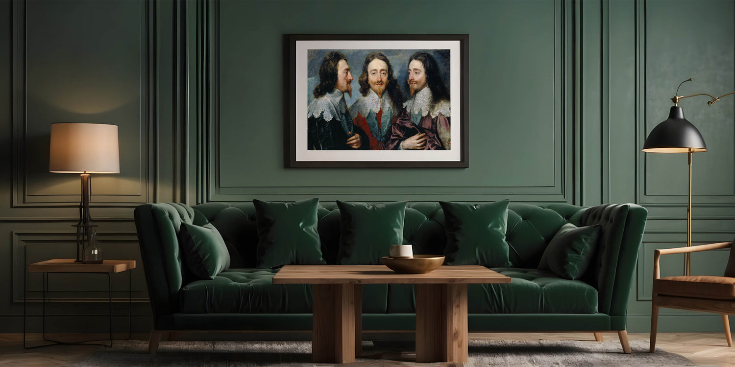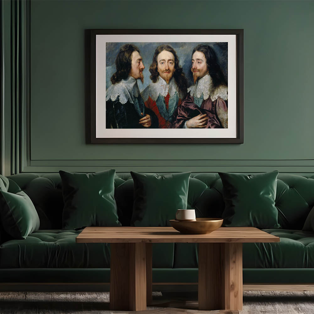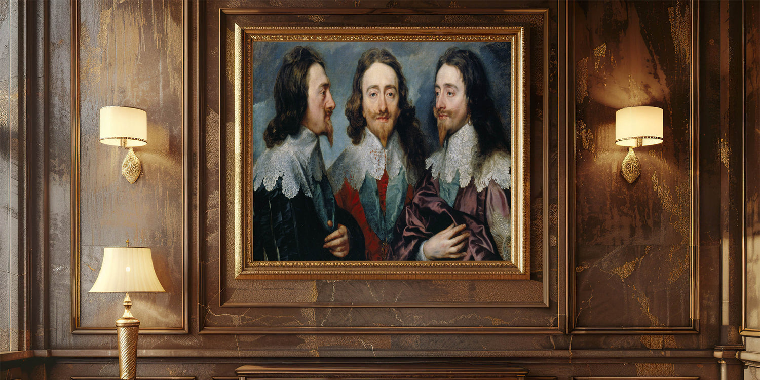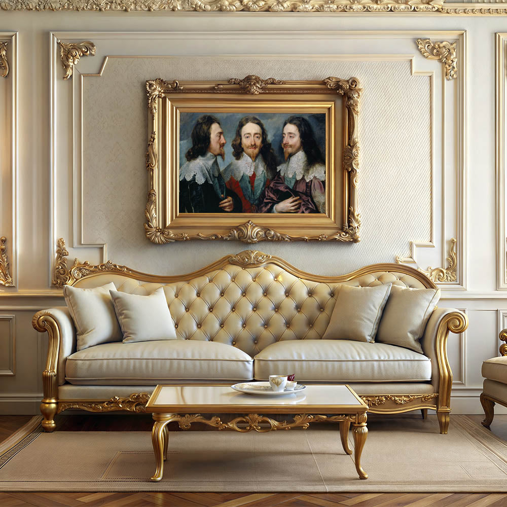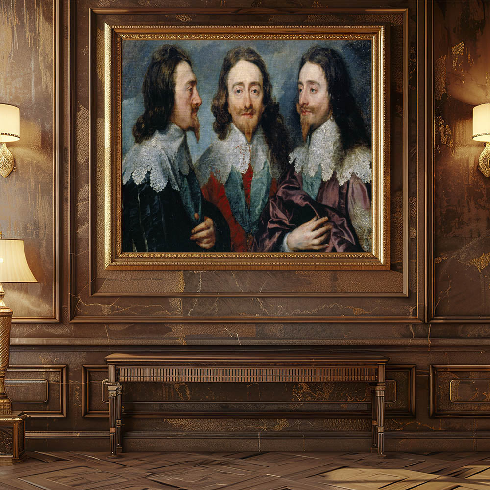 Experience the intricate craftsmanship of Baroque art with this remarkable triple portrait. This masterpiece showcases a regal figure from three perspectives, emphasizing the artistic ingenuity and attention to detail that define the Baroque period. The rich textures, ornate lace details, and vibrant colors combine to create a striking composition that adds timeless elegance to any space.
