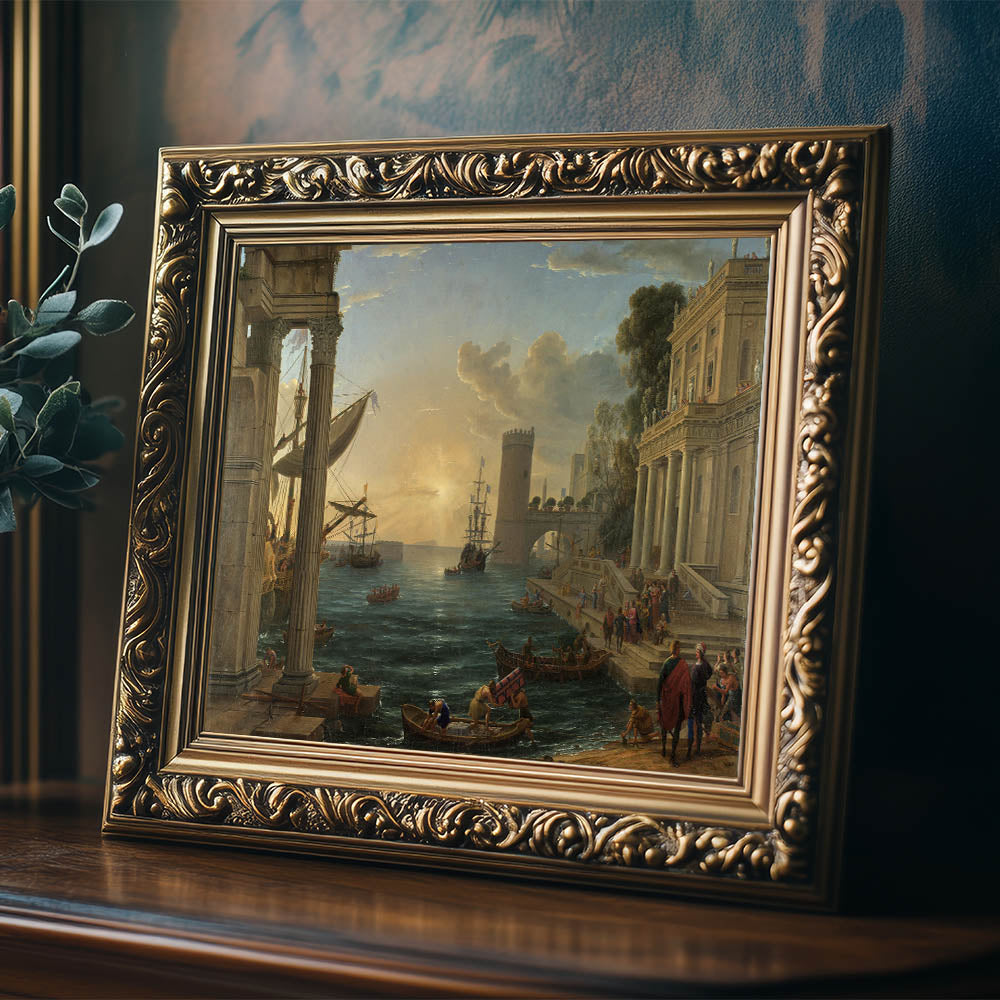 This breathtaking Baroque painting captures a bustling harbor at sunset, showcasing the timeless elegance and artistic mastery of the Baroque period. The intricate details of the ships, grand architecture, and lively figures bring historical grandeur to life. Ideal for lovers of classic art, this piece enhances any home with its rich depiction of a historical waterfront.