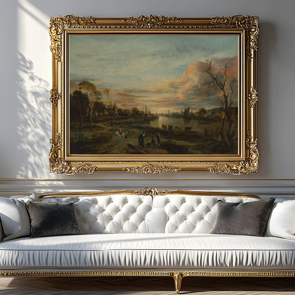 Bring the beauty of Baroque artistry to your space with this serene landscape art print. Featuring a tranquil river scene at sunset, this piece blends soft, warm tones with vivid details of trees, figures, and rustic countryside life. The delicate brushwork and dramatic sky evoke a sense of calm and timeless artistic elegance, making it perfect for lovers of Baroque landscapes.