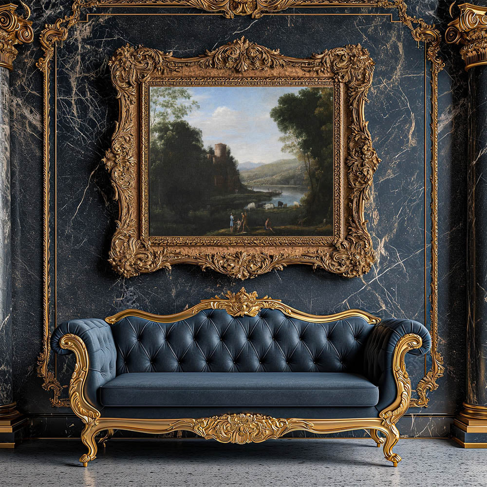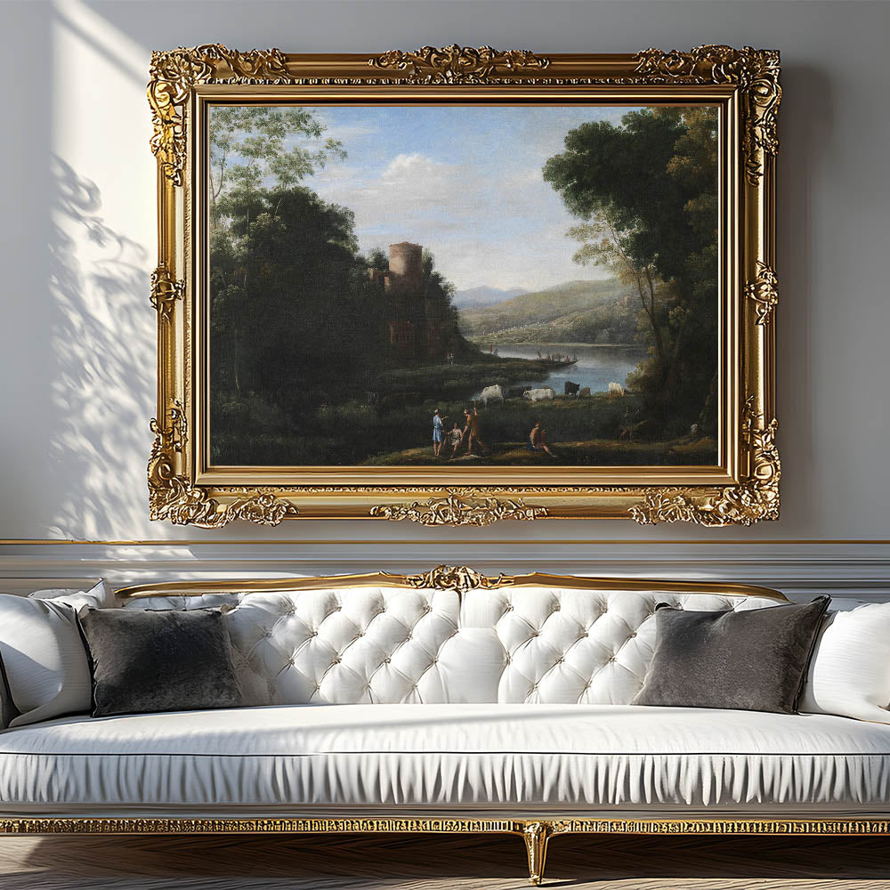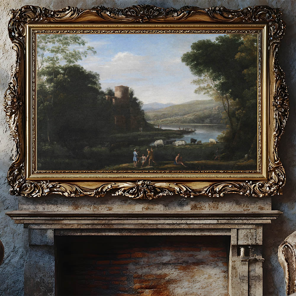 Transform your home with this exquisite Baroque landscape wall art, capturing the timeless beauty of serene countryside life. This artwork features lush greenery, a tranquil river, grazing cattle, and figures engaged in daily activities, all set against a distant mountainous backdrop. The centerpiece of this masterpiece is a rustic stone tower perched on a hill, adding a historical charm that reflects the elegance of the Baroque period.