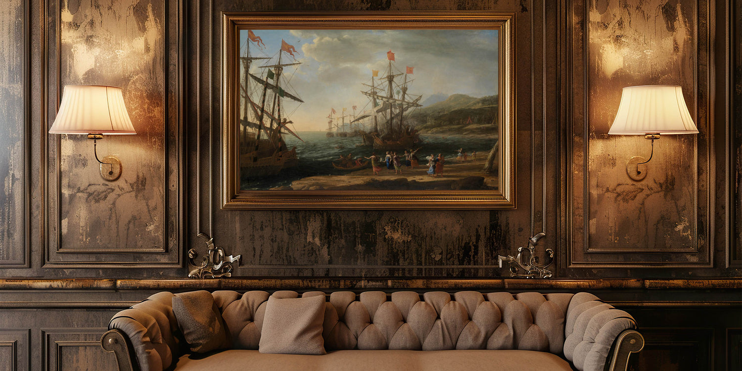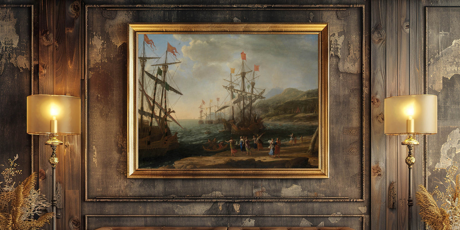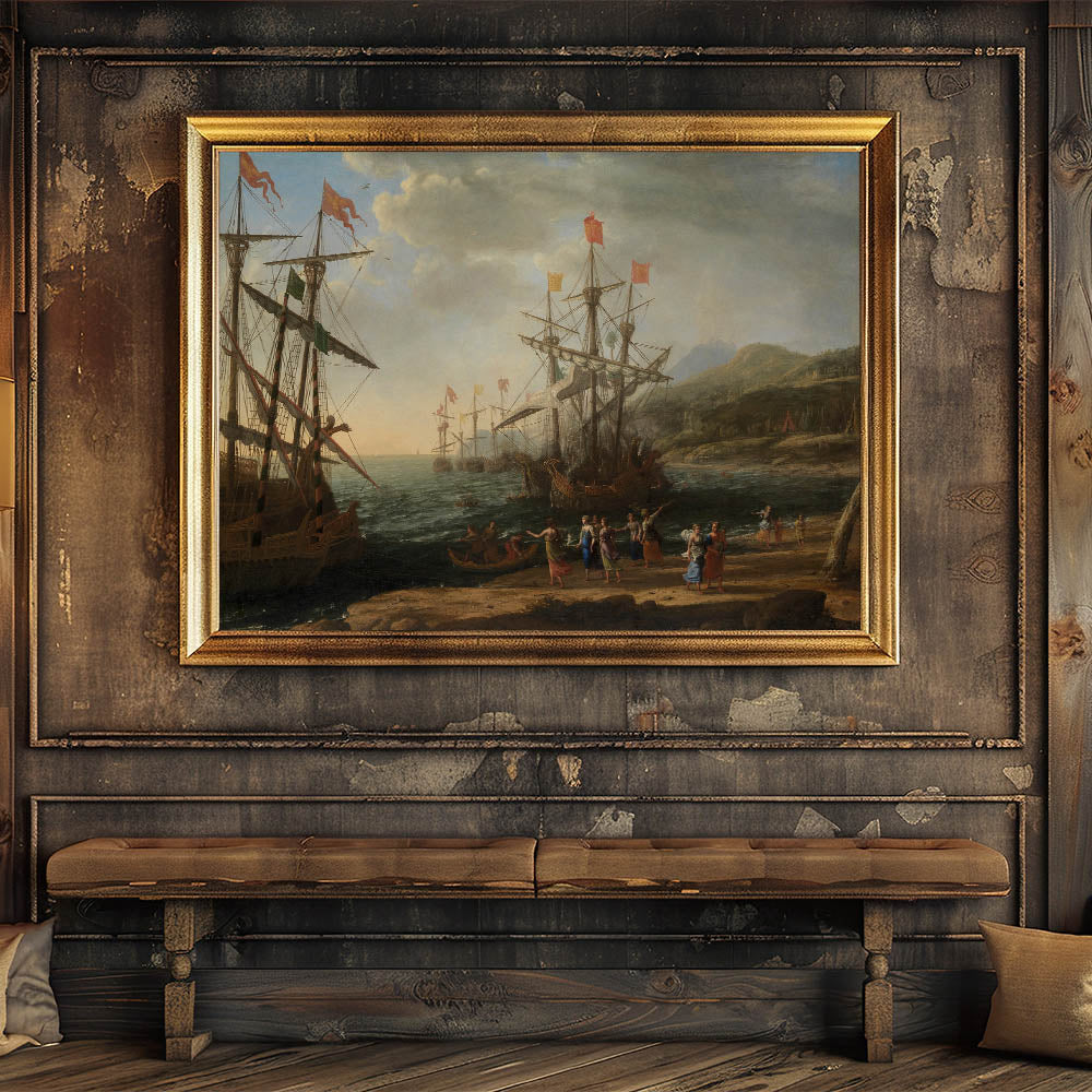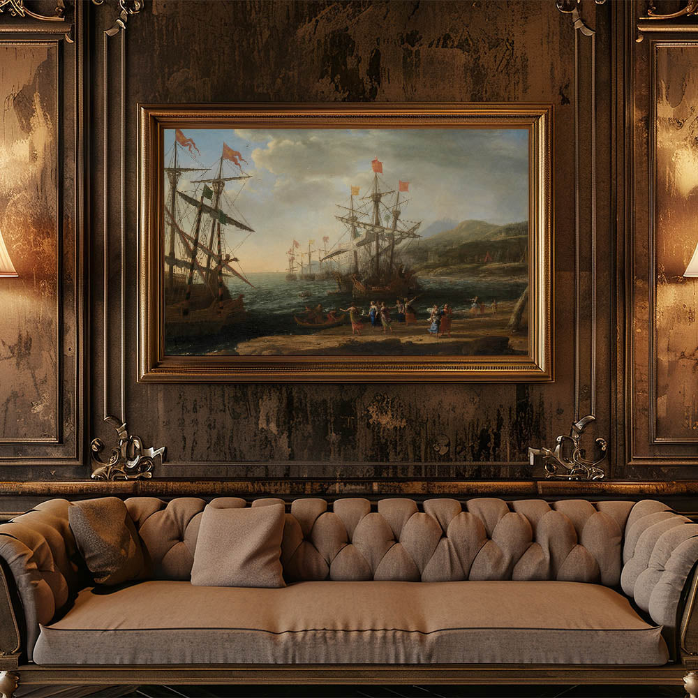 Experience the timeless elegance of Baroque art with this stunning maritime scene, capturing the spirit of adventure and exploration. This painting features majestic ships with intricate rigging and colorful flags, set against a backdrop of a serene seascape and rolling hills. The attention to detail, from the ships' craftsmanship to the figures onshore, showcases the artist's mastery of period art collections. The soft interplay of light and shadow reflects the timeless artistic expression of the Baroque era, evoking a sense of movement and grandeur.