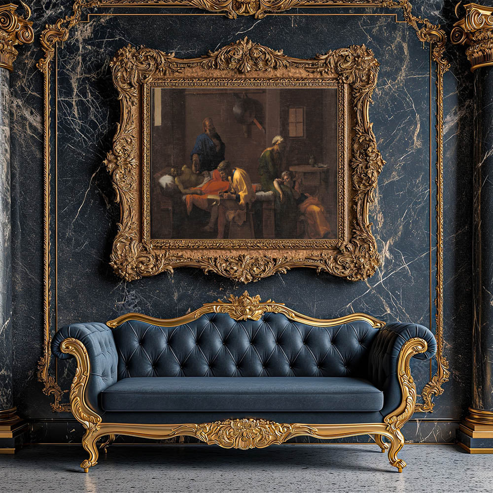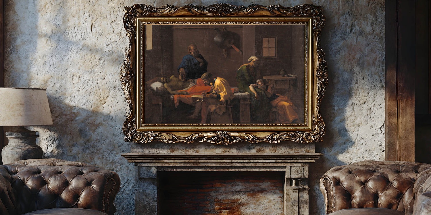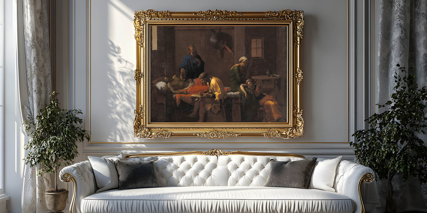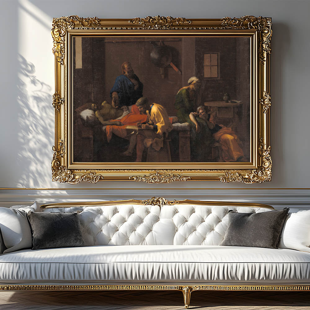 Step into the somber yet profound world of Baroque art with this emotional portrayal of a mourning scene. This masterful composition captures the quiet sorrow of a family gathered around a loved one, with dramatic lighting emphasizing the humanity and depth of the moment. The muted tones, vibrant drapery, and carefully balanced figures embody the timeless artistic expression that defines period art collections.