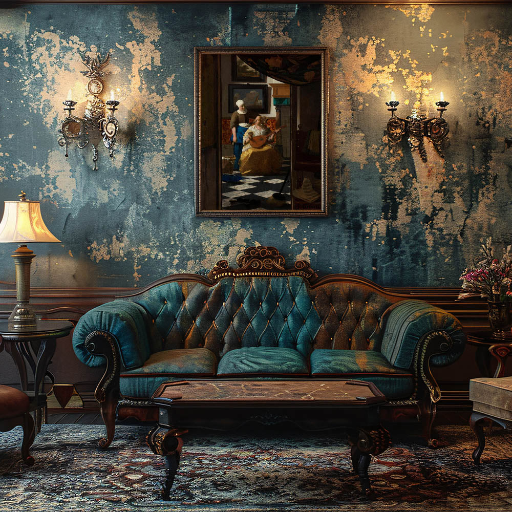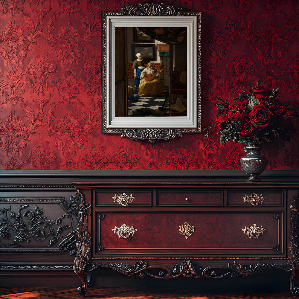 Add timeless charm to your space with this Baroque-inspired wall art showcasing an elegant indoor scene. This artwork captures a musical moment with a lute player seated gracefully, accompanied by a servant, against a backdrop of intricate patterns, ornate furnishings, and warm light filtering through the room. The interplay of light and shadow brings depth and emotion to the scene, a hallmark of Baroque artistry.