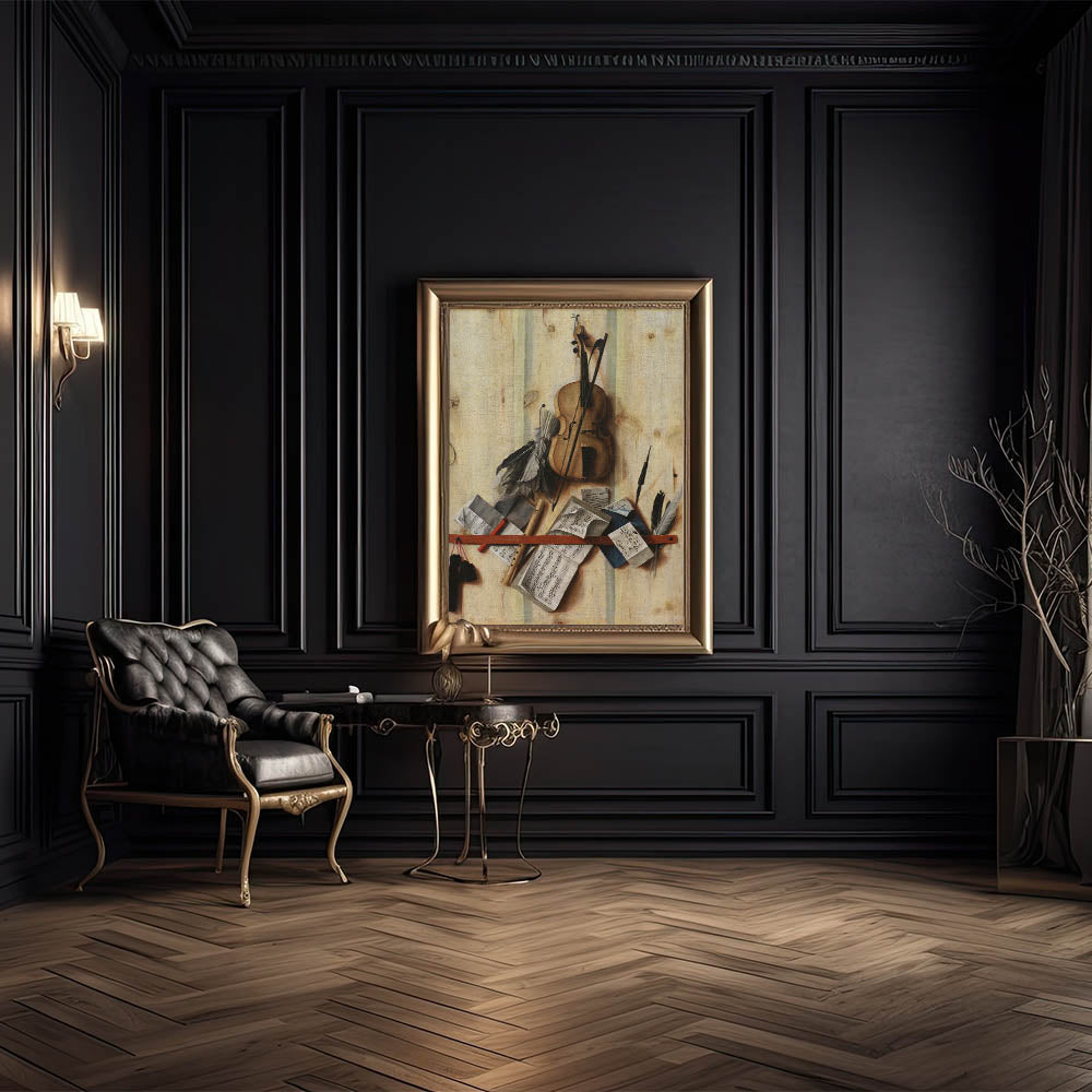 The warm beige tones and soft interplay of light and shadow highlight the meticulous detailing, making this piece a stunning representation of period art collections. This still life serves as both a tribute to the art of music and an exquisite decorative piece for any home or office.This classic art print is ideal for music enthusiasts and art lovers alike. Let this stunning piece bring a sense of refinement and artistry to your collection.
