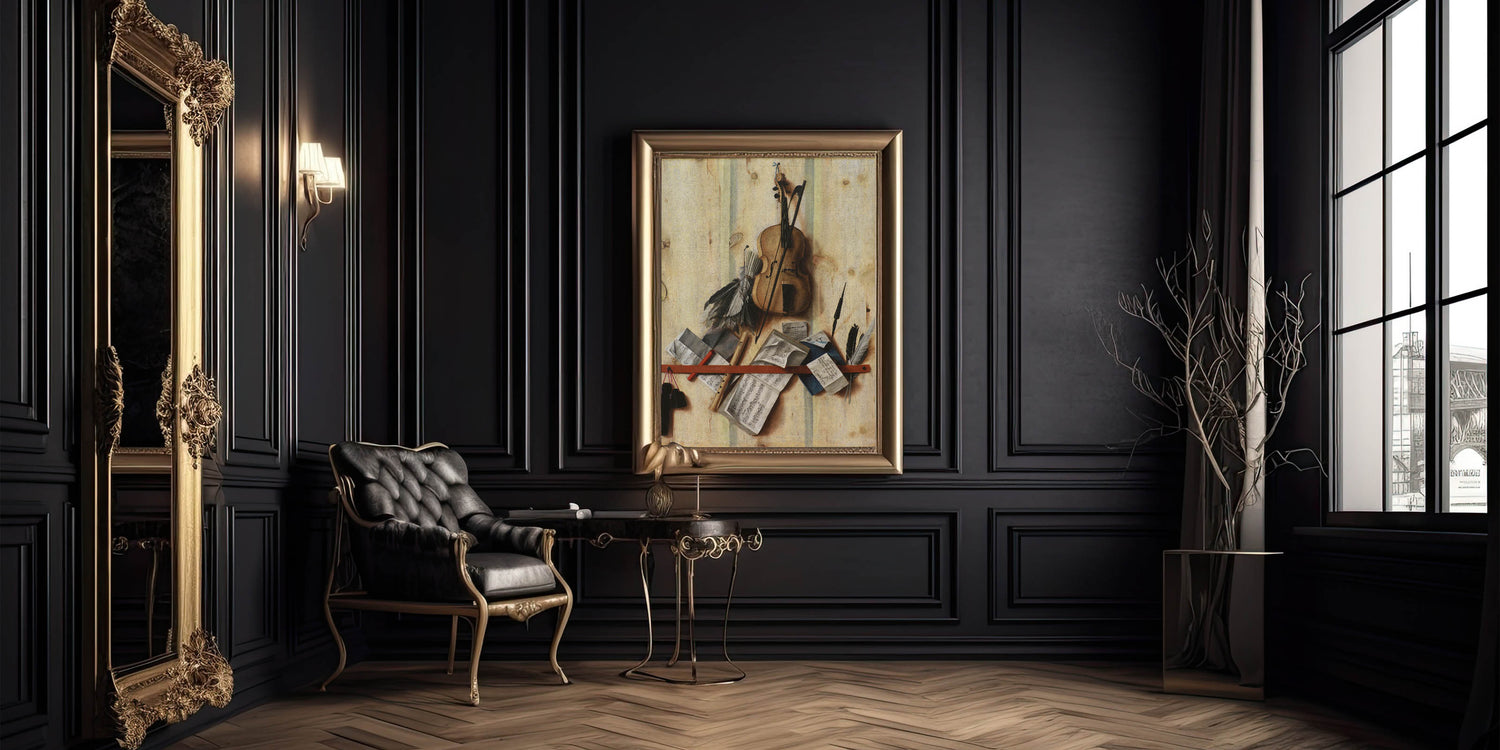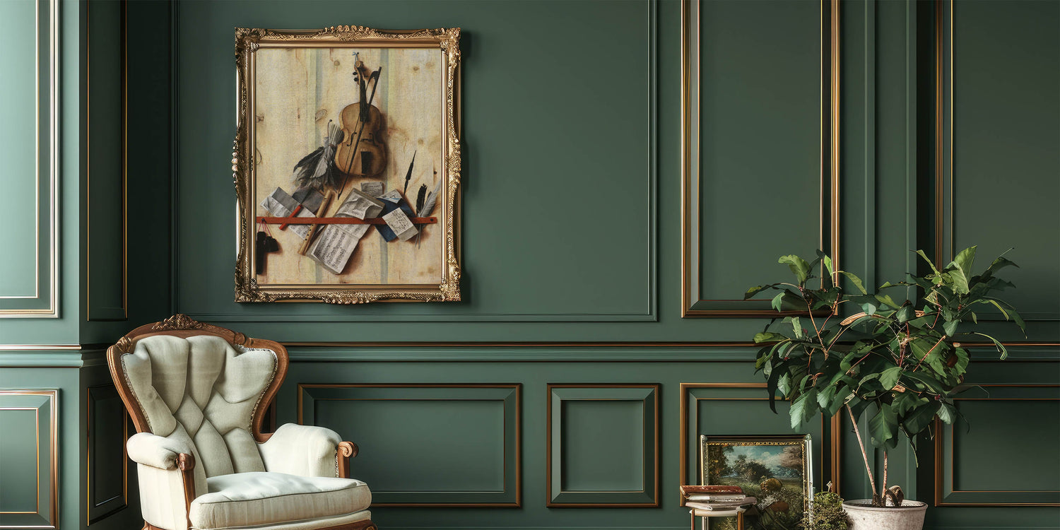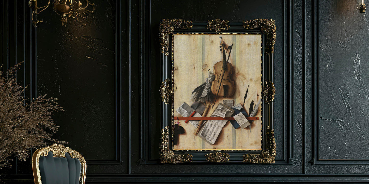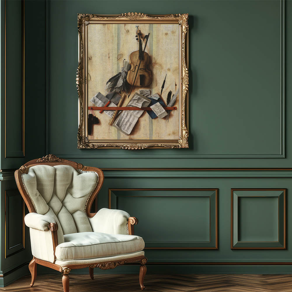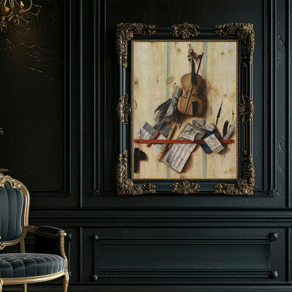 Celebrate the harmony of art and music with this elegant Baroque still life. This painting features a beautifully rendered violin, sheet music, quills, and feathers arranged with precision and grace. The artist’s mastery shines through in the intricate textures of the wood, paper, and soft feathers, creating a sense of depth and realism. The composition captures the essence of the Baroque period’s timeless artistic expression, elevating everyday musical items into a work of art.