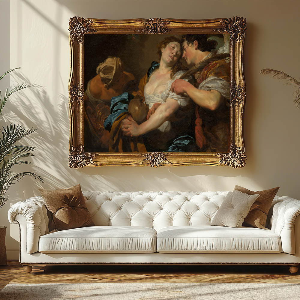 Indulge in the emotional storytelling of Baroque art with this beautifully rendered romantic scene. This artwork depicts a tender moment between two figures, rich in emotional expression and intricate detailing. The interplay of vibrant golden tones, soft whites, and deep shadows highlights the masterful use of chiaroscuro, a hallmark of period art collections. The dynamic composition and lifelike figures bring this piece to life, making it a centerpiece of timeless artistic expression.