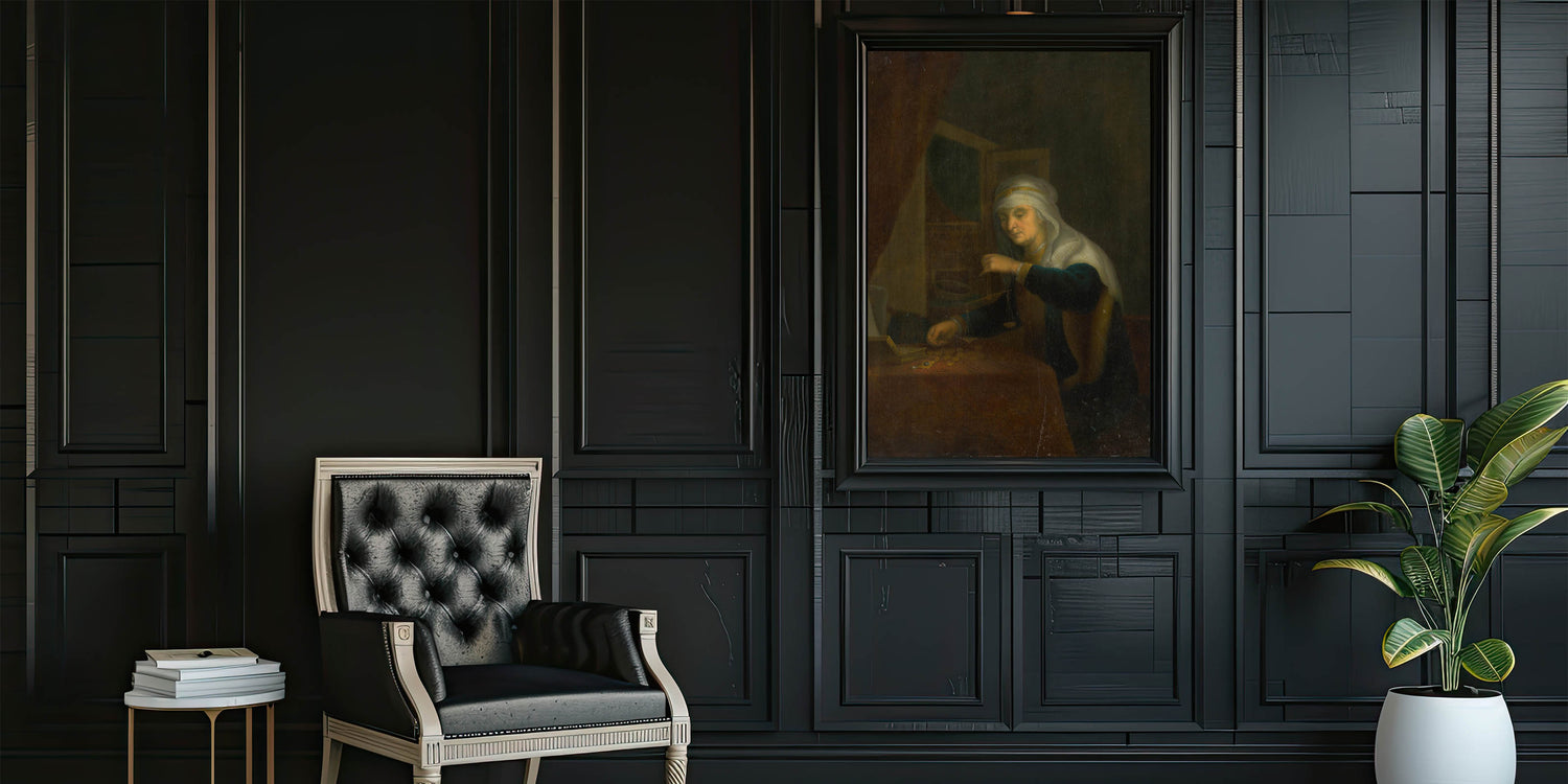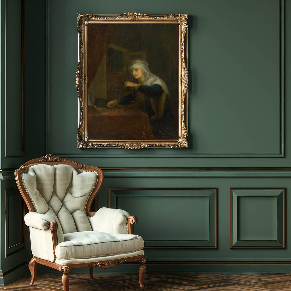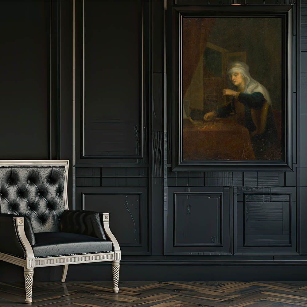 Delve into the serene sophistication of Baroque art with this intimate portrayal of a woman weighing coins. This artwork captures a moment of quiet contemplation and balance, symbolized by the scales in her hand. The soft glow of light, highlighting her face and surroundings, contrasts beautifully with the dark background, a hallmark of period art collections. The intricate detailing of her attire and the scattered coins evoke themes of diligence, prosperity, and moral reflection, making this piece a timeless representation of artistic elegance.