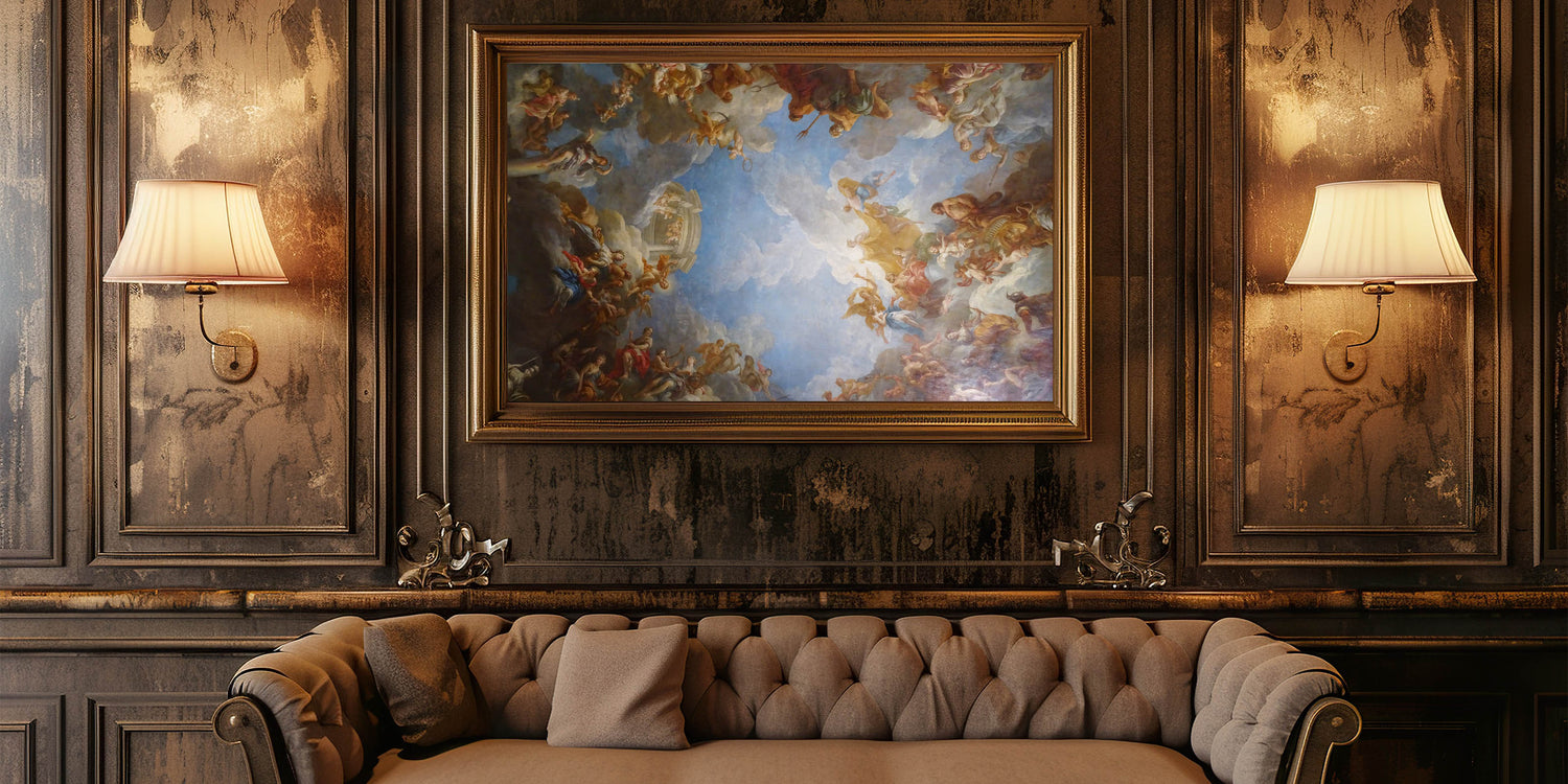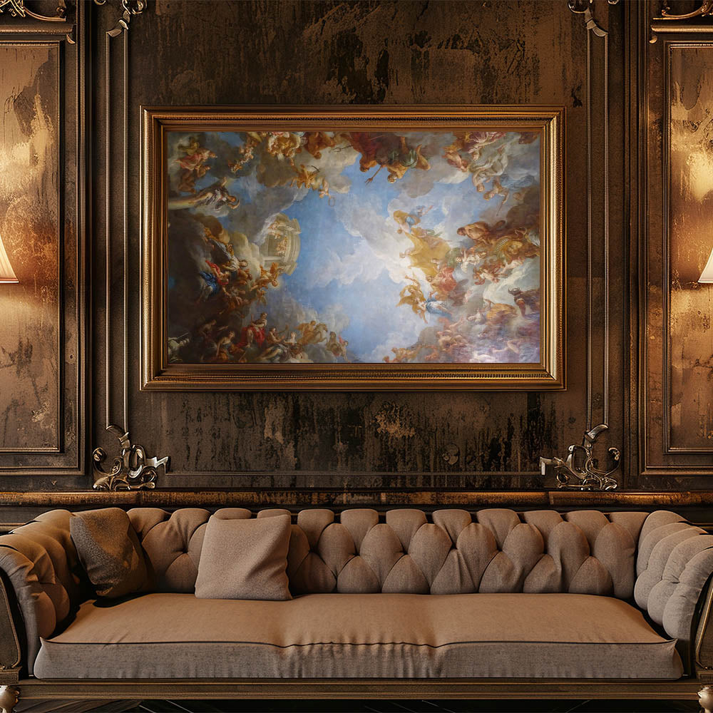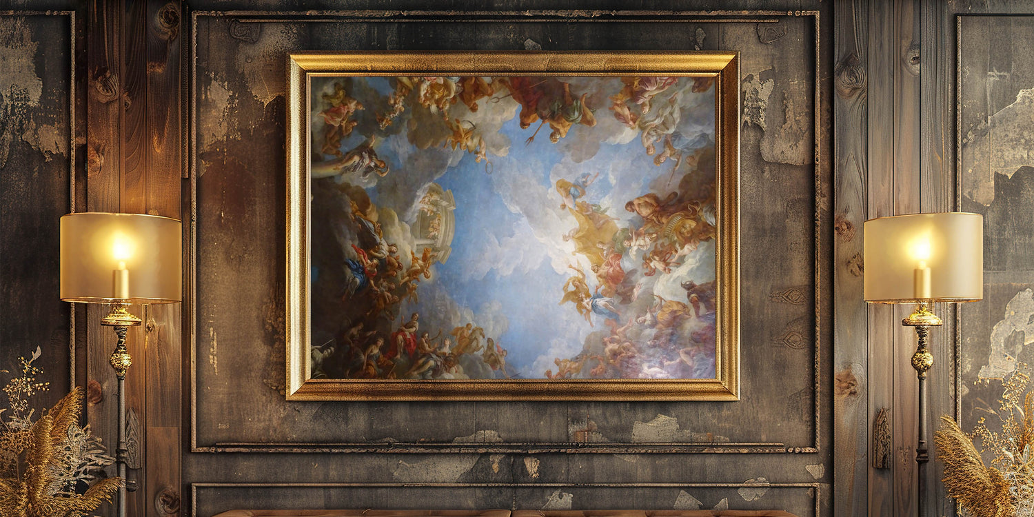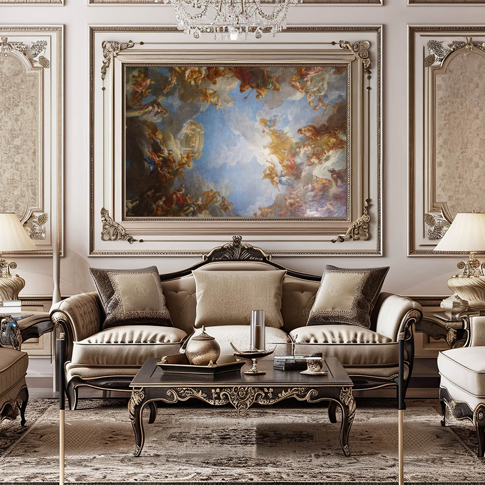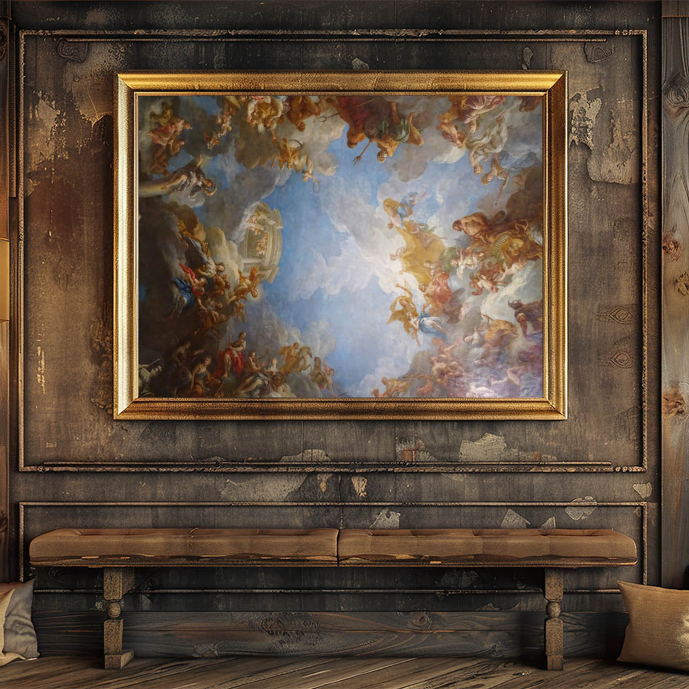 Bring the opulence of Baroque art into your space with this breathtaking celestial masterpiece. This intricately detailed artwork captures the grandeur and elegance of Baroque ceiling murals, featuring heavenly figures amidst soft, billowing clouds and radiant golden hues. Perfectly suited for lovers of classic and historical art, this piece will add timeless sophistication to any interior.