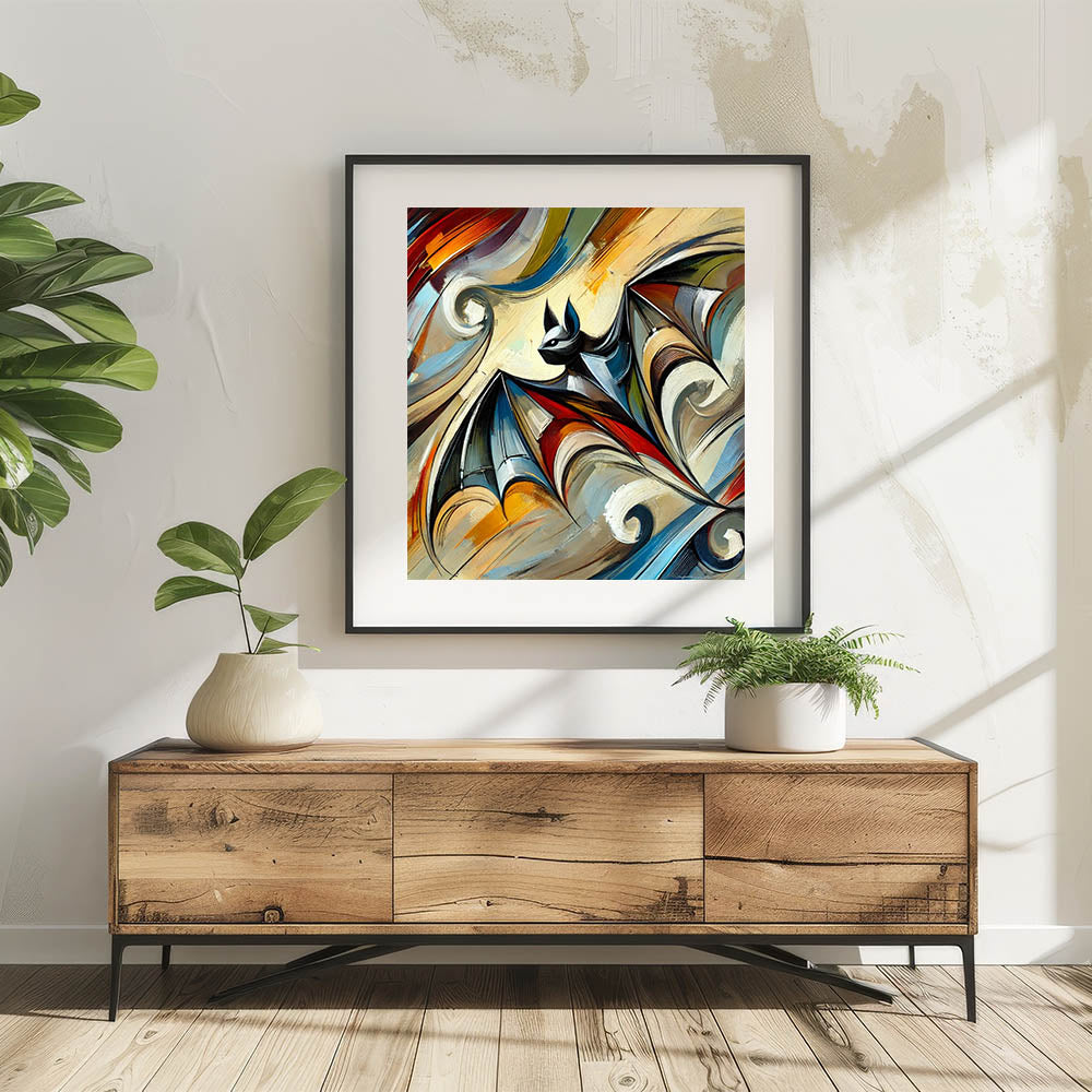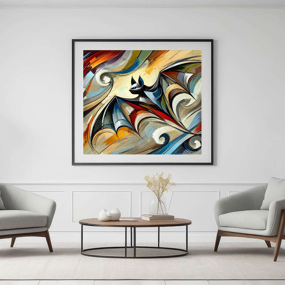 Bring a bold and dynamic touch to your space with this Abstract Bat Art, a striking blend of vivid colors and captivating design. This unique piece of wall art features a bat in flight, rendered in an abstract style that combines sharp lines with flowing patterns. The vibrant colors and intricate details create a sense of movement and energy, making it a perfect statement piece for any modern or contemporary setting.