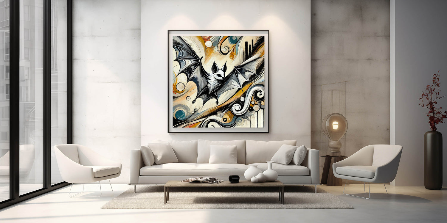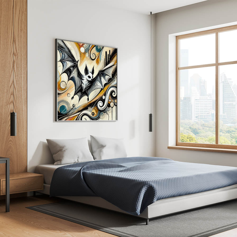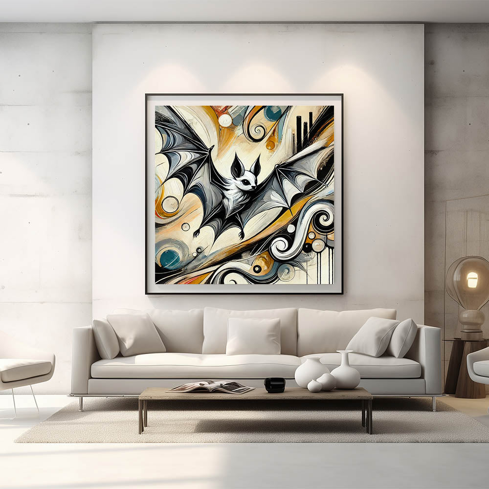 Add a touch of elegance to your space with this majestic bat wall art. This captivating piece features a graceful bat in mid-flight, beautifully captured in a modern abstract style. The dynamic lines and vivid colors bring the bat's movement to life, making this artwork a stunning focal point in any room.