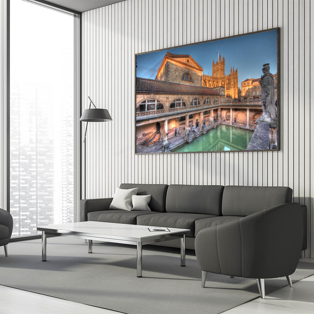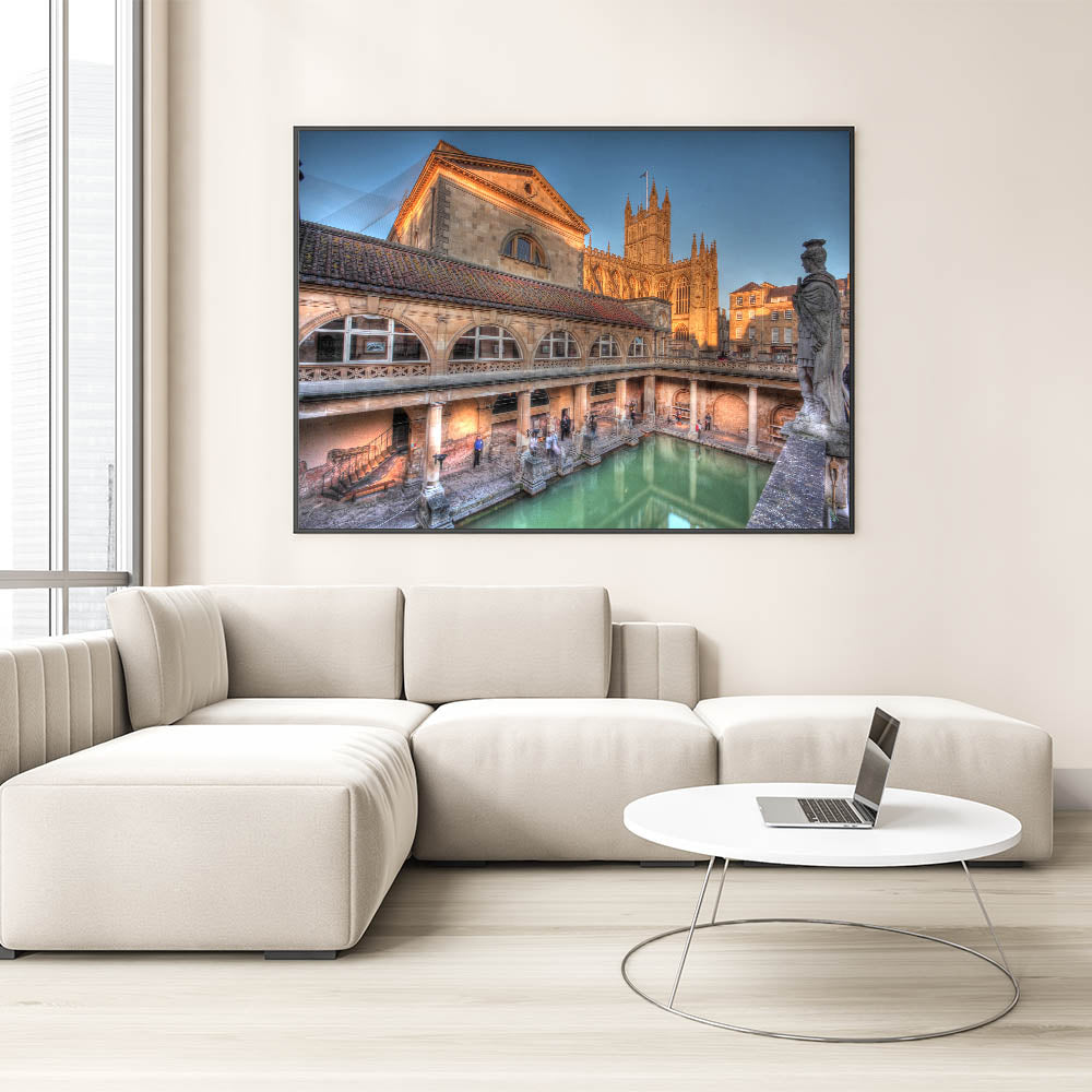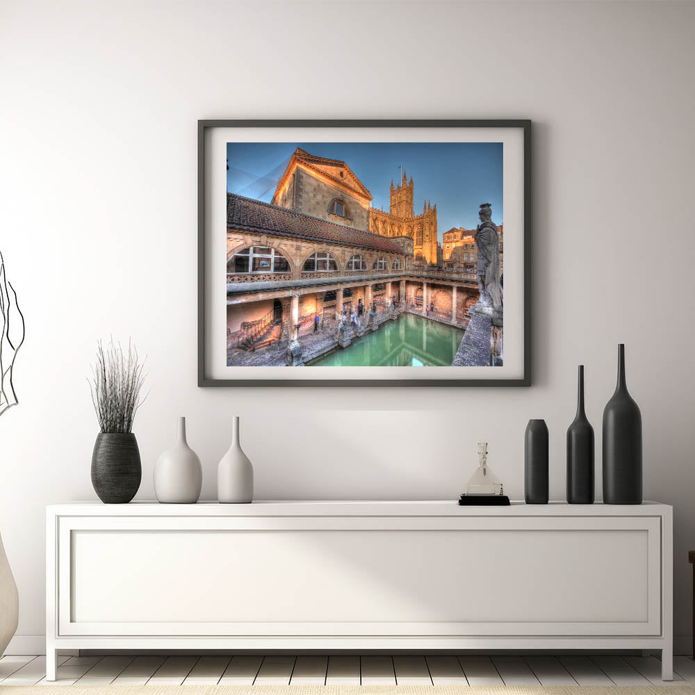 - High-quality Bath England wall art depicting the Roman Baths and Bath Abbey.