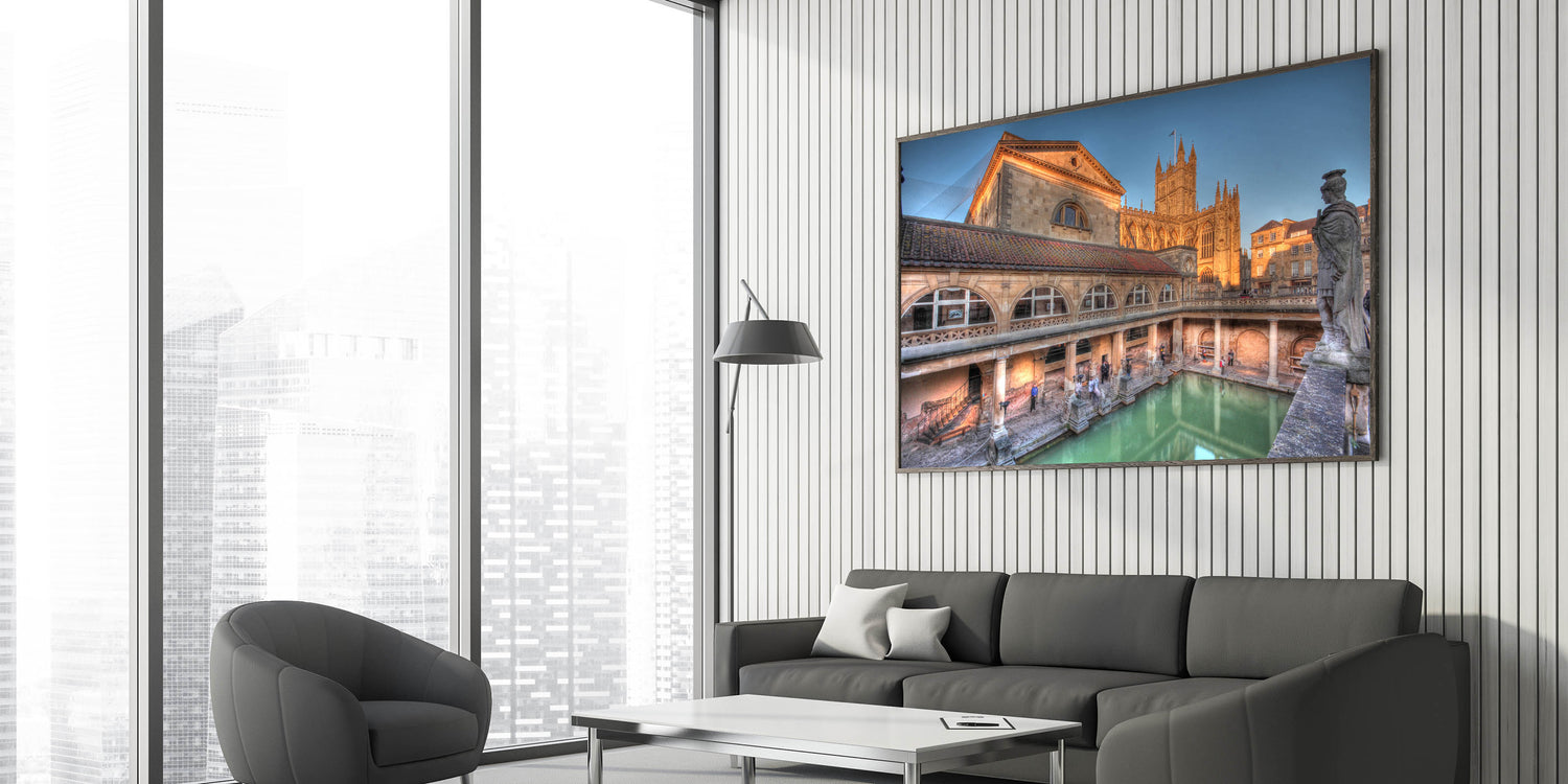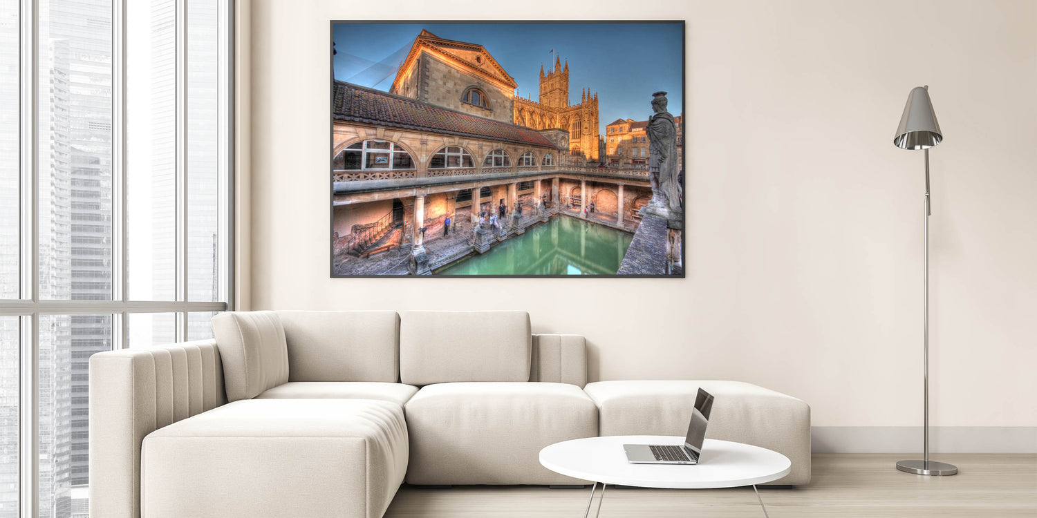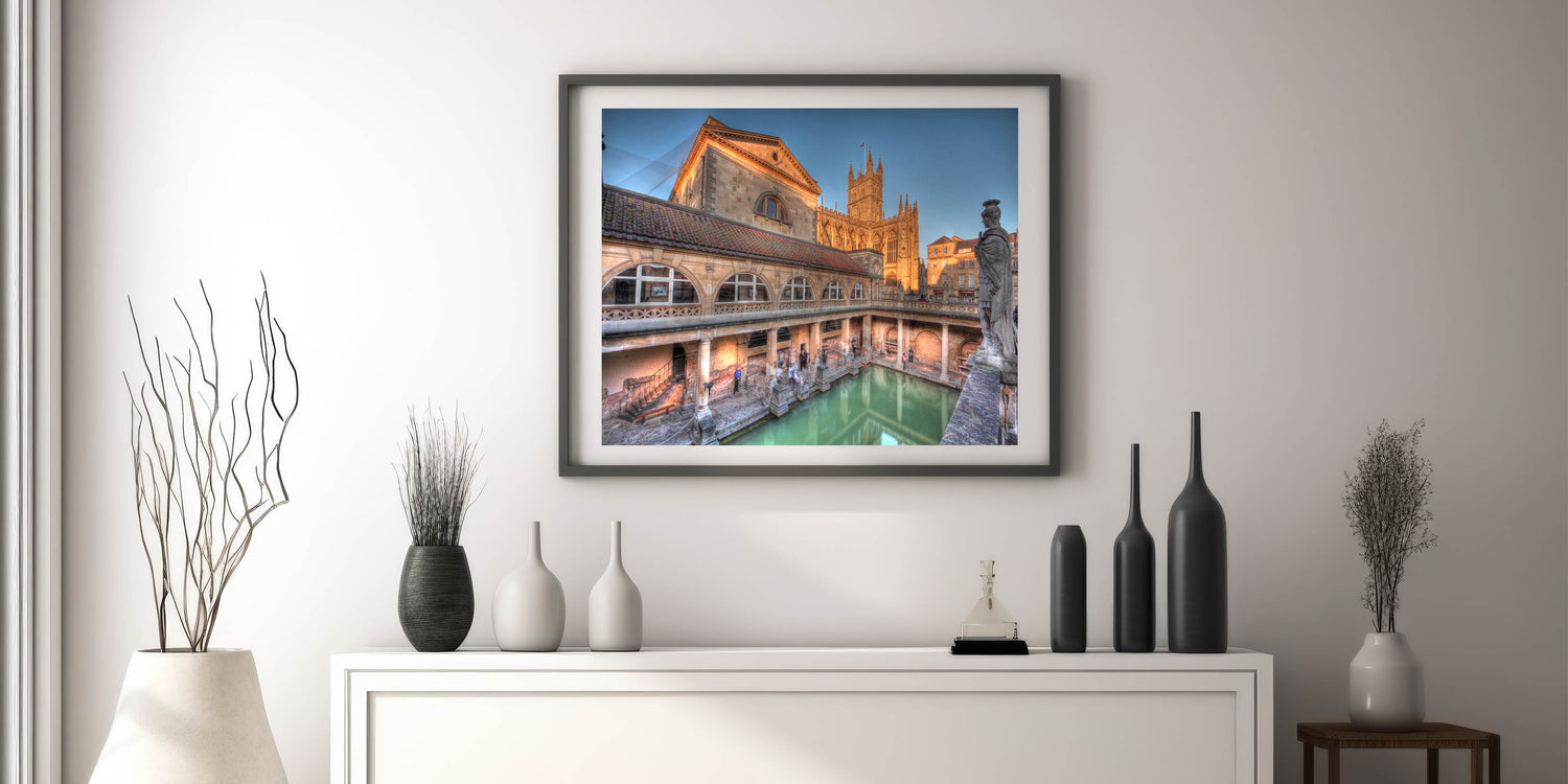 - High-quality Bath England wall art depicting the Roman Baths and Bath Abbey.