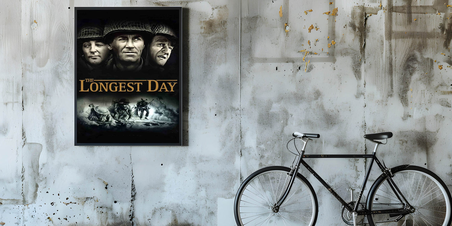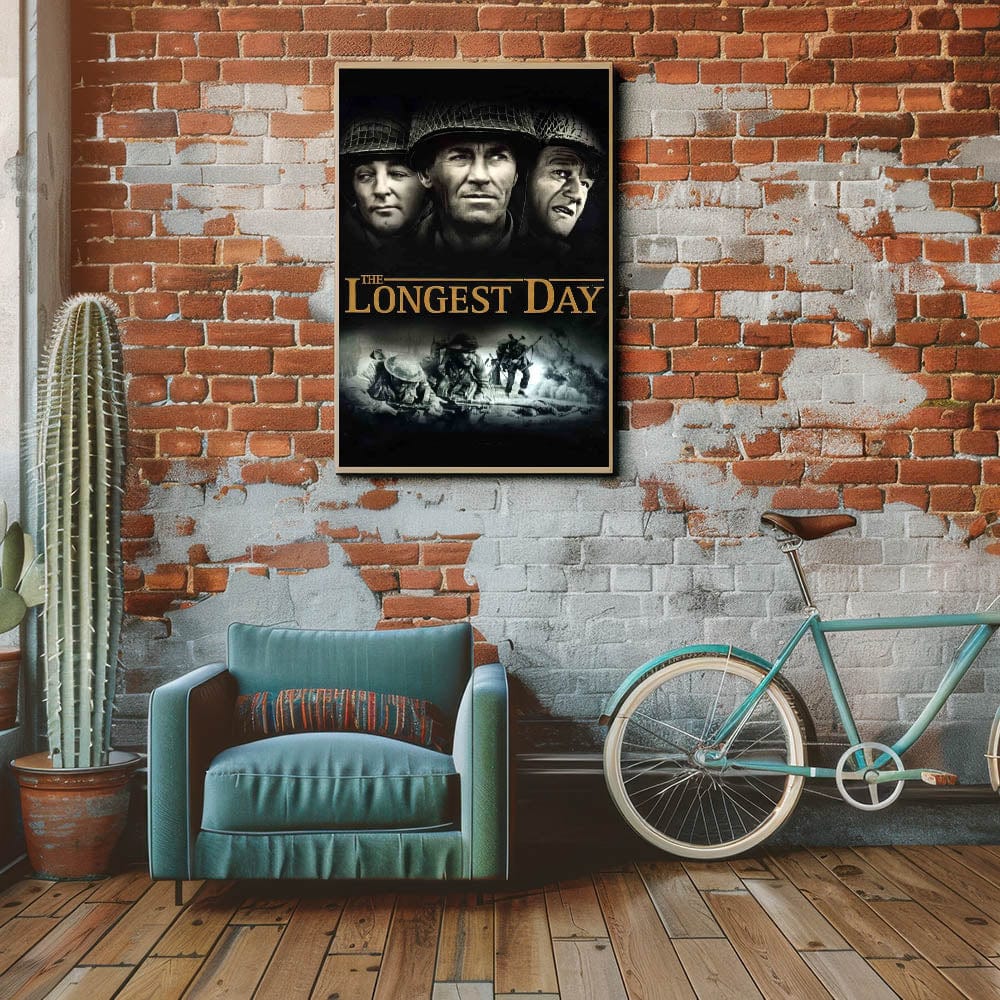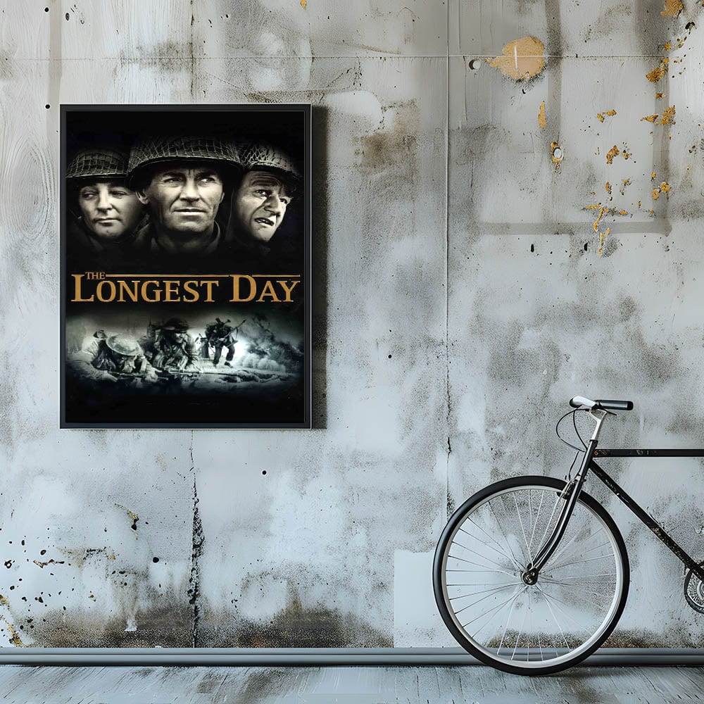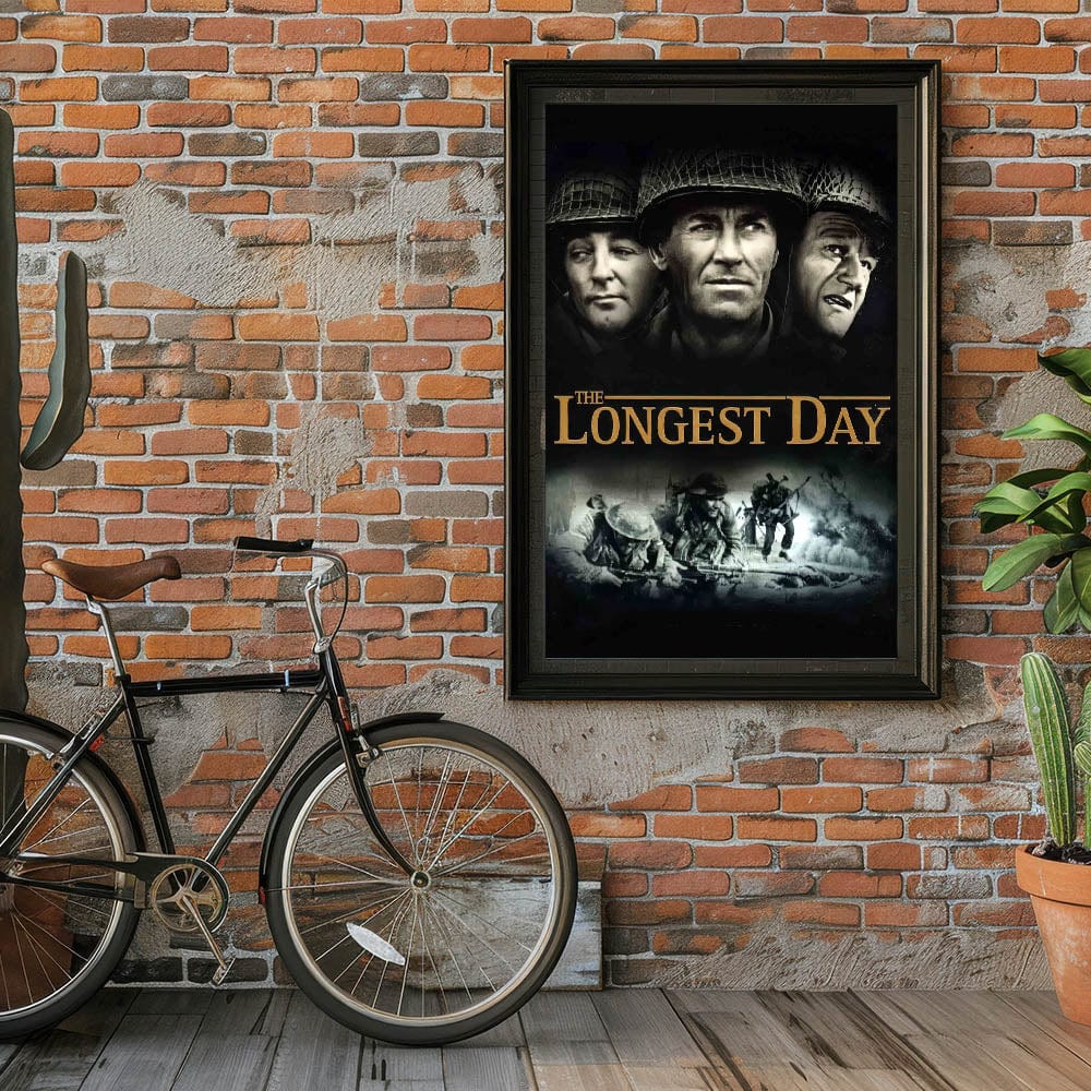 Commemorate the epic storytelling of 1960s war cinema with this The Longest Day vintage movie poster. This classic 60s movie print captures the intense battle scenes and heroic performances of one of the most renowned war films of its era. Featuring dramatic black-and-white imagery with soldiers in combat and leading Hollywood stars, this retro cinema art from the 1960s is a must-have for military history enthusiasts and classic film collectors.