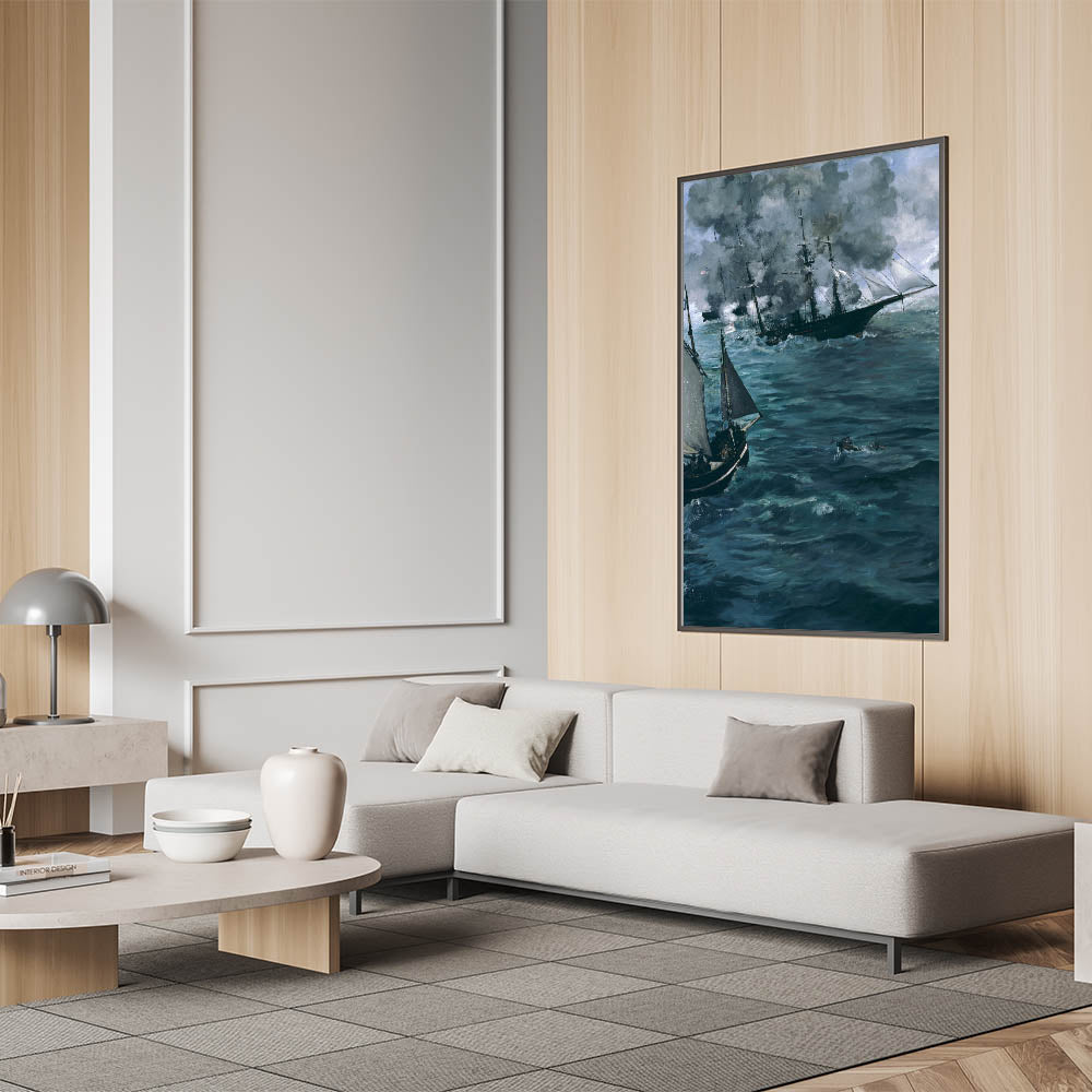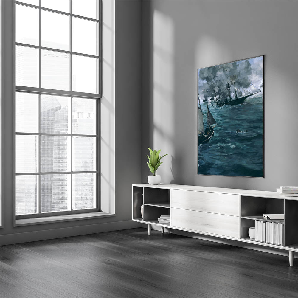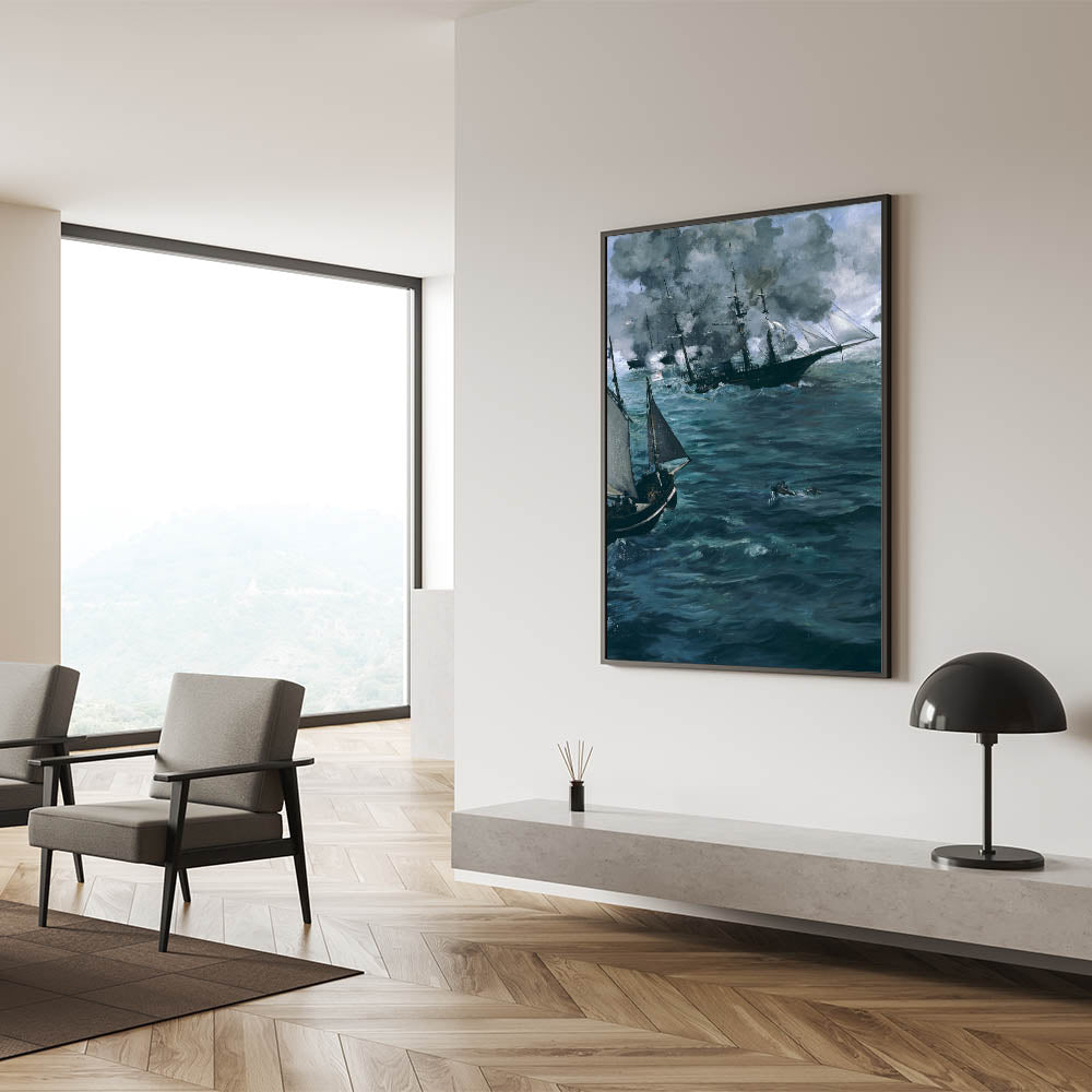 Immerse yourself in the intensity of a naval battle with this dramatic Impressionist wall art piece. Inspired by the works of famous Impressionist artists, this artwork captures the raw energy and movement of the sea, depicting ships engaged in a fierce encounter. The deep, swirling blues and grays convey a sense of power and mystery, making it an excellent choice for those looking to bring the allure of the ocean into their decor. This Impressionist masterpiece is perfect for adding a touch of French Impressionist art to any room, whether for a home office or living area.