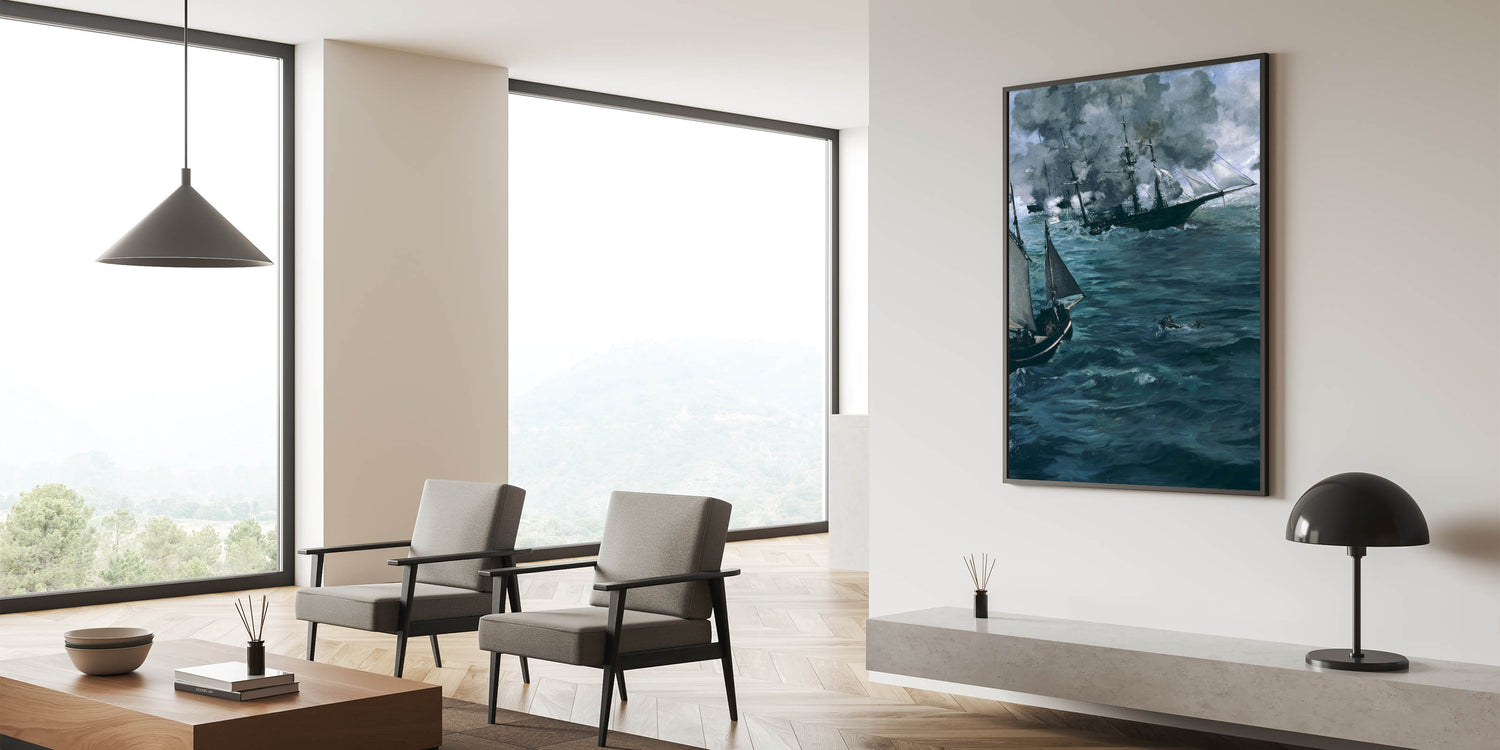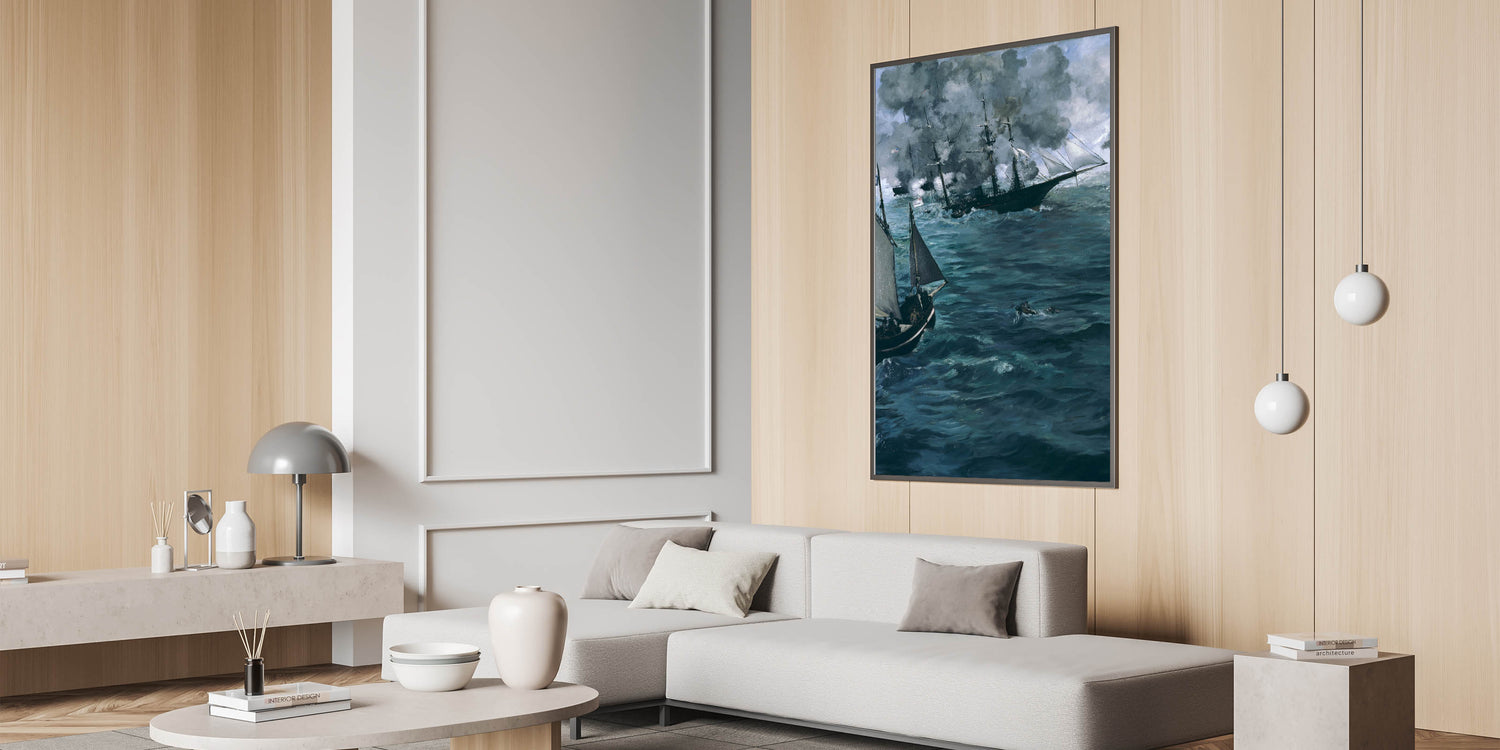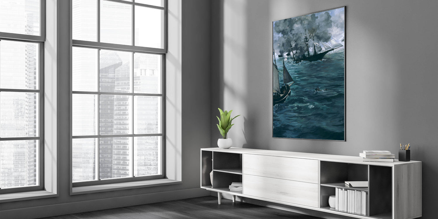 Immerse yourself in the intensity of a naval battle with this dramatic Impressionist wall art piece. Inspired by the works of famous Impressionist artists, this artwork captures the raw energy and movement of the sea, depicting ships engaged in a fierce encounter. The deep, swirling blues and grays convey a sense of power and mystery, making it an excellent choice for those looking to bring the allure of the ocean into their decor. This Impressionist masterpiece is perfect for adding a touch of French Impressionist art to any room, whether for a home office or living area.
