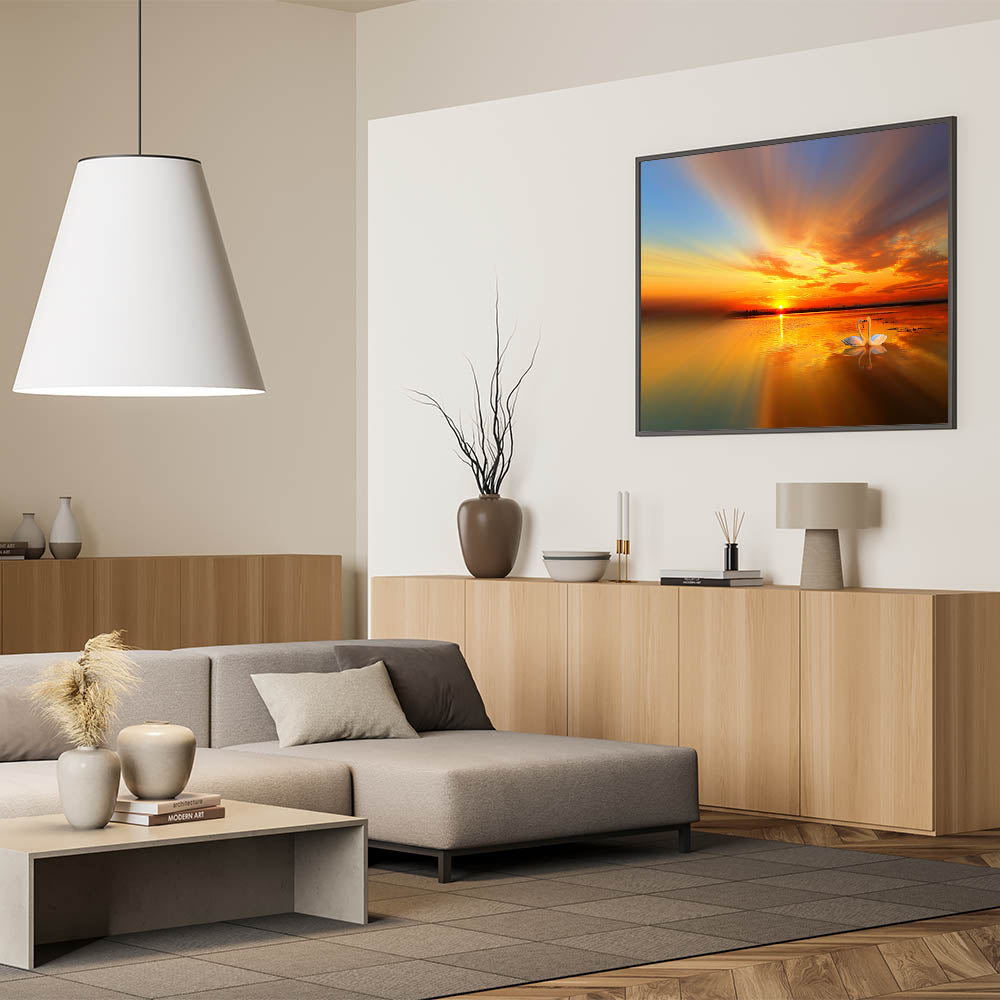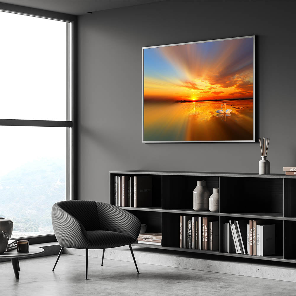 Immerse yourself in the tranquil beauty of a golden sunset with this breathtaking beach landscape wall art. This serene ocean canvas print captures the warm hues of the setting sun reflecting off calm waters, making it an ideal addition to any coastal beach scenes decor. The delicate swans in the foreground add a touch of elegance, making this artwork perfect for enhancing your beach-themed living space.