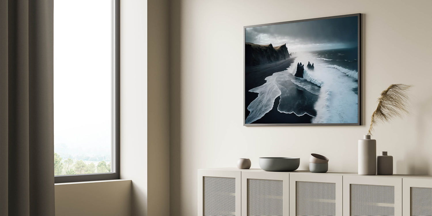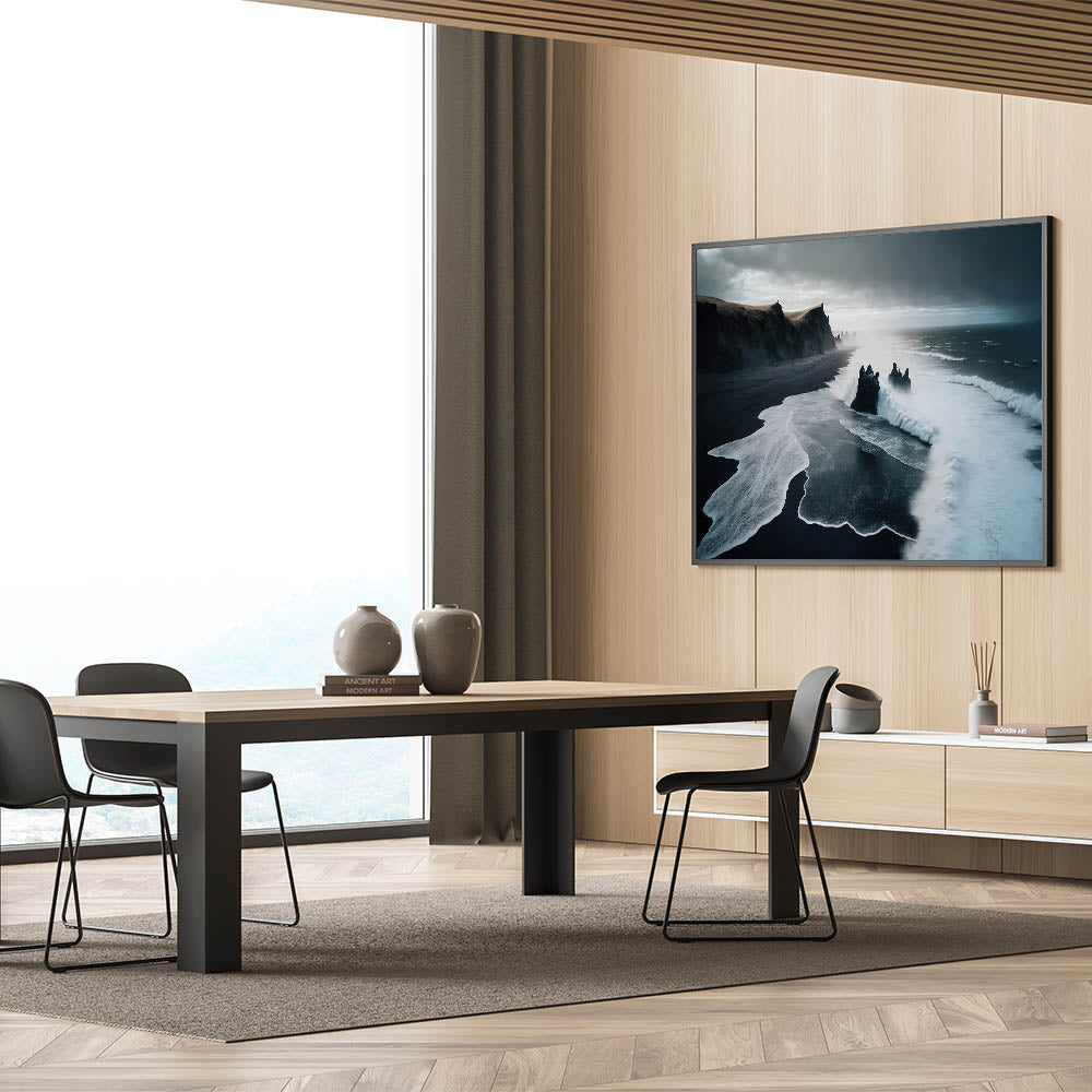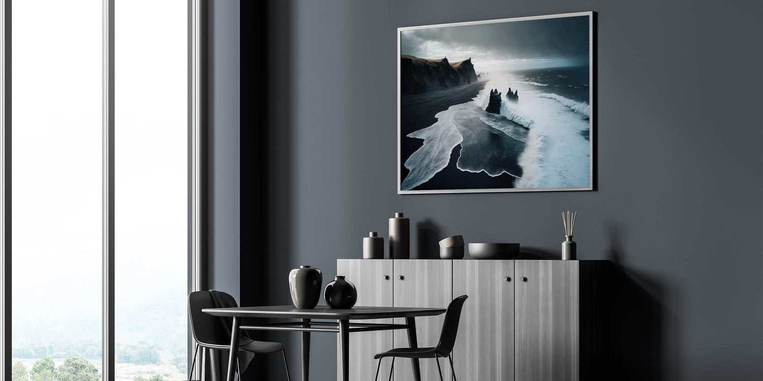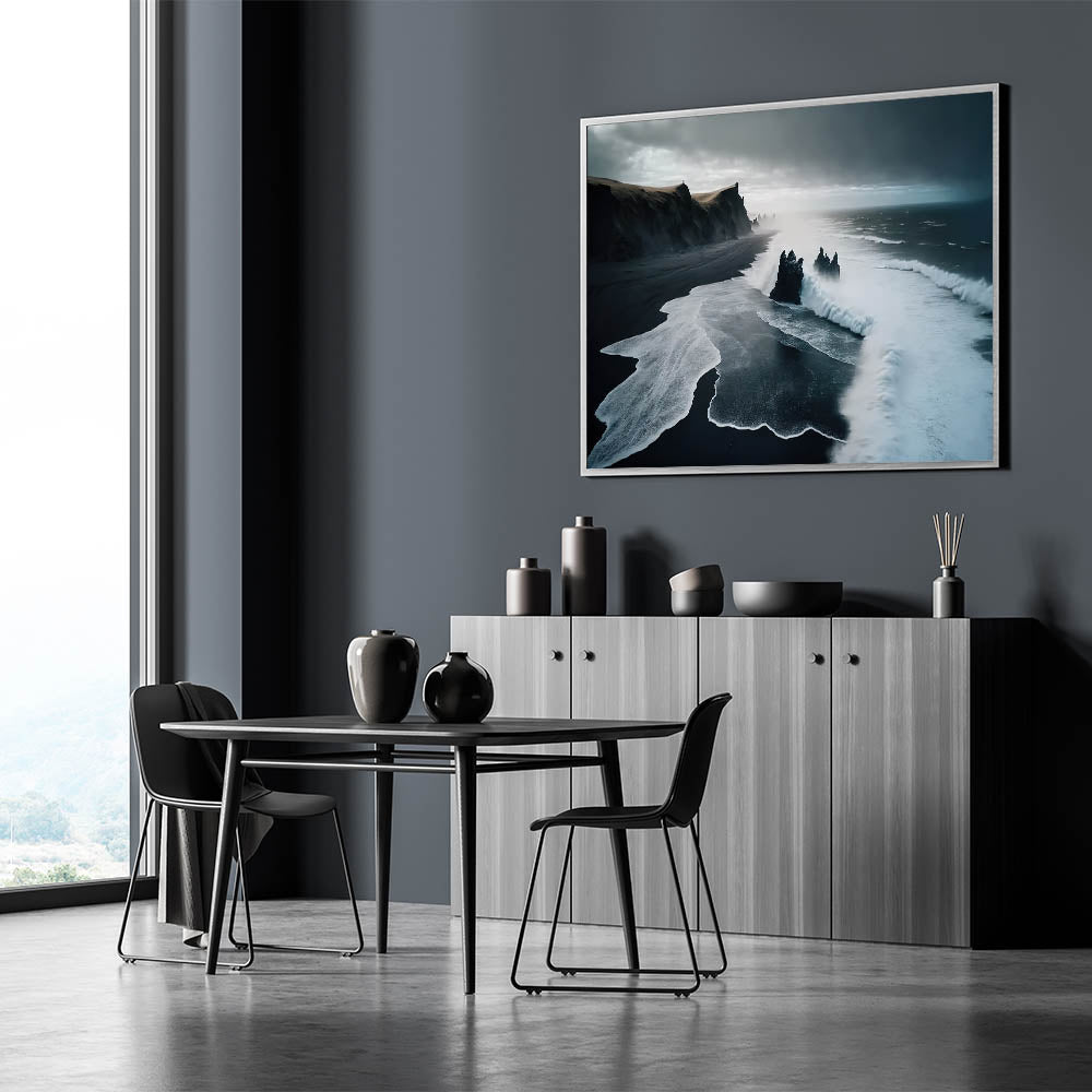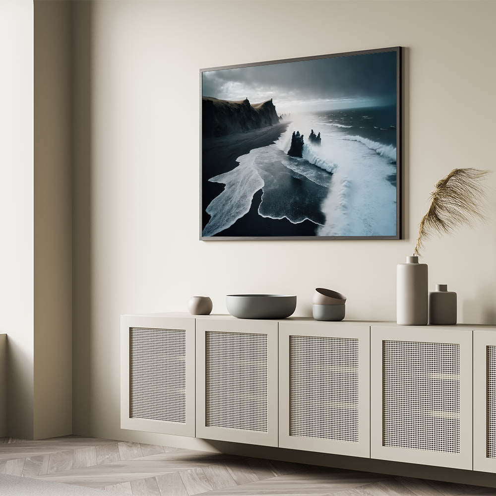 Experience the raw beauty of nature with this captivating coastal cliff beach art, featuring dramatic waves crashing against rugged black sand shores. The moody atmosphere captured in this ocean landscape creates a striking visual statement, perfect for those who appreciate the untamed power of the sea. This piece is ideal for beach home decor, adding a touch of intensity and elegance to any room, whether it’s your living room, office, or bedroom.