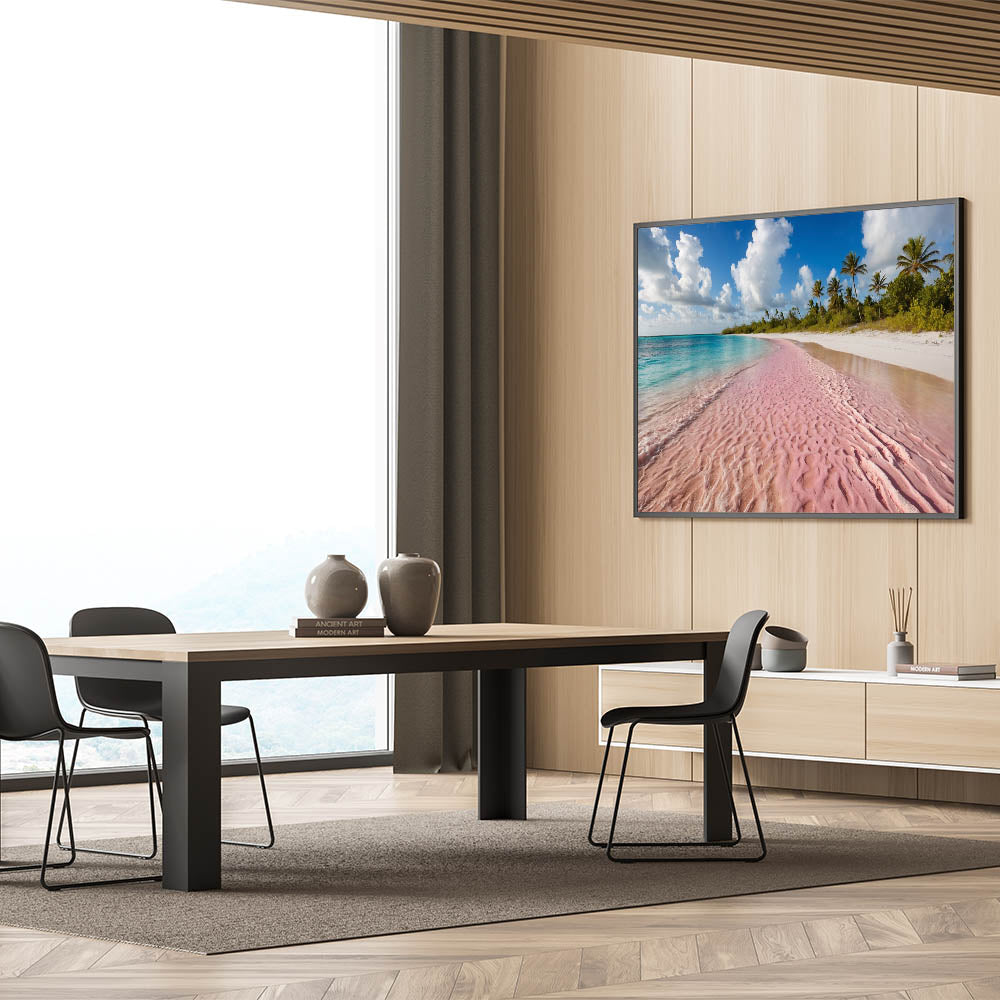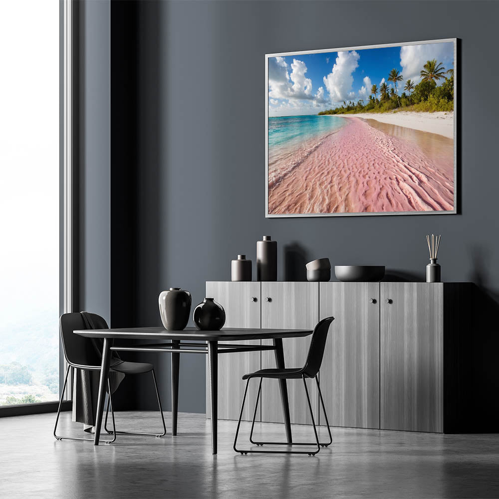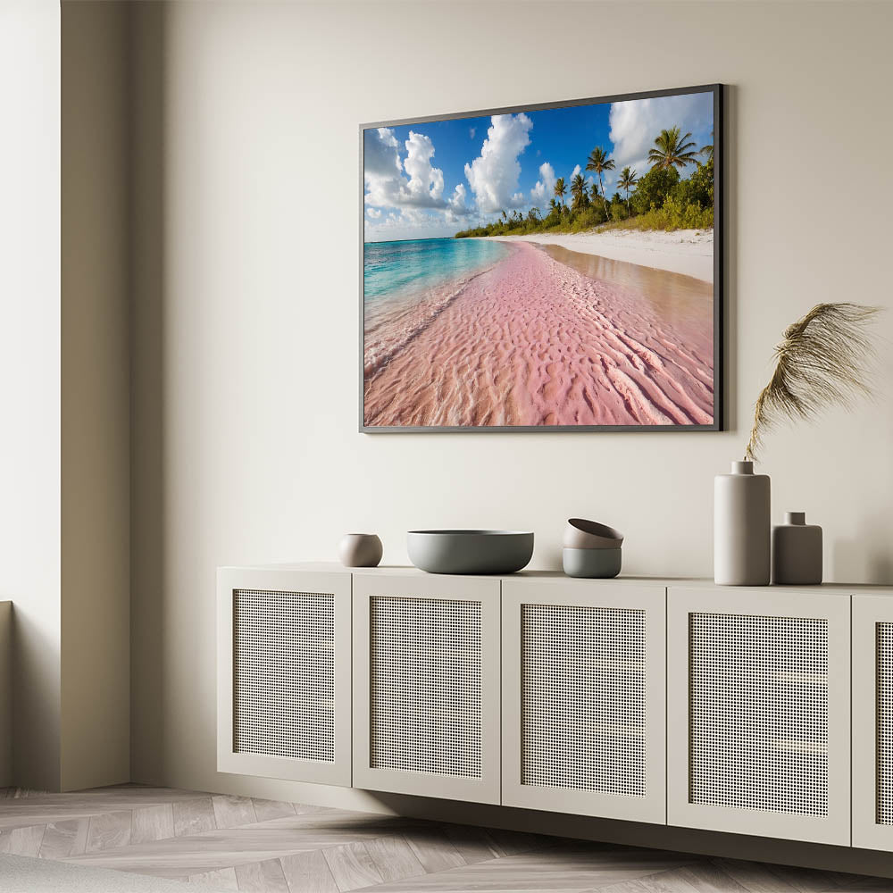 Add a touch of tropical elegance to your home with this stunning pink sand beach wall art. Perfect for those who love unique and vibrant coastal decor, this piece is sure to be a conversation starter.