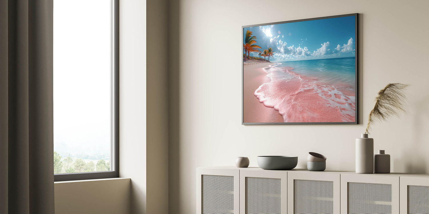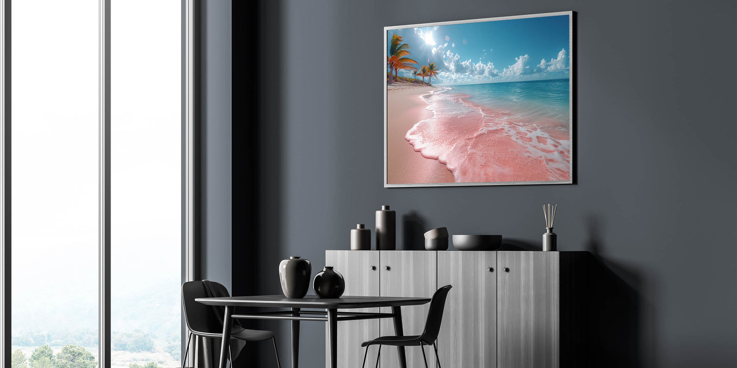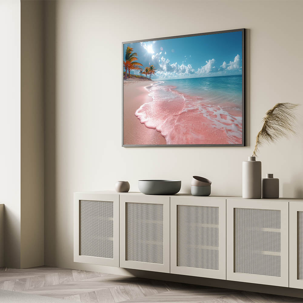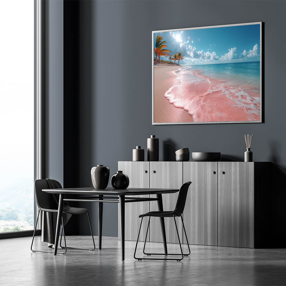 Infuse your living space with the vibrant beauty of a tropical paradise through this stunning pink sand beach artwork. The unique hue of the shoreline, contrasted by the deep blues of the ocean and the bright, sunlit sky, creates a scene that is both captivating and serene. Perfect for those who love bold, colorful decor, this piece brings the exotic charm of a tropical beach right into your home.