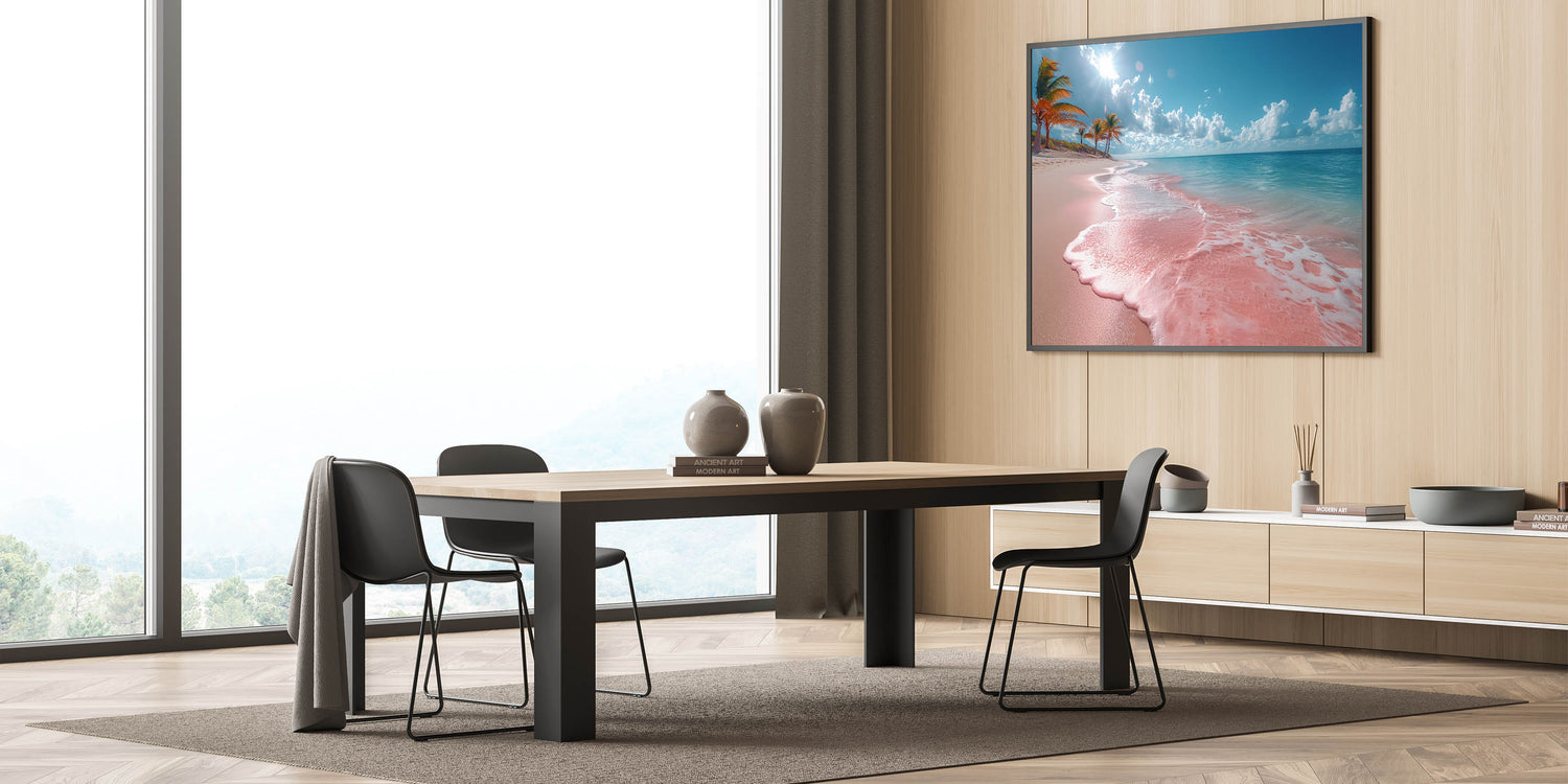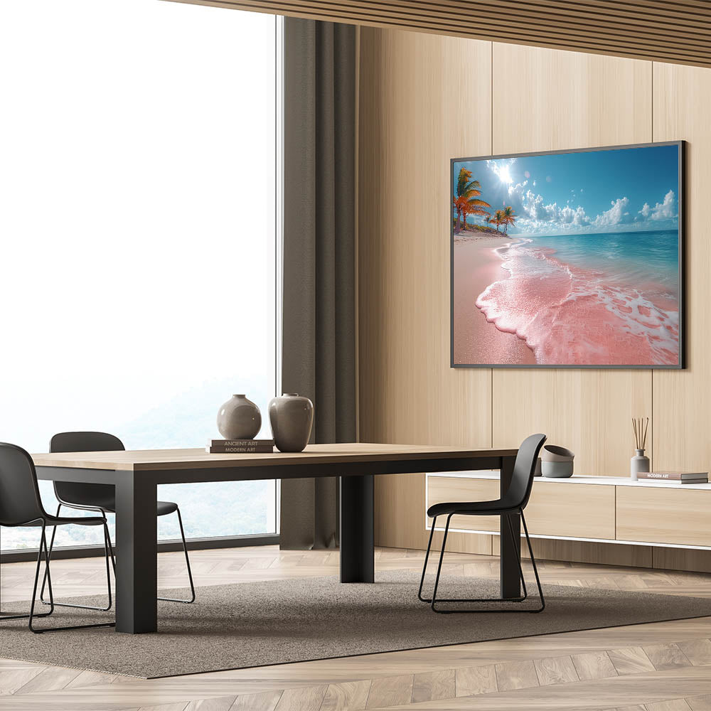 - Vivid Color Palette: The striking pink sand, lush palm trees, and clear blue waters combine to create a visually stunning and cheerful ambiance, ideal for brightening up any room.