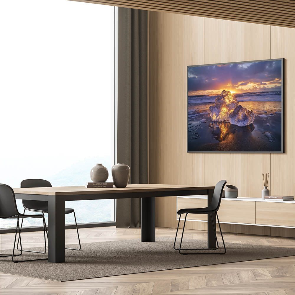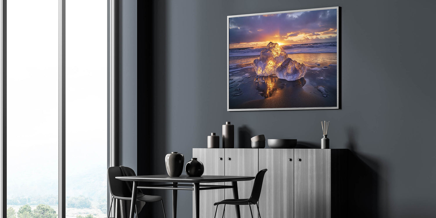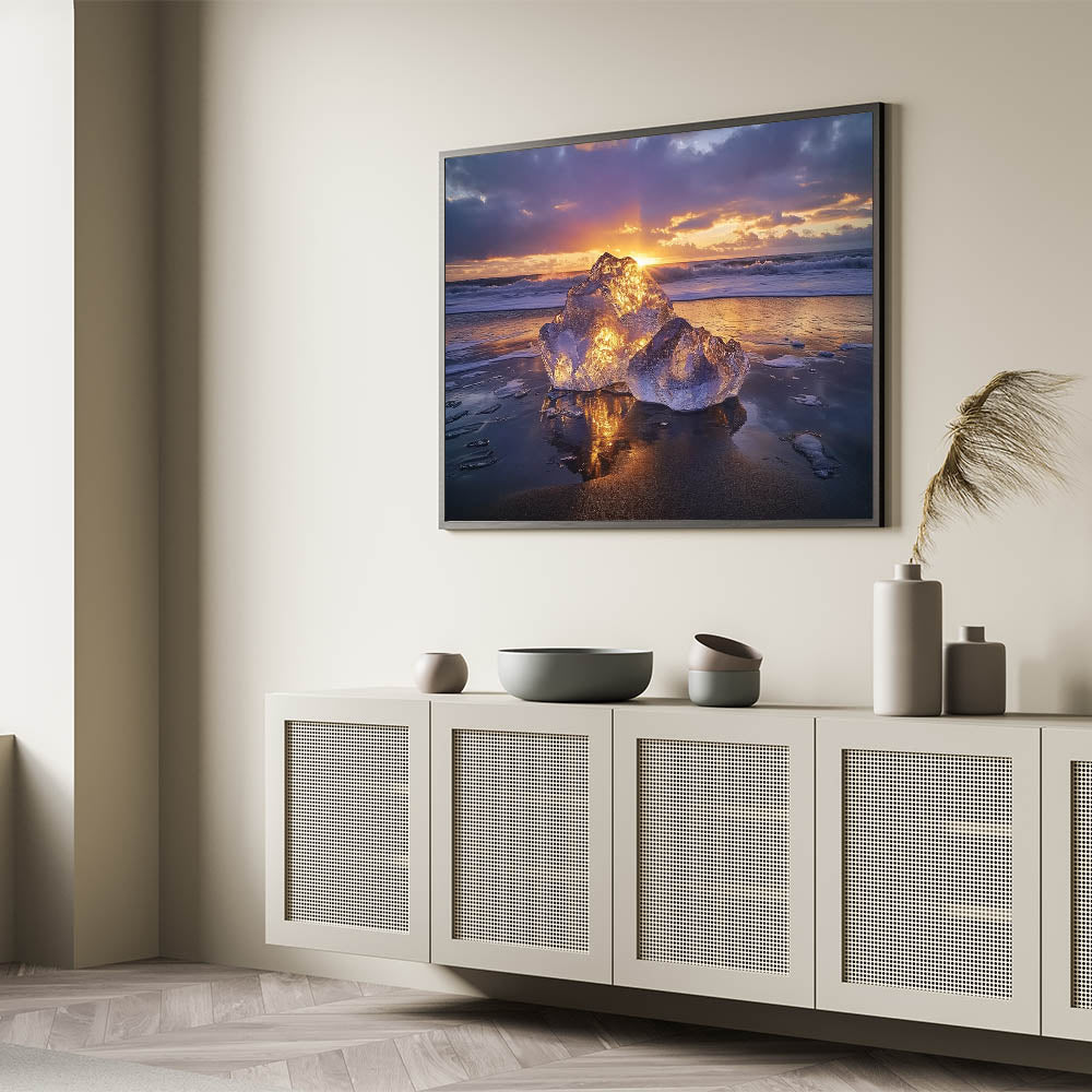 Transform your space with this stunning seaside wall decor, capturing a glowing ice formation illuminated by the fiery hues of a breathtaking sunset. Perfect for creating relaxing coastal views, this piece adds depth, warmth, and sophistication to your living space. The interplay of vibrant oranges, purples, and shimmering blues highlights the beauty of tropical beach scenes, making it a timeless choice for beach home decor ideas.