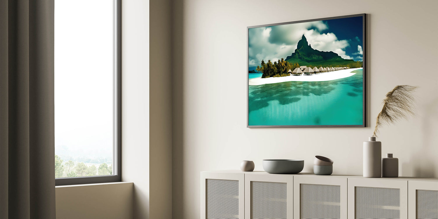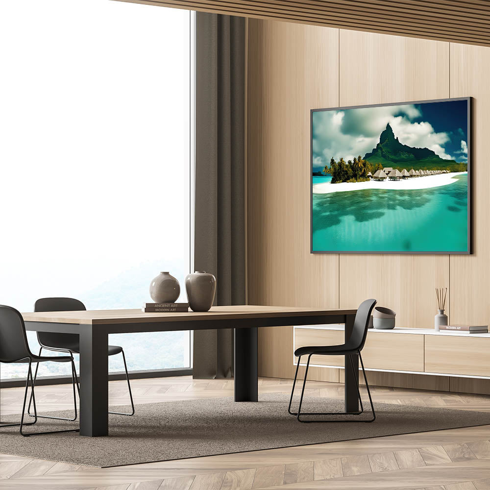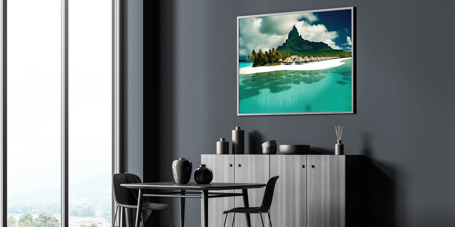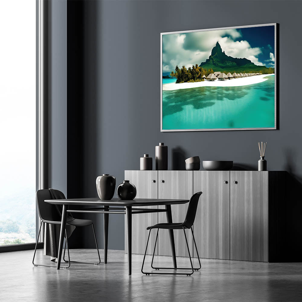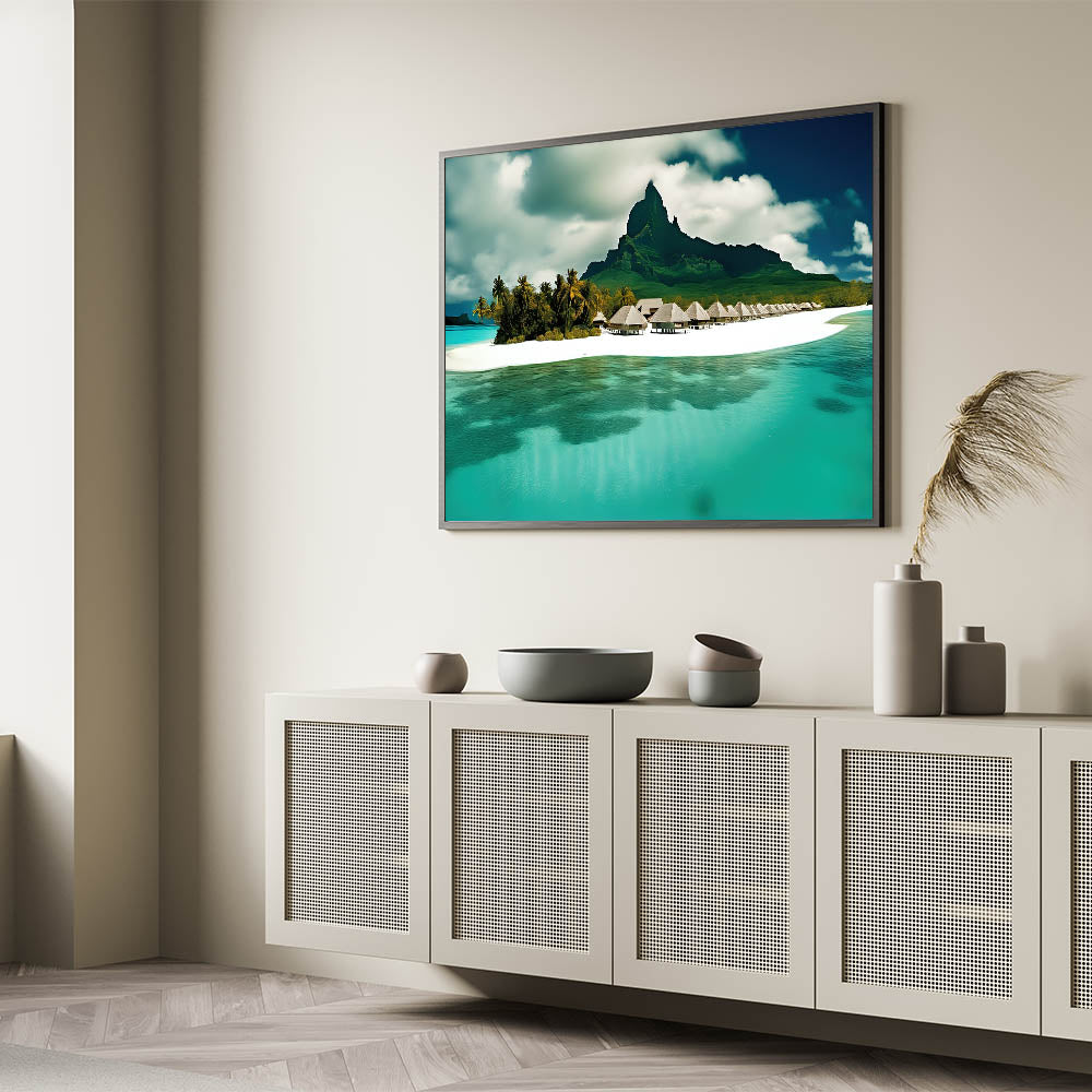 Escape to a secluded island paradise with this breathtaking artwork that captures the serene beauty of a hidden tropical haven. The calm turquoise waters, lush palm trees, and distant green mountains create a scene that invites peace and relaxation. This piece of art is perfect for those who seek to bring the tranquility of a tropical getaway into their home, offering a daily retreat to a world of calm and serenity.