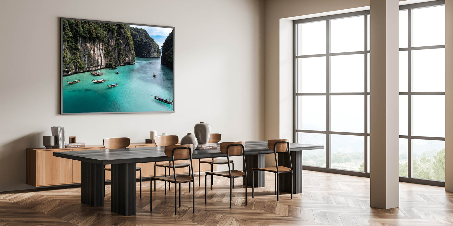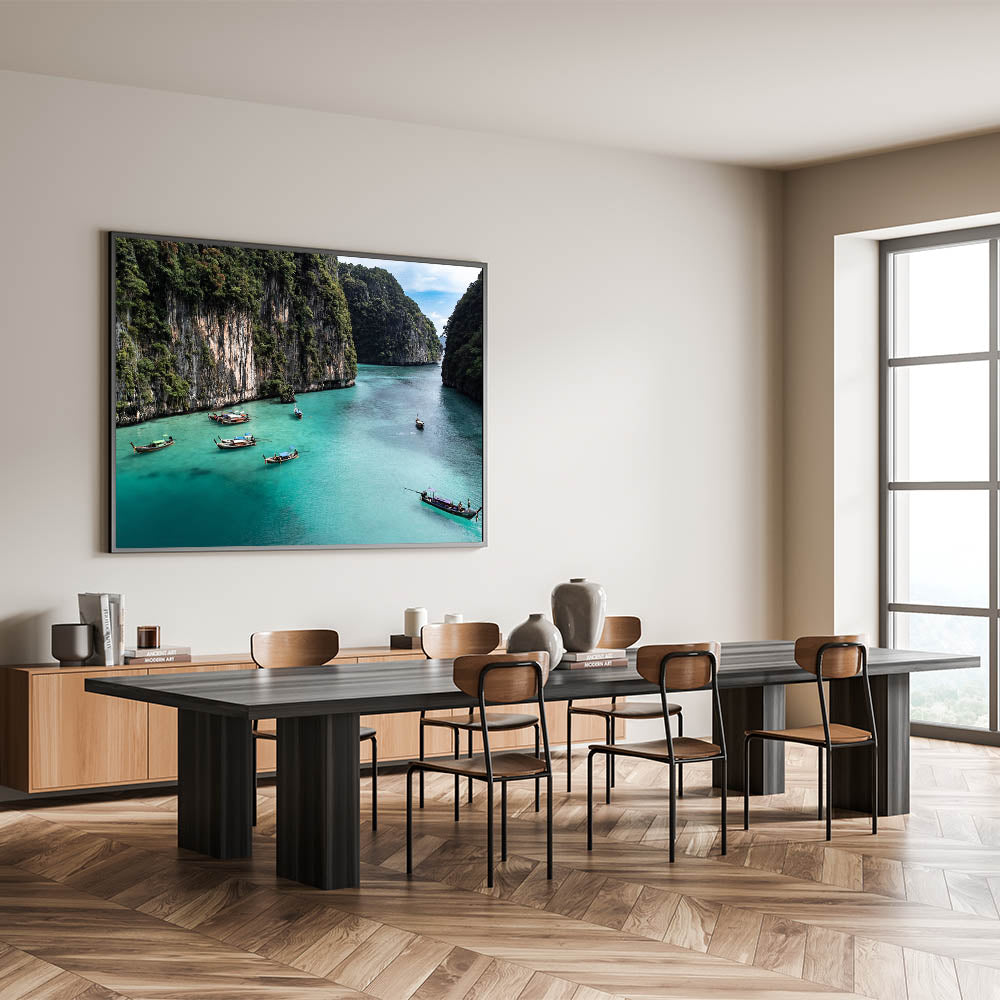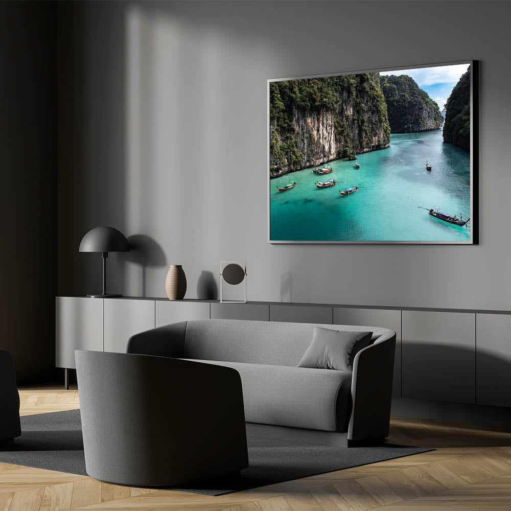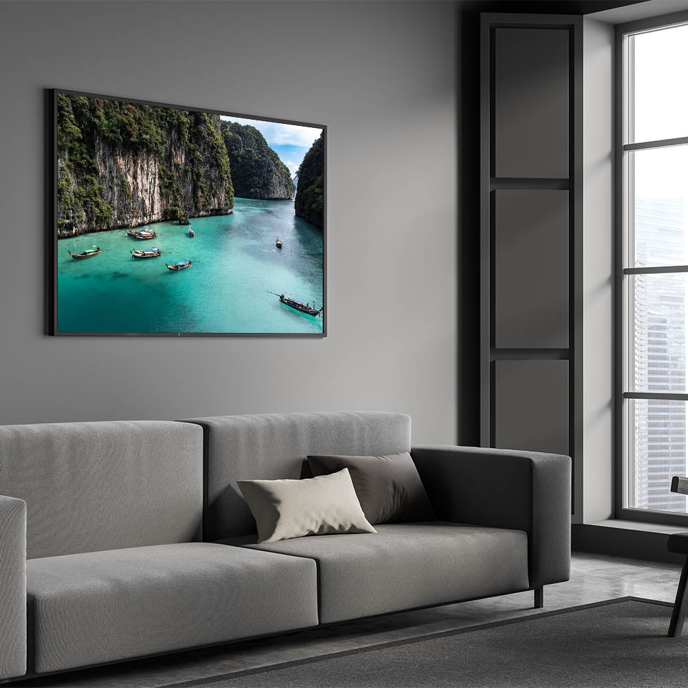 Immerse yourself in the tranquil beauty of this serene lagoon with this captivating wall art. This artwork features traditional wooden boats gently floating in the crystal-clear turquoise waters of a secluded tropical cove, surrounded by towering green cliffs. The lush greenery and calm waters create a peaceful and inviting atmosphere, perfect for adding a touch of nature's serenity to your home decor.