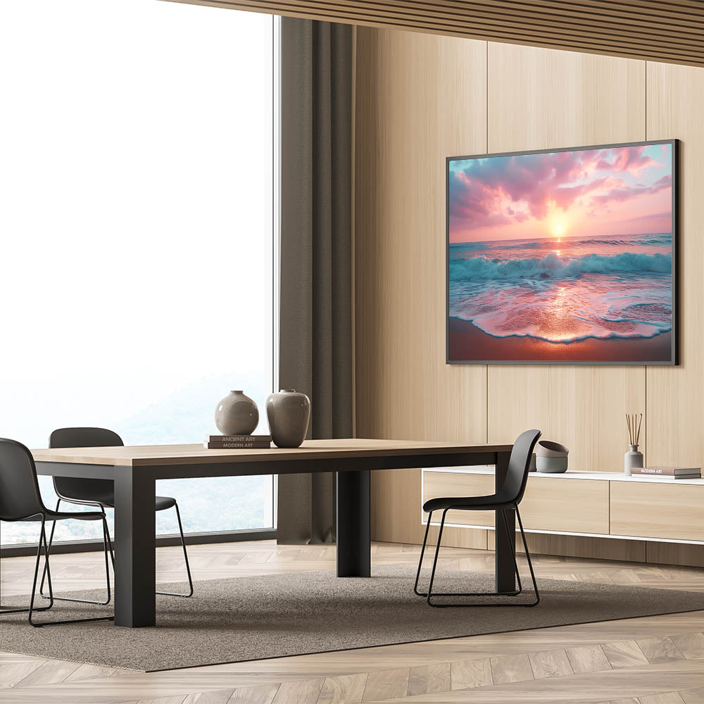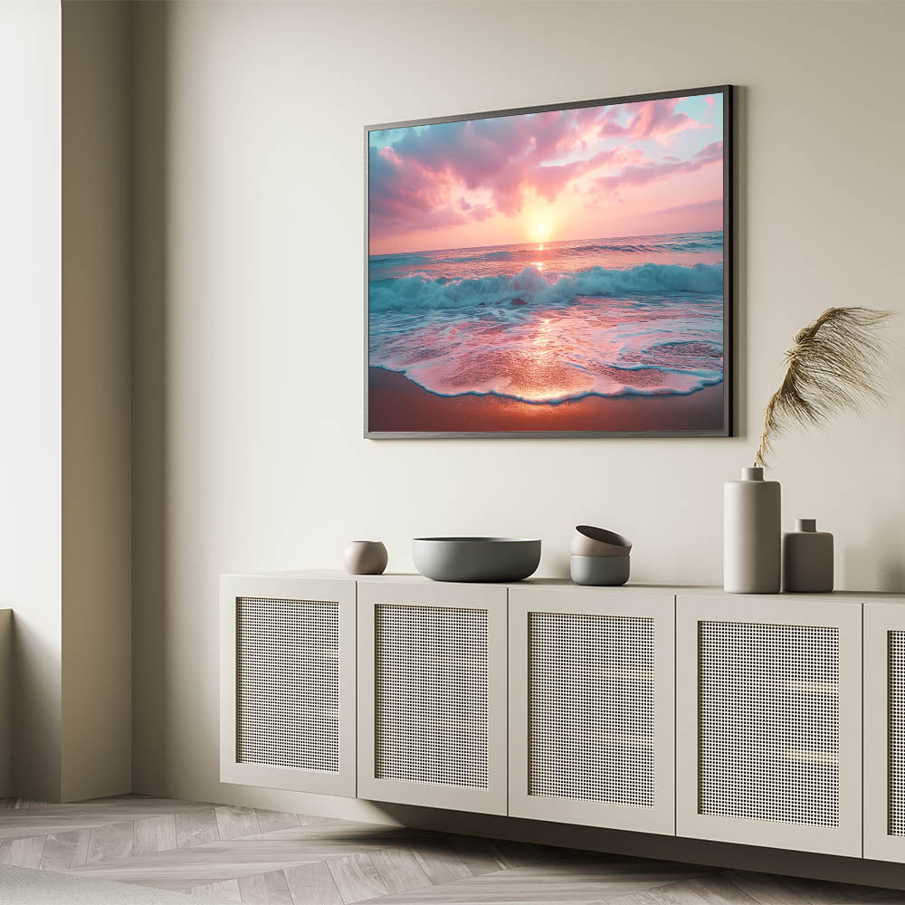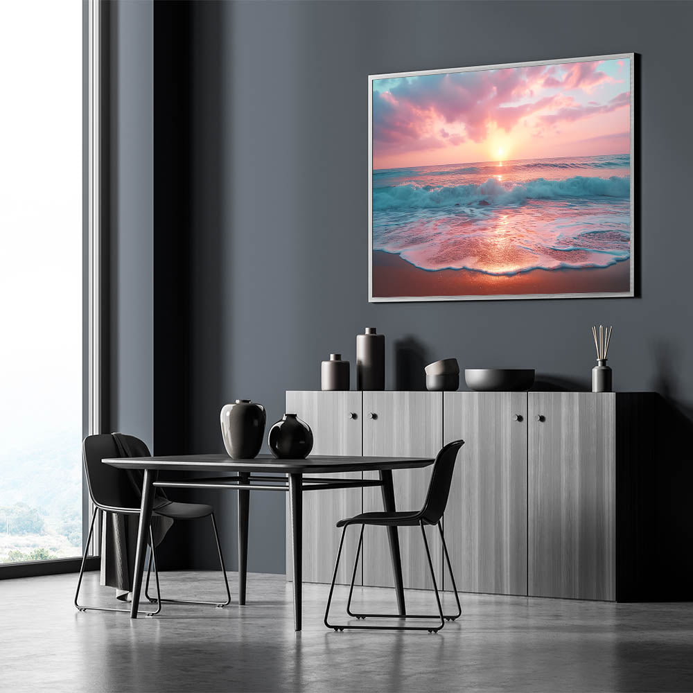 - Soothing Color Palette: The soft pastel tones of the sunset, coupled with the gentle waves, create a calming effect, ideal for spaces where relaxation is key.