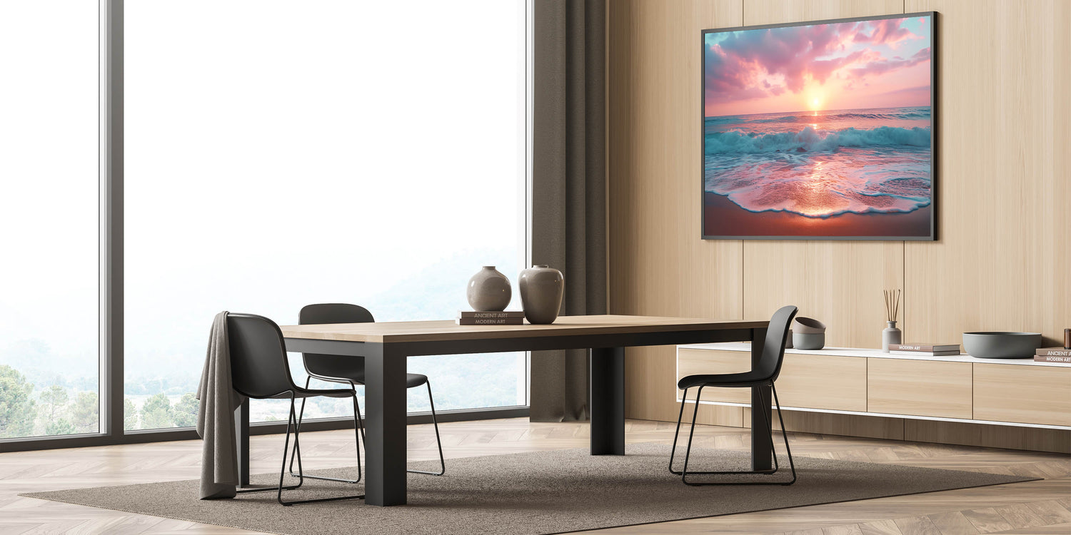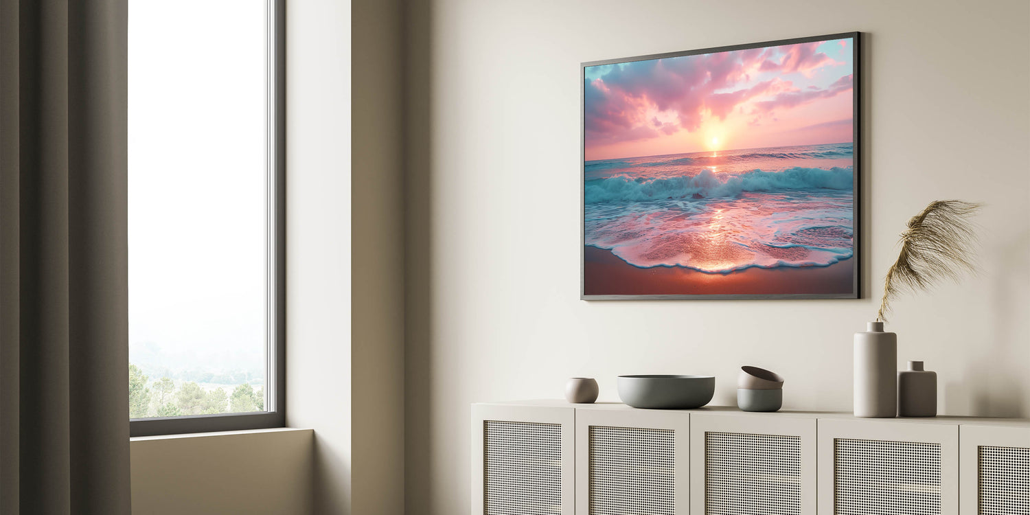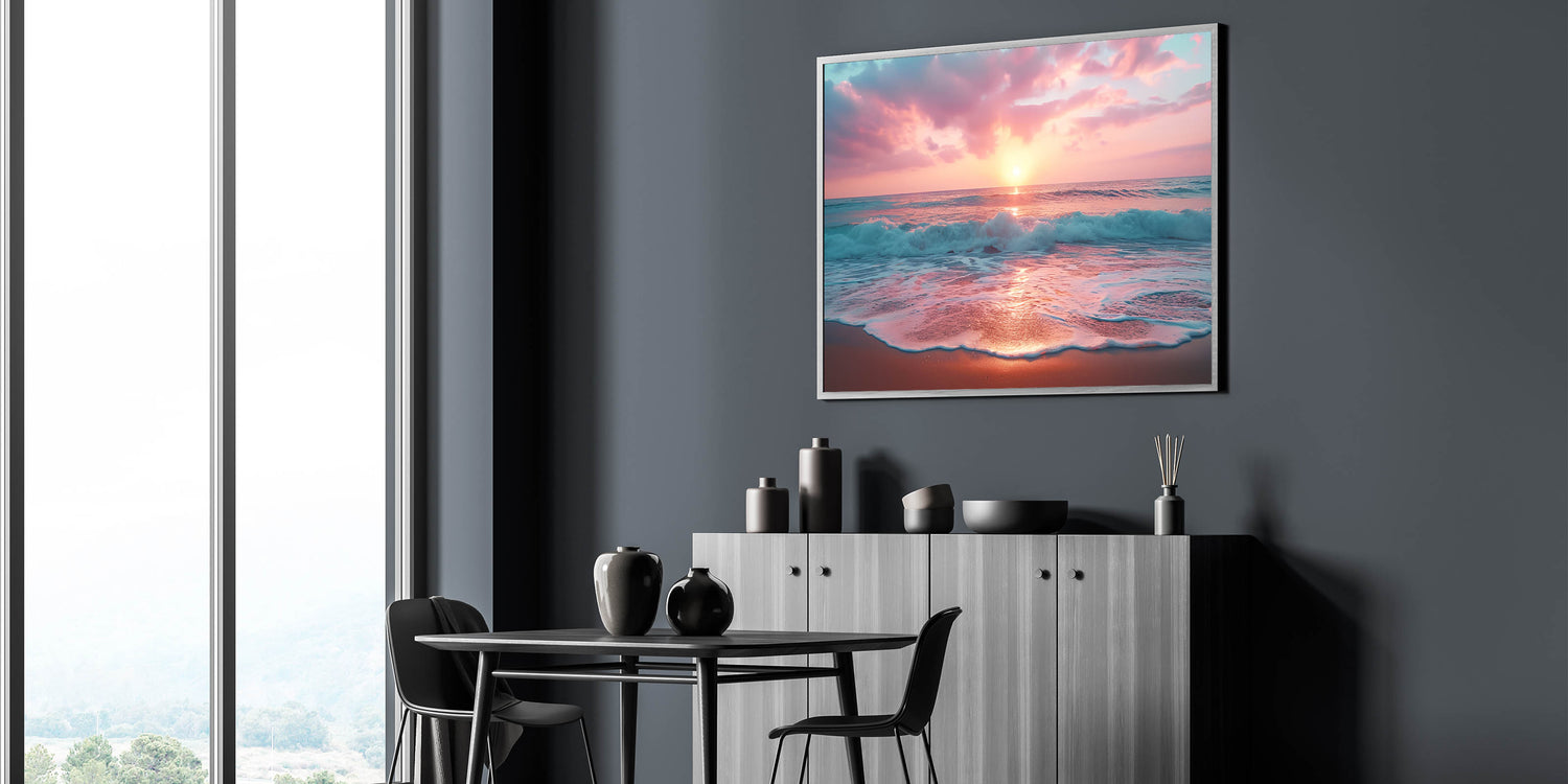- Soothing Color Palette: The soft pastel tones of the sunset, coupled with the gentle waves, create a calming effect, ideal for spaces where relaxation is key.