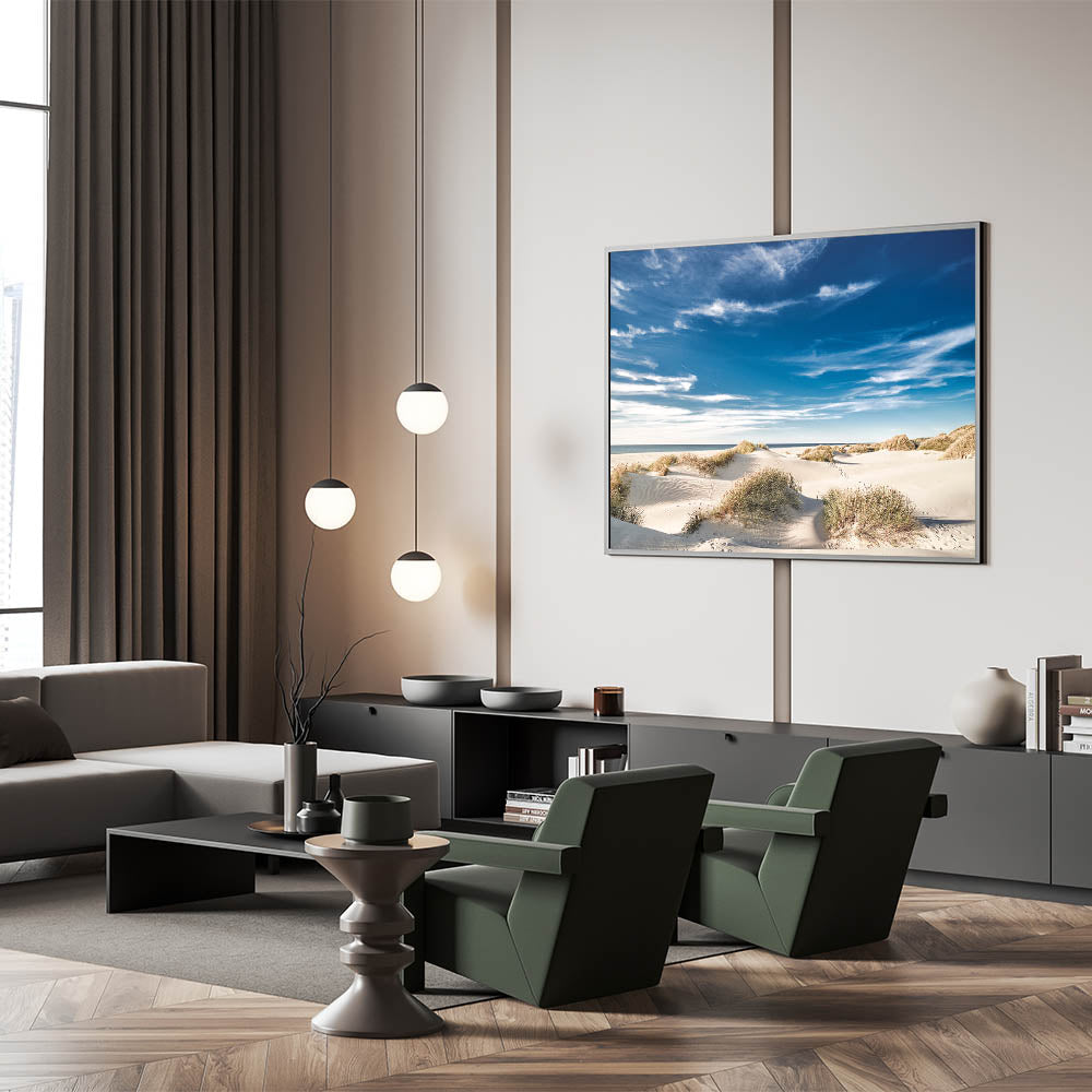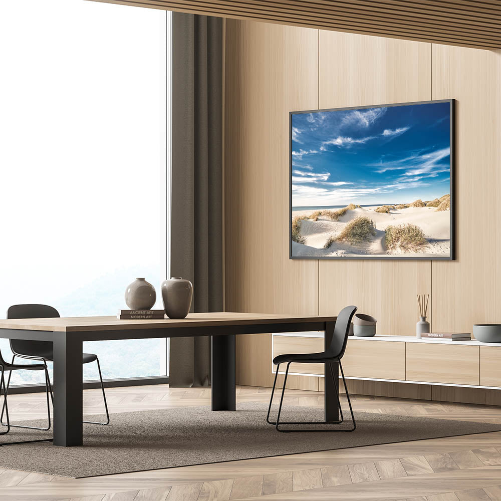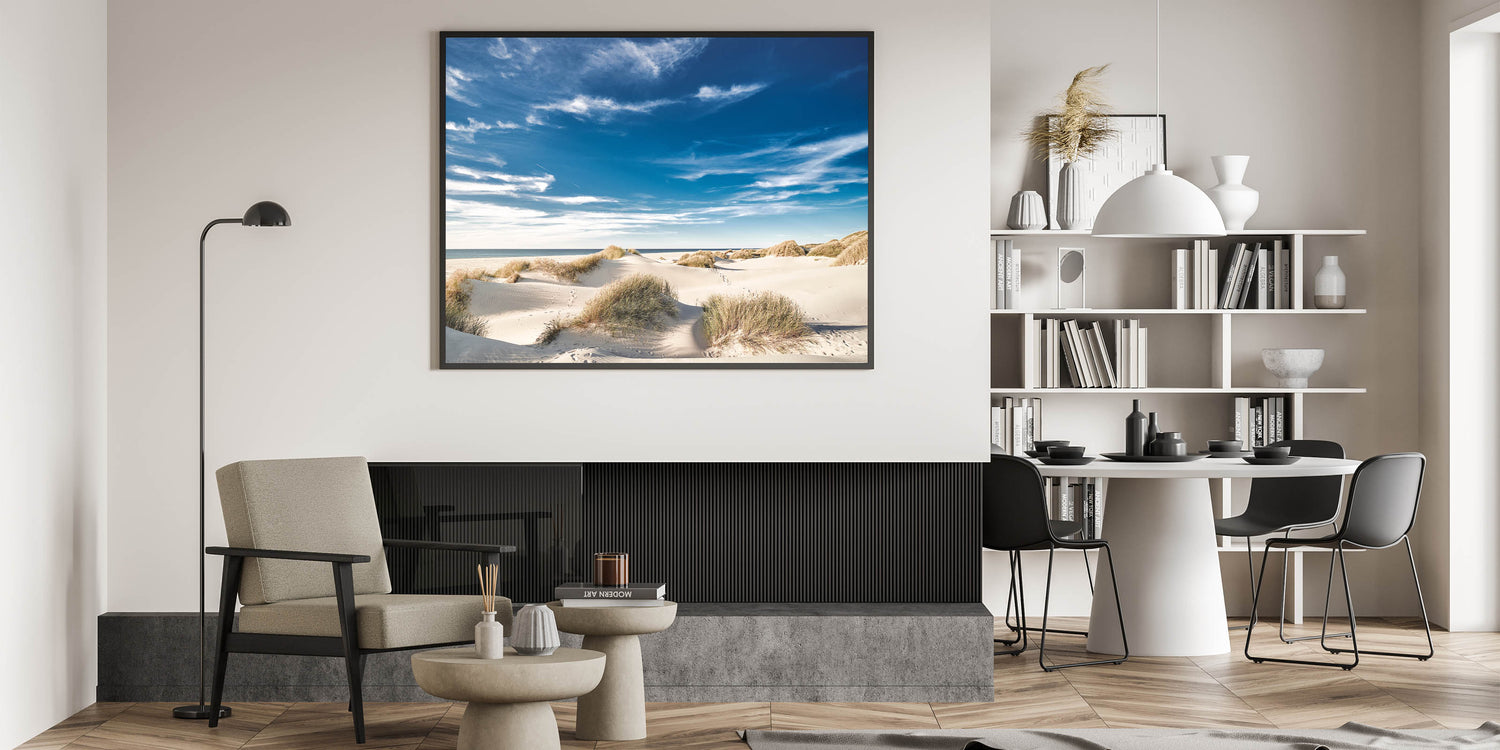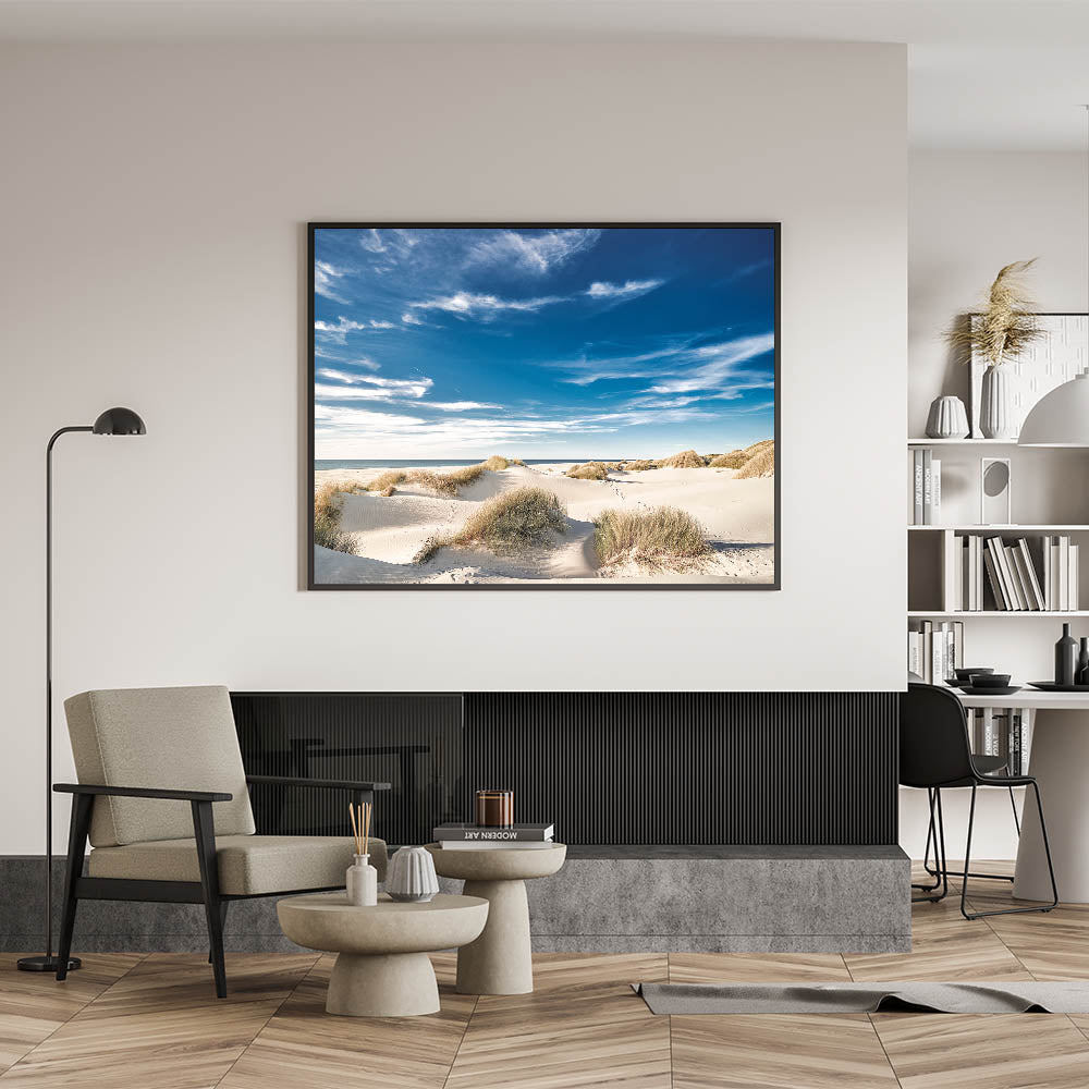 Bring the warmth and tranquility of the beach into your home with this stunning coastal dunes canvas art. The bright blue sky, soft white sand, and gently swaying dune grasses create a serene and inviting scene, perfect for adding a touch of coastal charm to any space. This artwork is ideal for beach home decor, making it a wonderful addition to living rooms, bedrooms, or offices.
