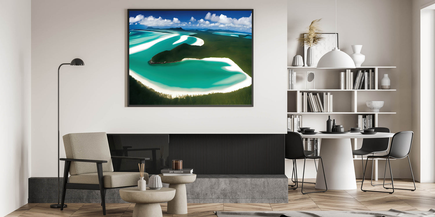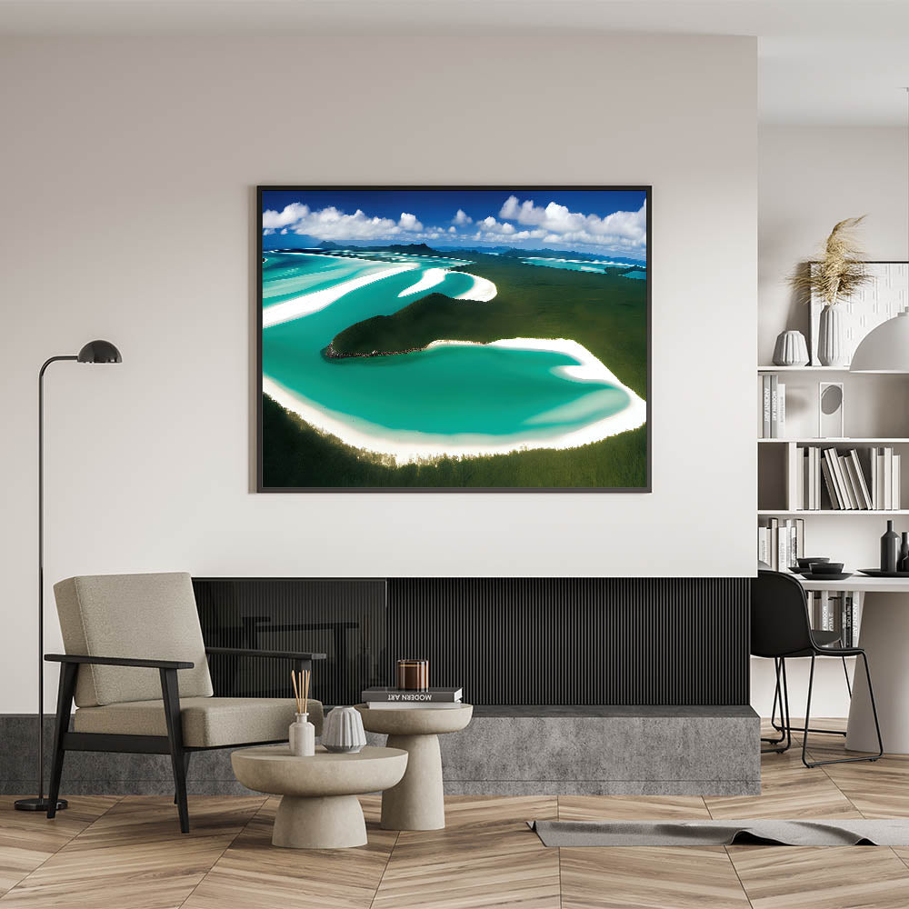 Experience the breathtaking beauty of nature with this sweeping aerial view of a pristine coastline. The vibrant turquoise waters winding through lush greenery and the soft white sands create a mesmerizing pattern that evokes peace and serenity. This artwork is perfect for anyone looking to bring the expansive beauty of the coast into their home, offering a daily escape to a place of tranquility and natural wonder.
