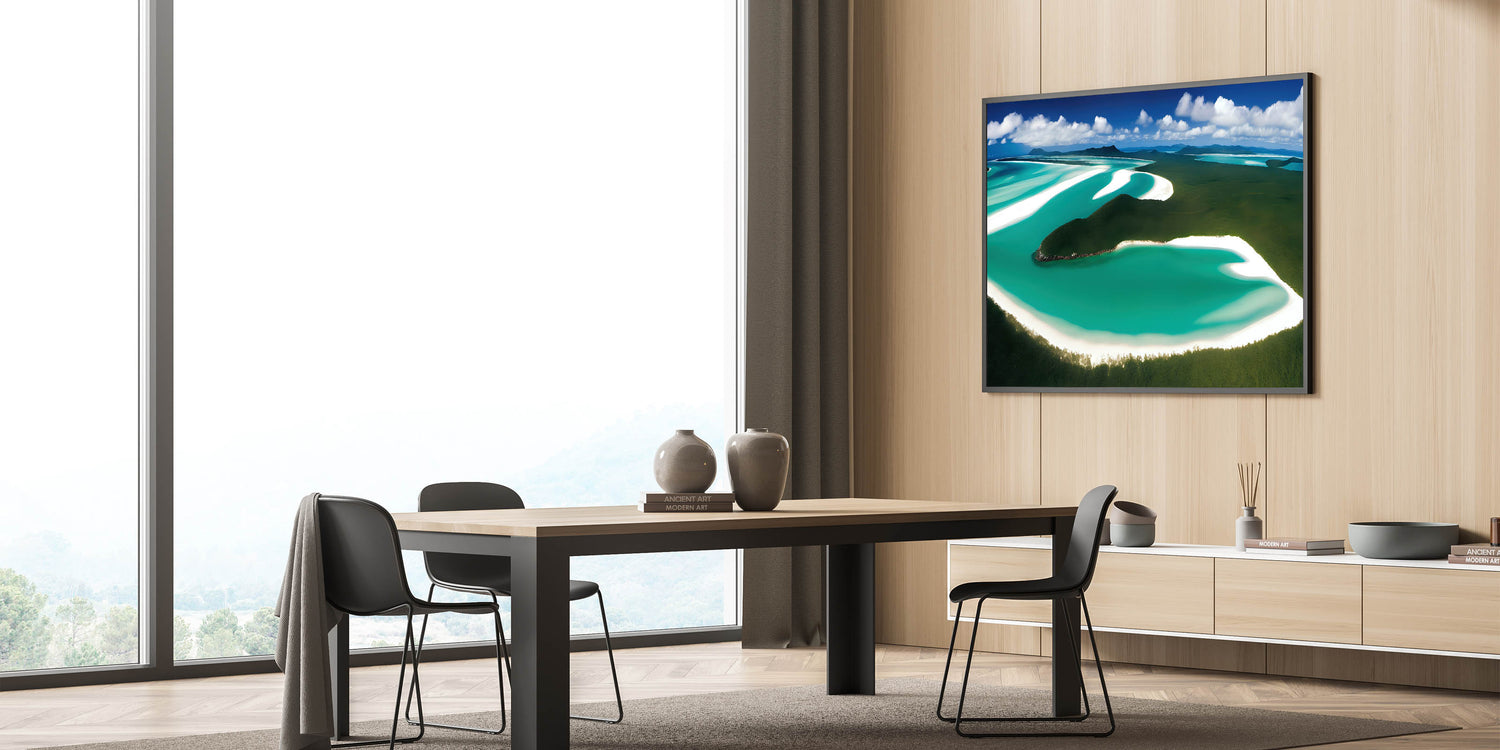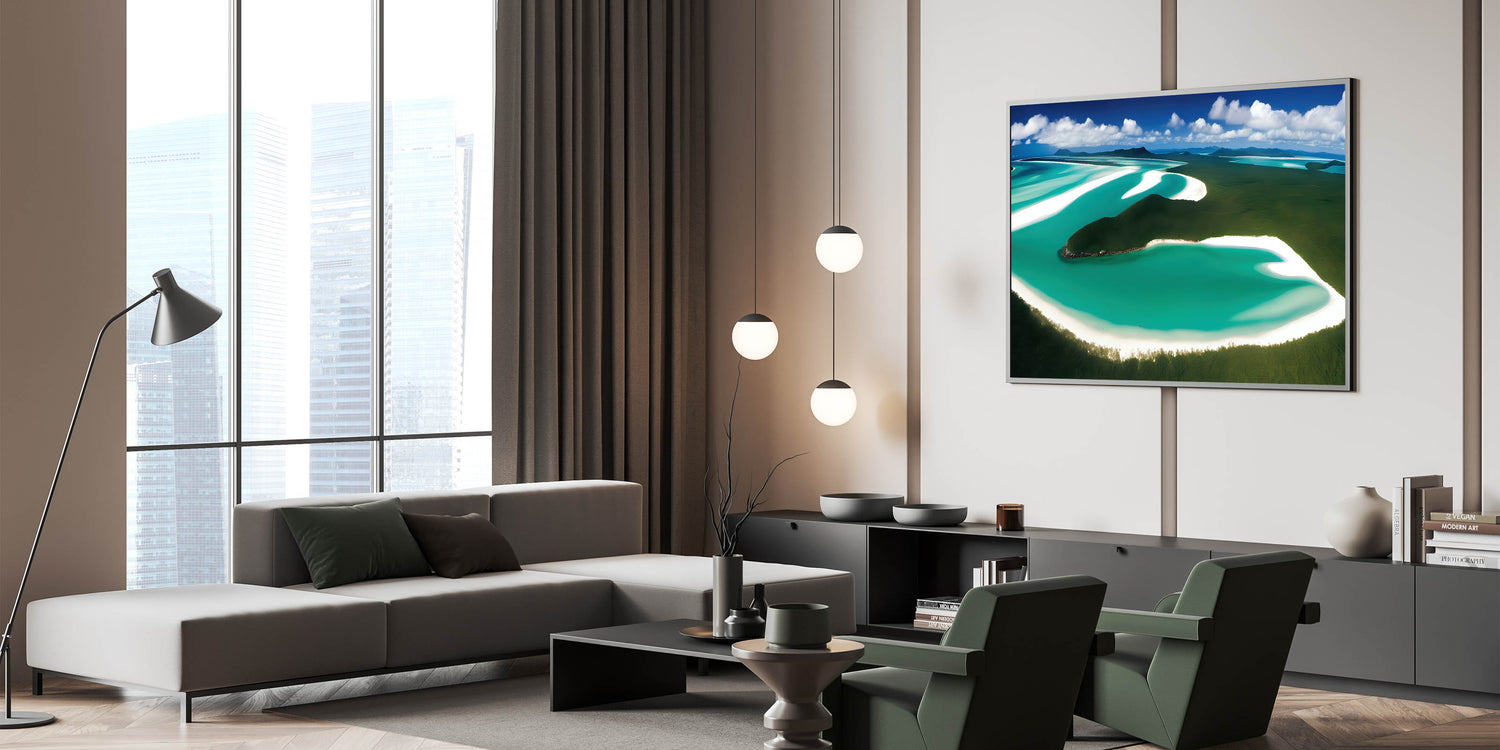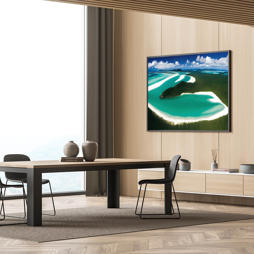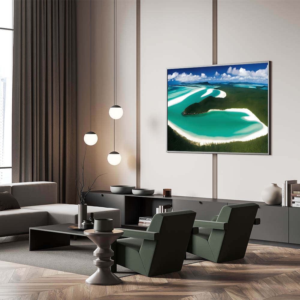 - Vivid and Natural Colors: The rich greens and blues of the landscape are complemented by the soft whites of the sand, creating a calming and harmonious effect, ideal for enhancing living rooms, offices, or bedrooms.