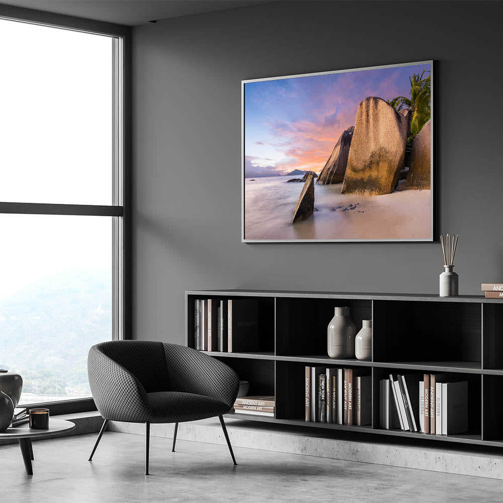 • Rich, Calming Colors: The warm hues of the sunset combined with the earthy tones of the rocks create a soothing atmosphere.