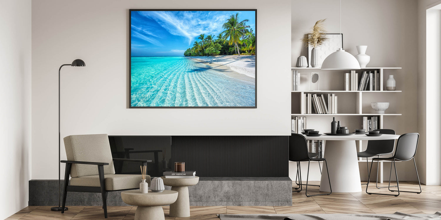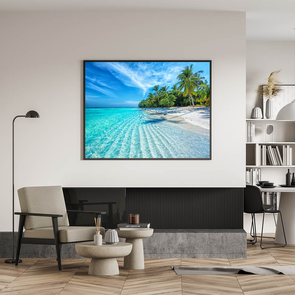 Elevate your interior with this breathtaking depiction of a tropical beach, bringing the warmth and tranquility of the seaside into your living space. Whether you’re looking to complete a coastal theme or simply add a touch of the exotic to your decor, this beach photography print is an excellent choice.