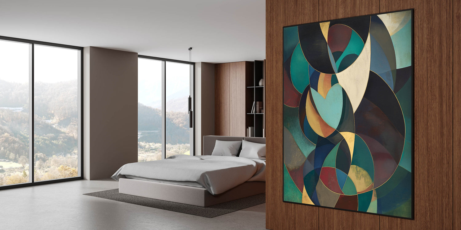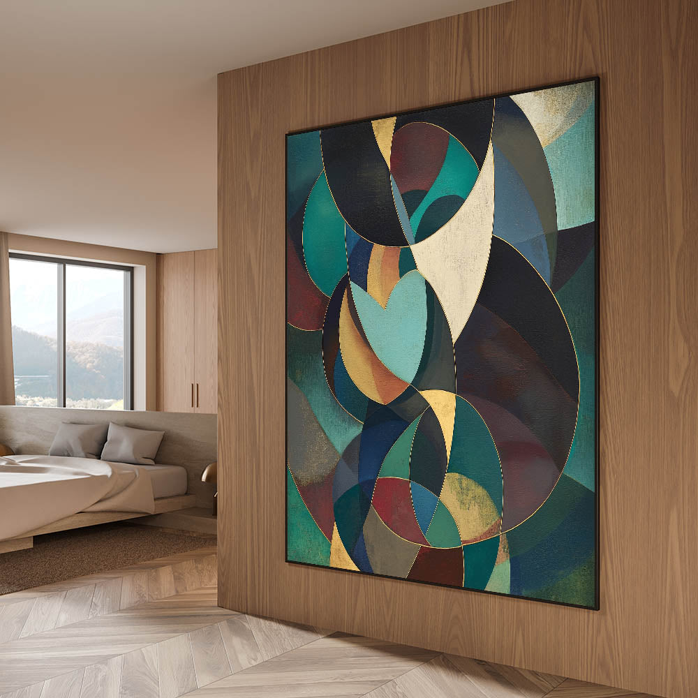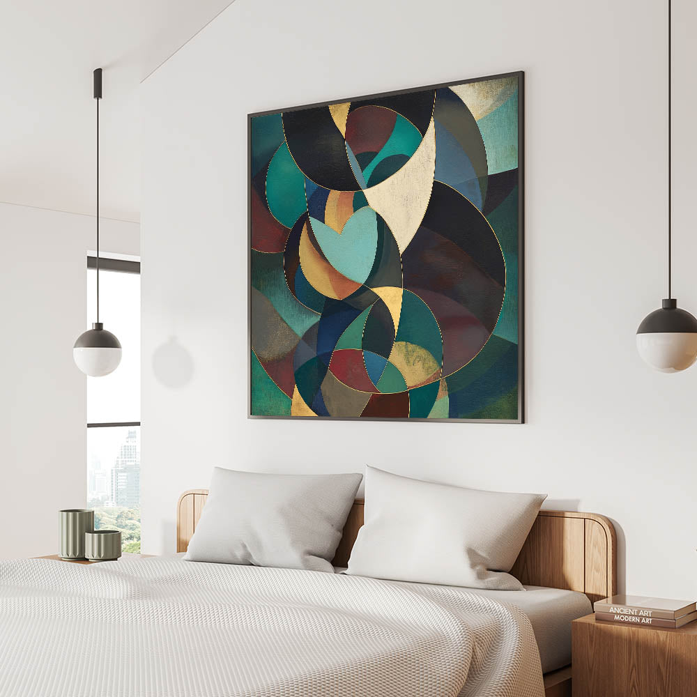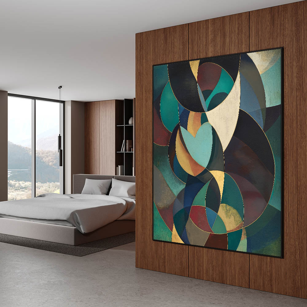 Bring a touch of elegance and vibrancy to your bedroom with this abstract geometric bedroom wall art, featuring a mesmerizing composition of teal, gold, navy blue, and burgundy. The fluid yet structured design creates a dynamic focal point, making it an eye-catching addition to modern and contemporary interiors. This customizable bedroom wall art seamlessly blends bold colors with luxurious gold accents, adding depth and sophistication to your space.