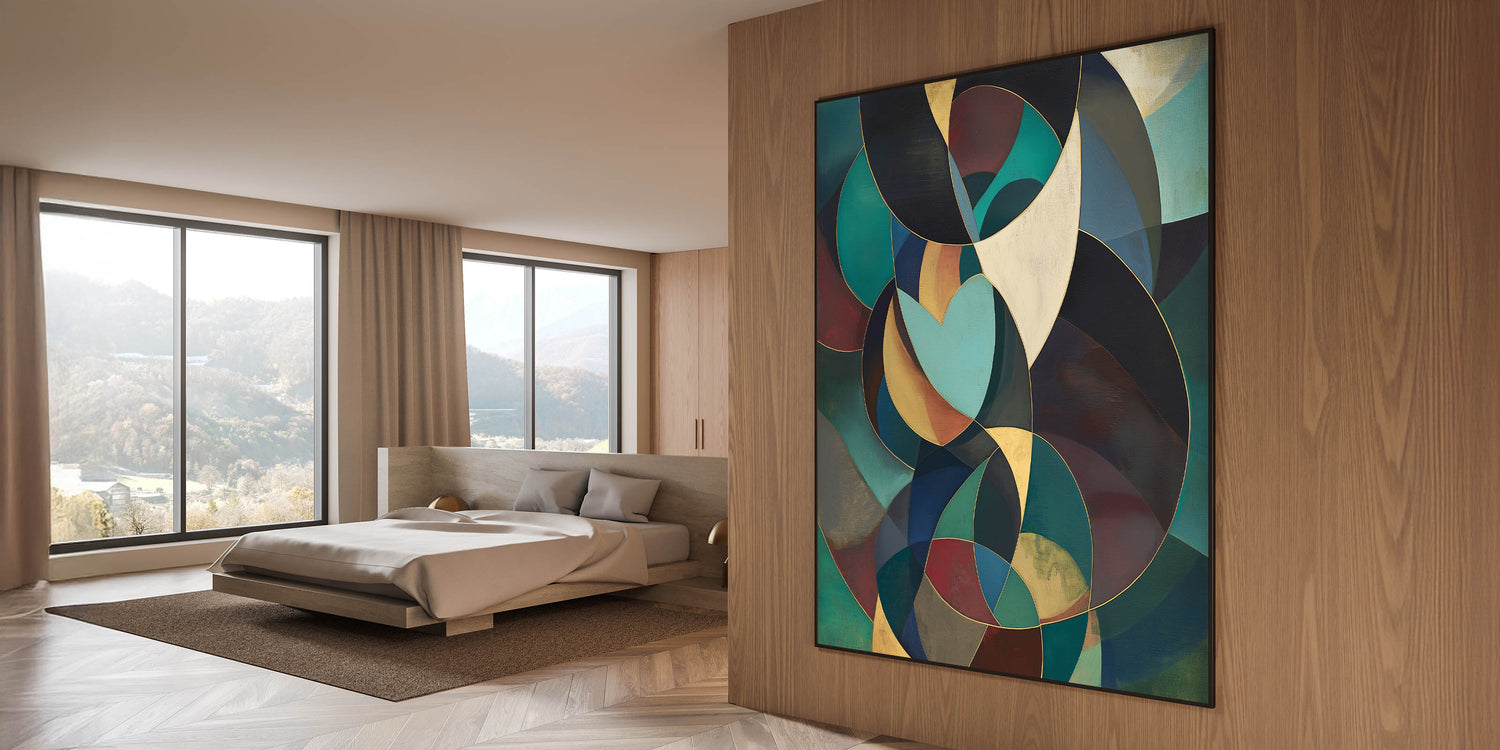 - Unique wall art designs for bedrooms, combining abstract artistry with rich, harmonious colors