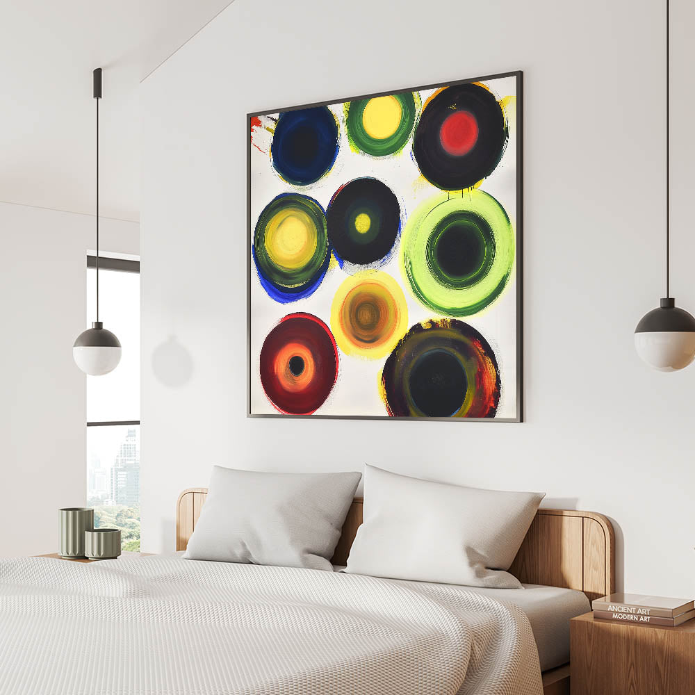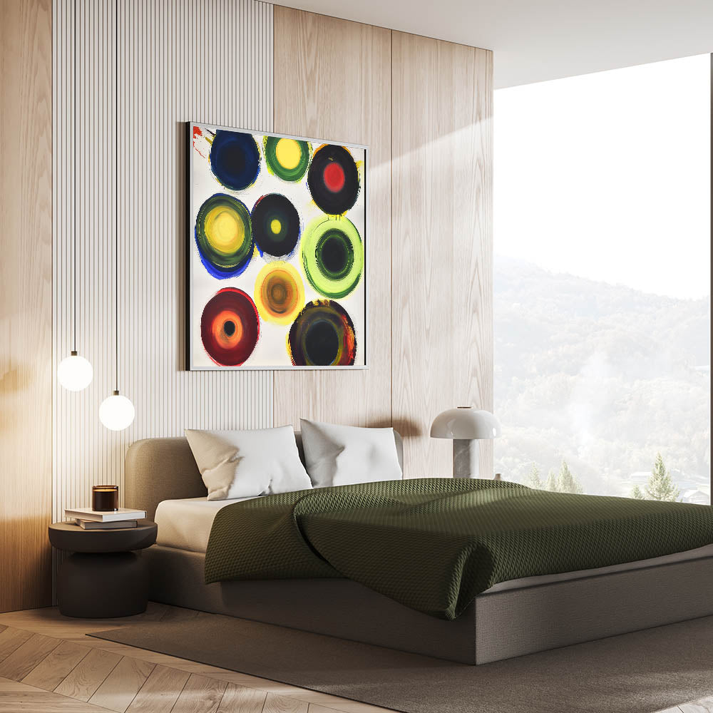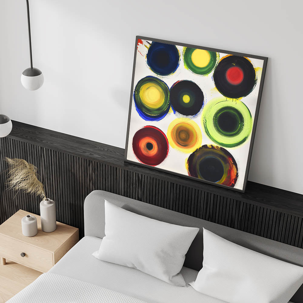 Brighten up your bedroom with this customizable bedroom wall art, featuring a vibrant abstract design with bold multicolor circular patterns. This dynamic composition brings energy and personality to any modern, contemporary, or eclectic interior. Whether displayed as large bedroom wall décor or a framed bedroom art piece, this lively artwork adds a striking focal point to your space.