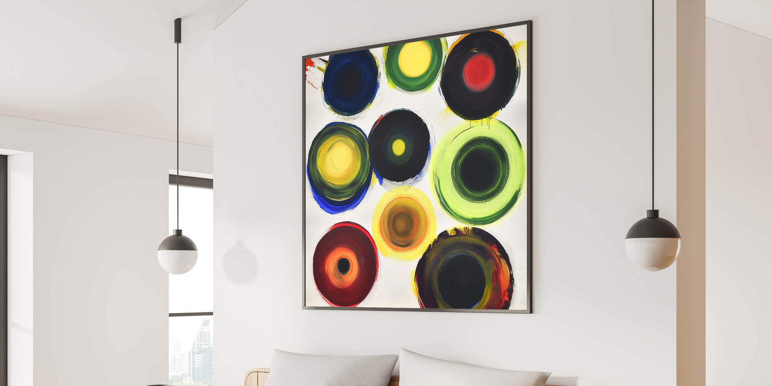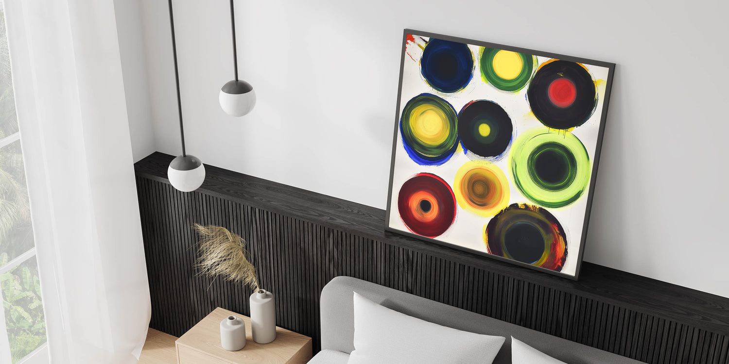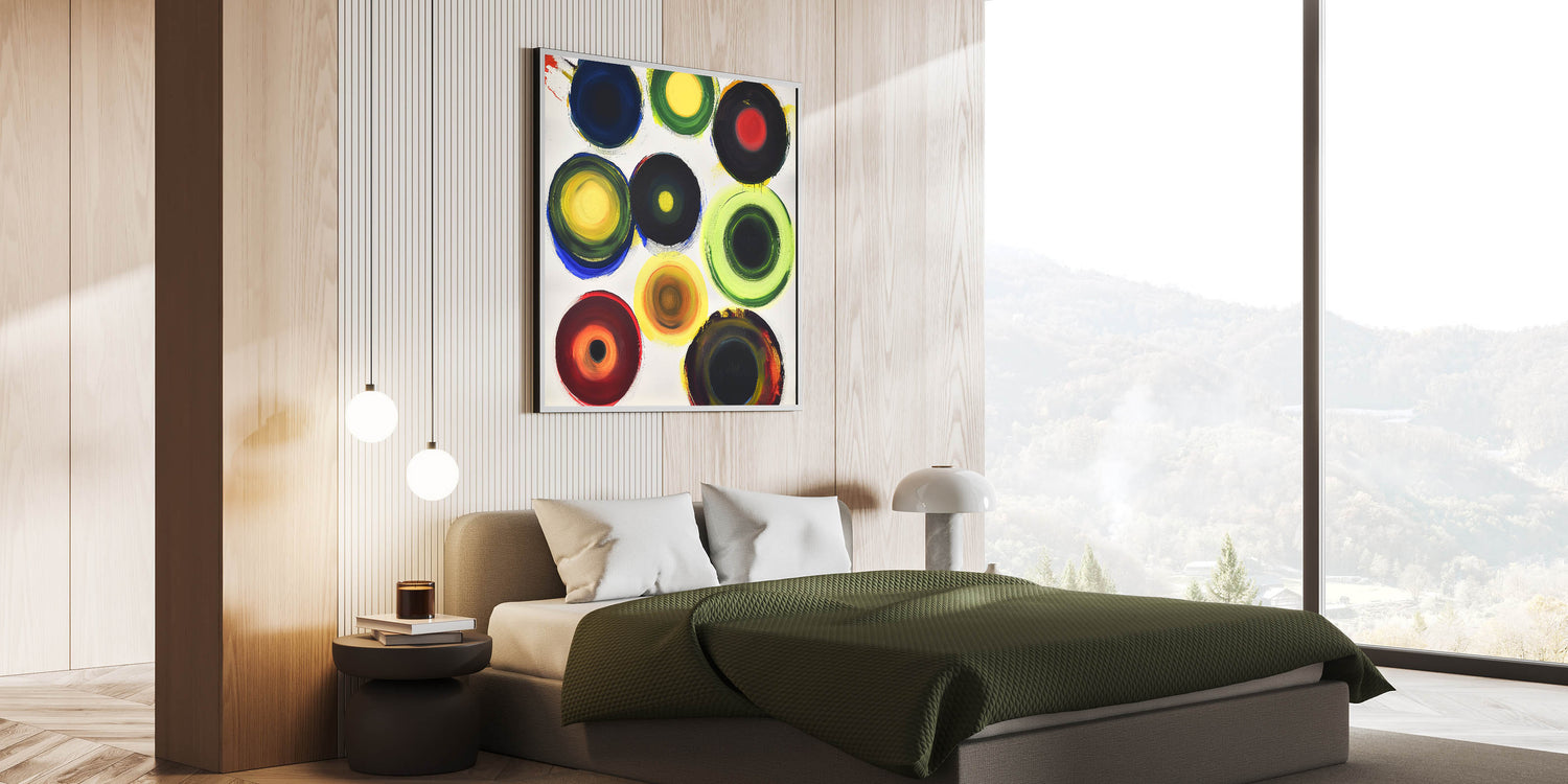 Brighten up your bedroom with this customizable bedroom wall art, featuring a vibrant abstract design with bold multicolor circular patterns. This dynamic composition brings energy and personality to any modern, contemporary, or eclectic interior. Whether displayed as large bedroom wall décor or a framed bedroom art piece, this lively artwork adds a striking focal point to your space.