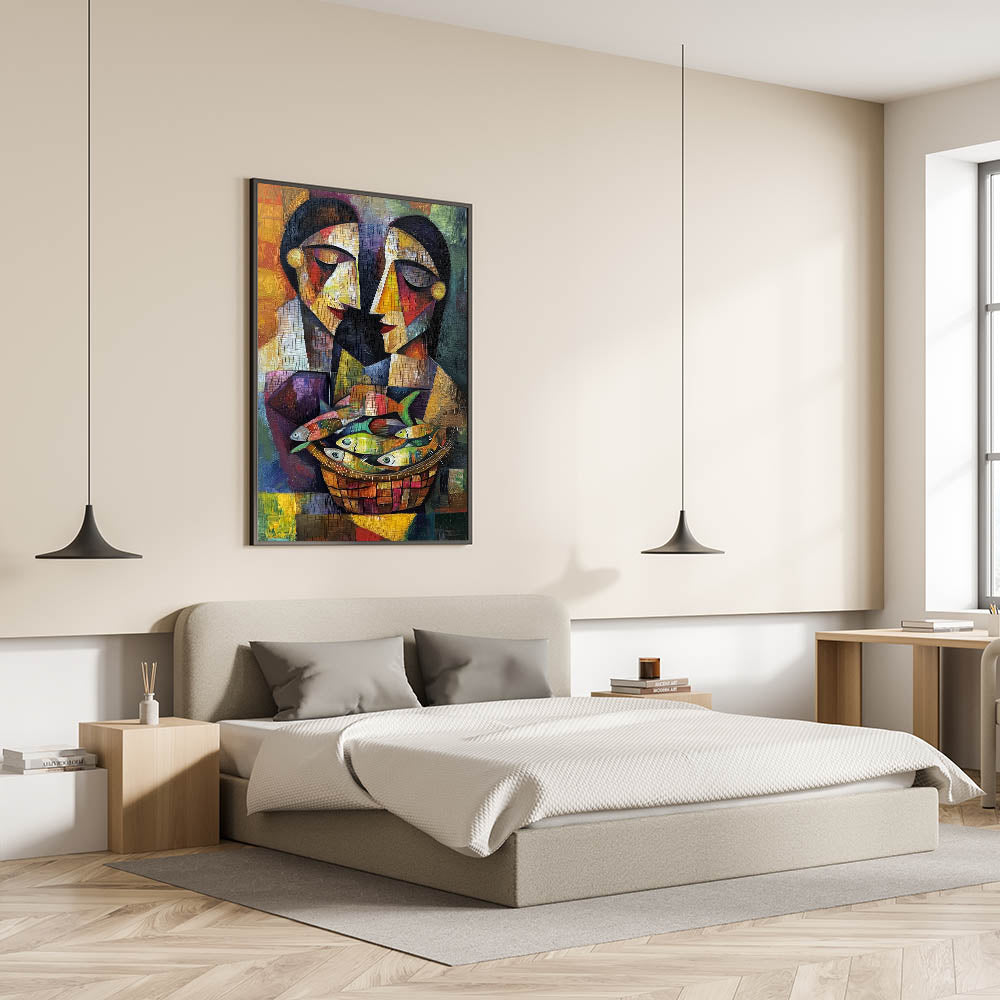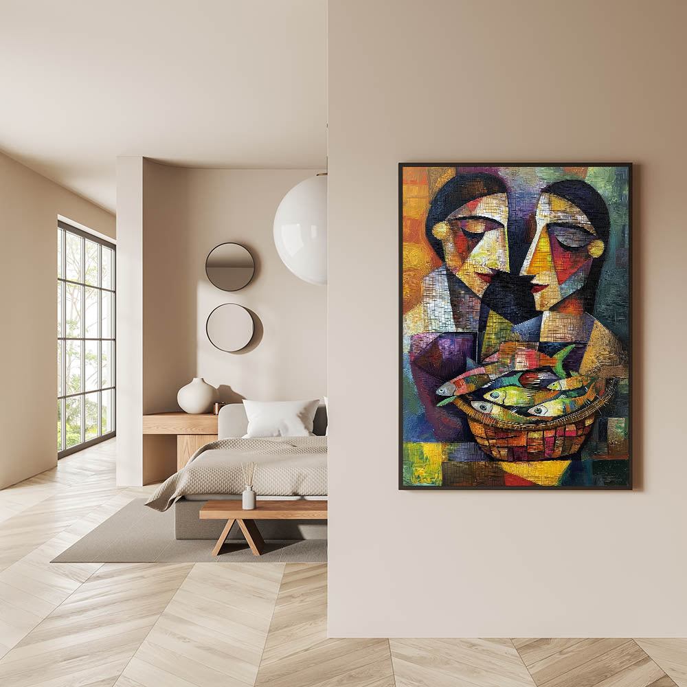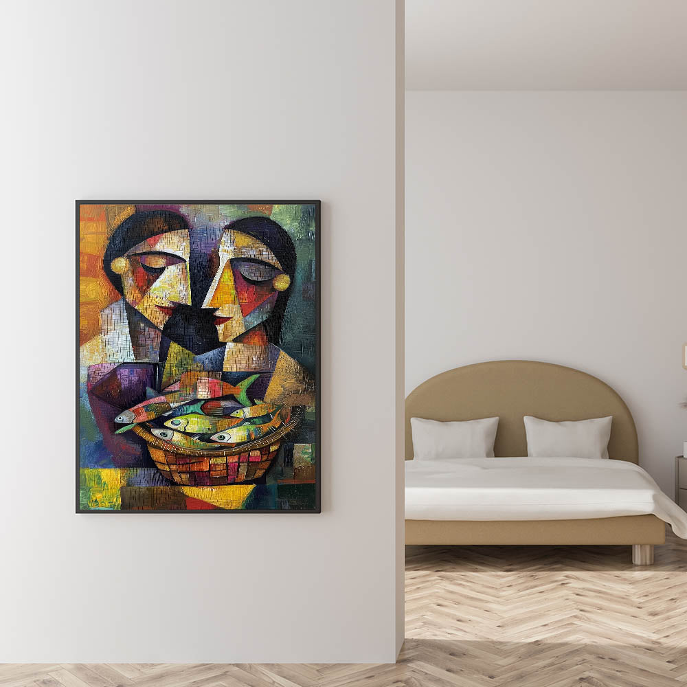 Add a bold and artistic flair to your bedroom with this customizable bedroom wall art, featuring an abstract cubist couple with a basket of fish. This vibrant piece blends warm yellows, deep purples, rich greens, and earthy oranges, creating a striking modern bedroom art centerpiece. Inspired by cubism, the geometric forms and textured strokes add a unique sense of depth and emotion.